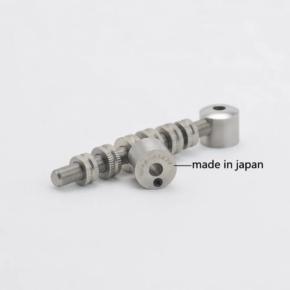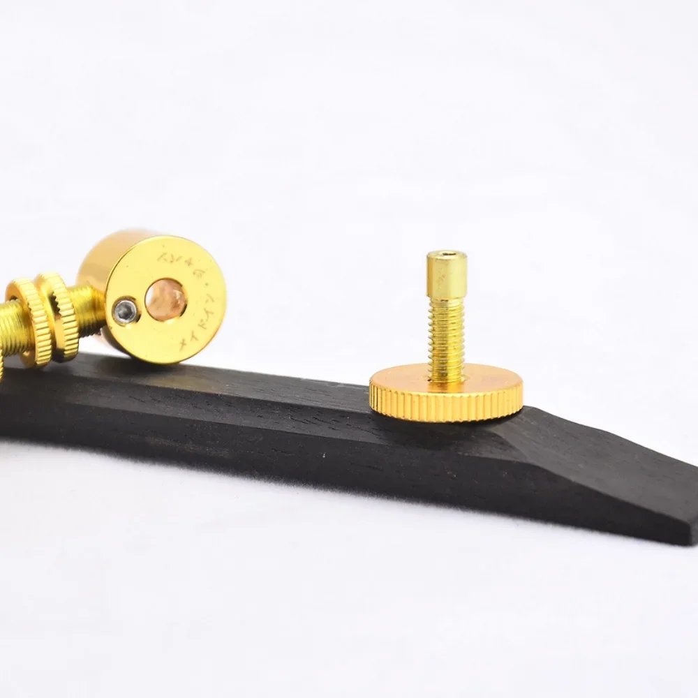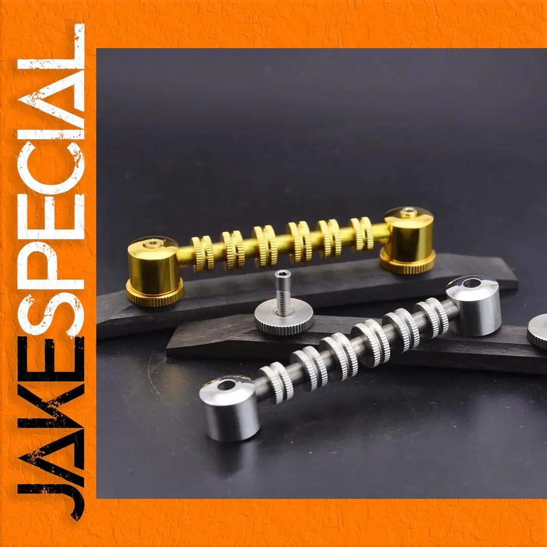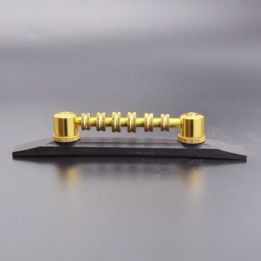 Experience the craftsmanship of this Space Control Adjustable Roller Bridge, designed for guitar enthusiasts who seek perfection in sound and style. Weighing 80g per set, this bridge features one piece with a stunning gold finish and another with a sleek nickel finish, each beautifully mounted on a dark ebony base. The bridges boast evenly spaced cylindrical rollers with textured edges to provide an excellent grip, ensuring precise adjustments for optimal performance. With a model number of 1356 and built in Japan, this product guarantees durability and high-quality construction that complements various guitar styles.