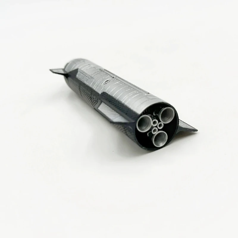 - The conical nose tip and vertical structural lines provide an authentic look, with contrasting black matte fins adding a striking geometric touch to the design.