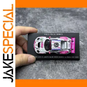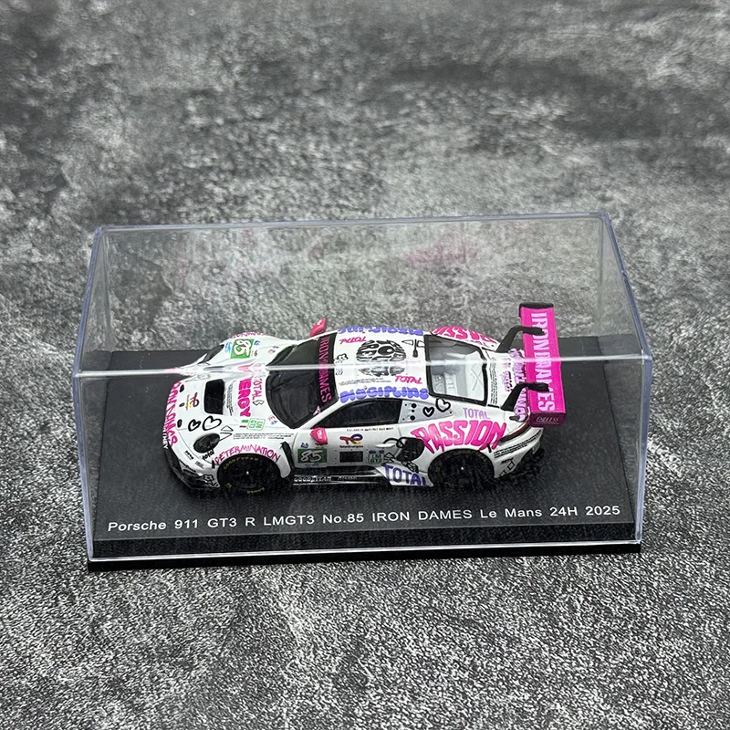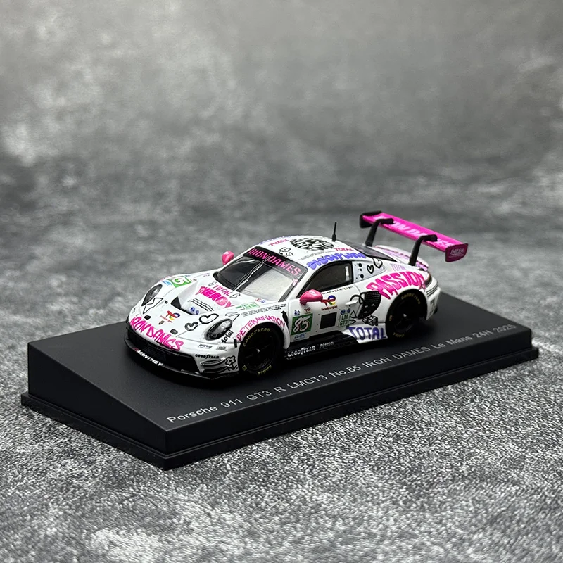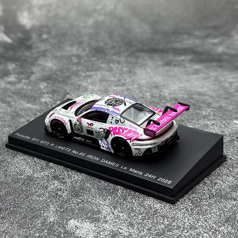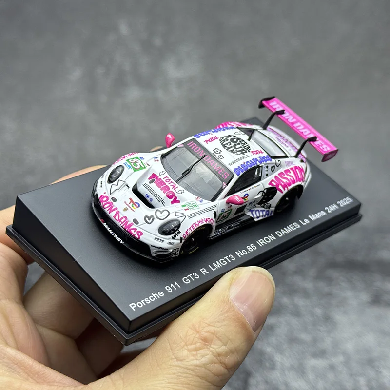 Experience the thrill of racing with this highly detailed diecast metal model of the Porsche 911 GT3 R 2025, crafted in a 1:64 scale. Its vibrant livery showcases a sleek white body covered with energetic multicolored graphics, including sponsor logos and words like “PASSION” and “ENDURANCE,” arranged dynamically across the surface. The bold pink “IRON DAMES” lettering on the rear wing creates a striking contrast. Black accents highlight key features such as the windows, headlights, and side mirrors, adding realism to this racing masterpiece. This collectible captures the essence of a professional race car with fine craftsmanship, realistic proportions, and intricate details, making it a perfect display piece for enthusiasts.