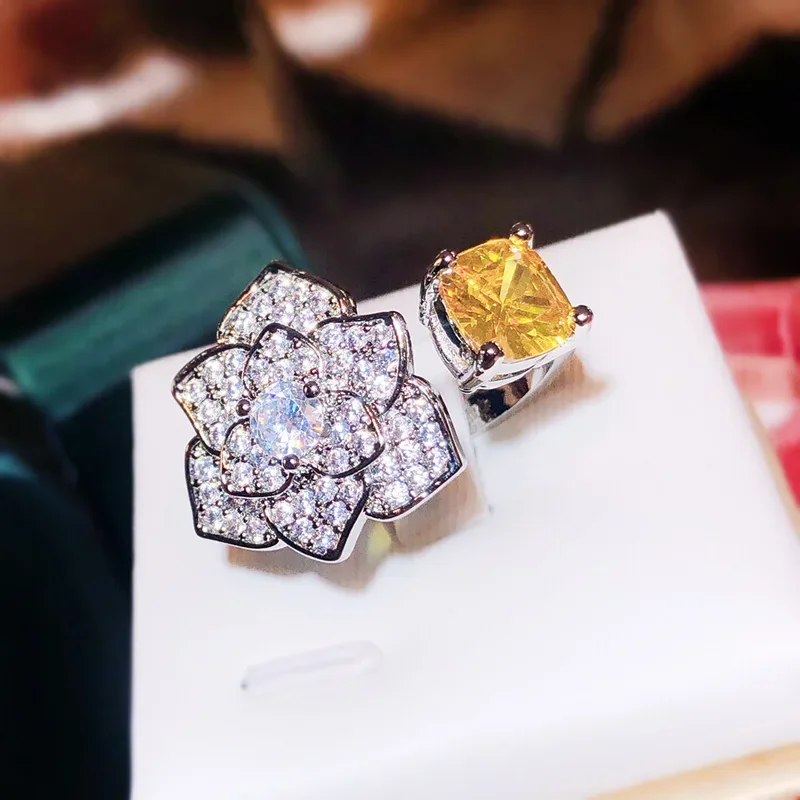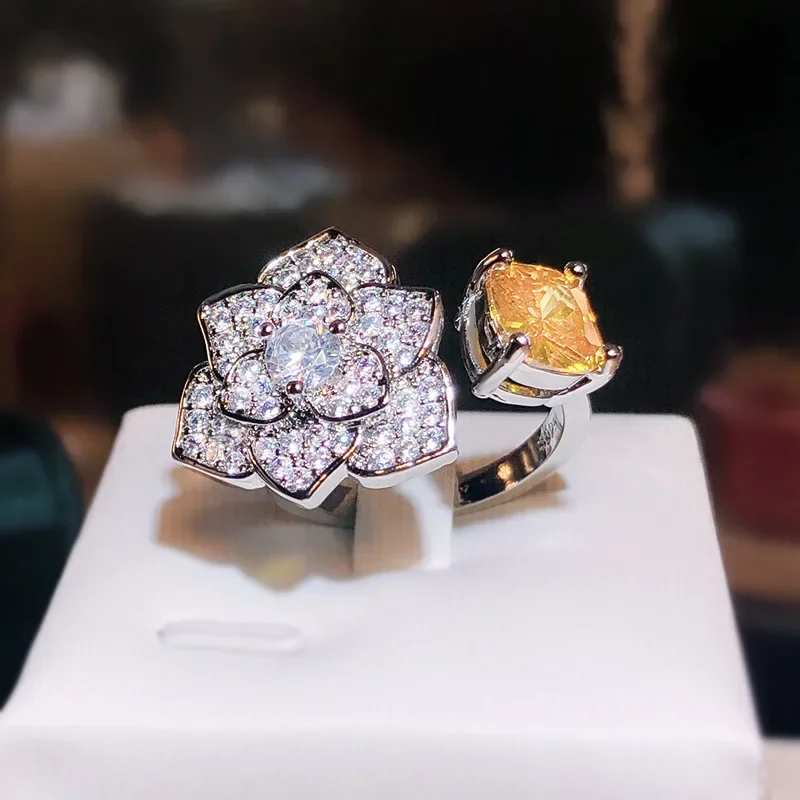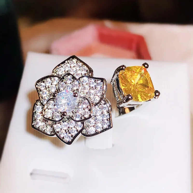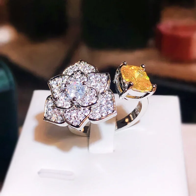 Imagine yourself wearing this exquisite open ring, delicately crafted to highlight a beautiful floral motif. The detailed flower features multiple petals encrusted with tiny, sparkling white zircon stones arranged in a pavé setting, creating a mesmerizing shimmer. At its center, a larger, clear zircon stone draws attention with its brilliance. On one side, a vibrant yellow zircon accent adds a pop of color and elegance, enhancing the overall floral design. Made from durable 925 sterling silver filled with white gold plating, this ring offers a luxurious and long-lasting finish. Its resizable feature allows a perfect fit, making it suitable for any occasion—whether a wedding, party, or special celebration. This piece is designed to make you feel uniquely beautiful.