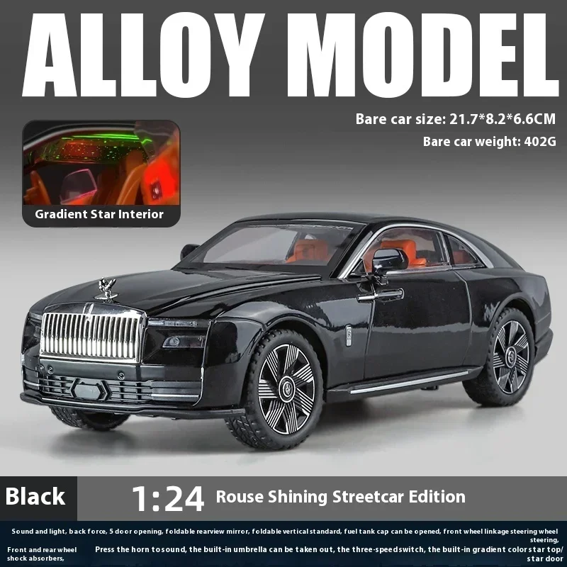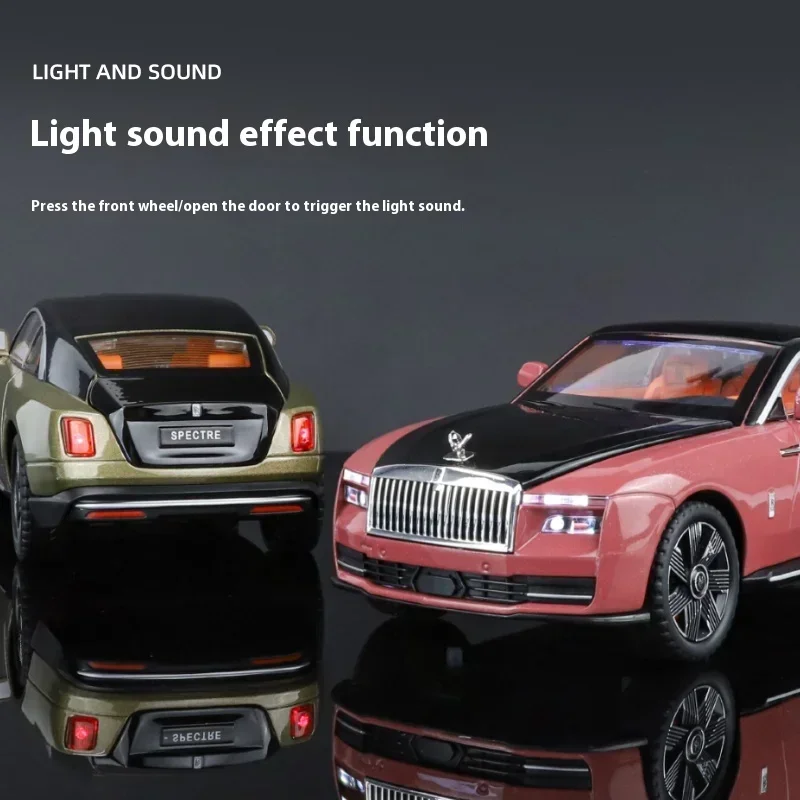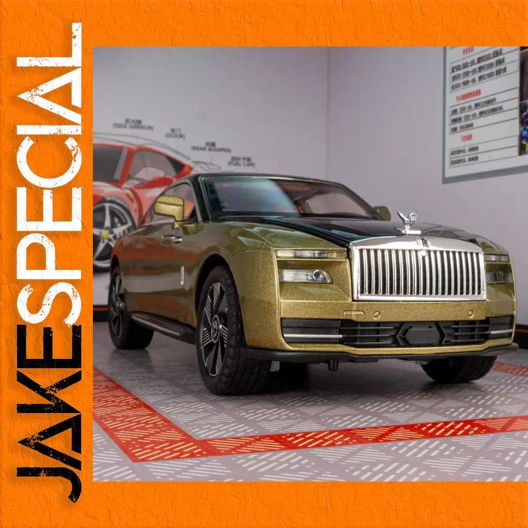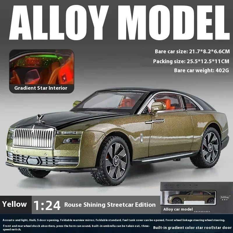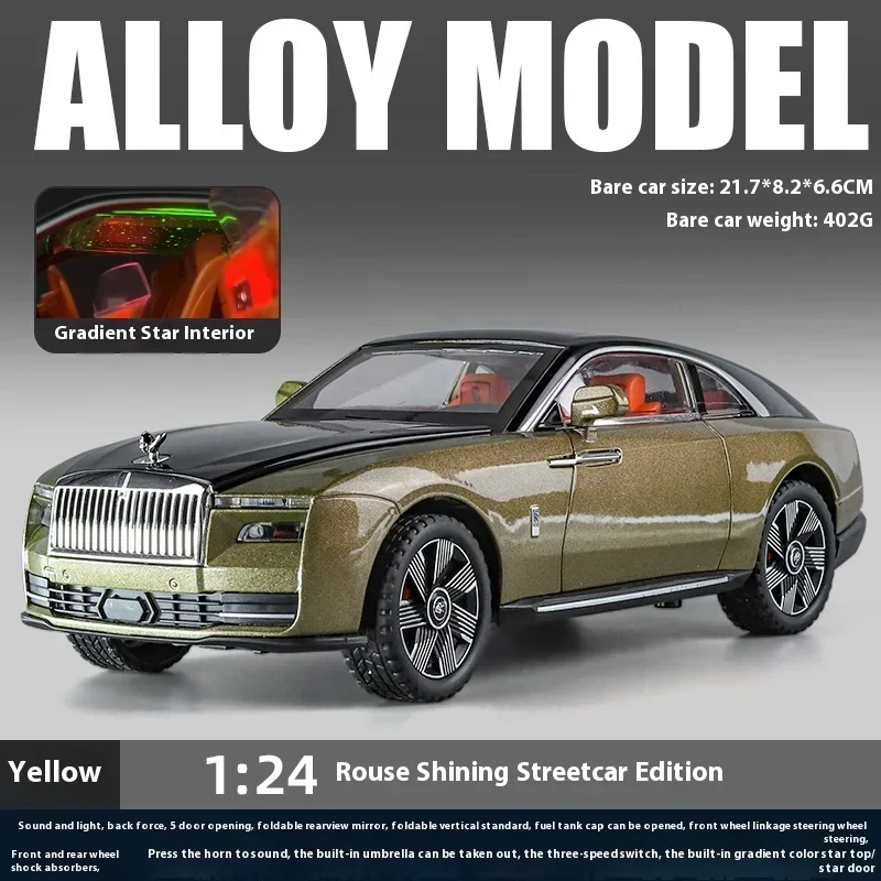 This spectacular 1:24 scale diecast model car is crafted from high-quality metal alloy and showcases a gleaming gold finish that exudes luxury. Featuring an impressive, high-simulation design, it captures smooth contours and an aerodynamic profile, seamlessly blending form and function. A chrome grille with elegant vertical slats enhances the upscale character while intricately detailed headlights provide realism. The model is equipped with a button battery for electric operation, making it an interactive piece for enthusiasts. Ideal for collectors, this car radiates sophistication and attention to detail, perfect for display or as a gift for those who appreciate luxury vehicles.