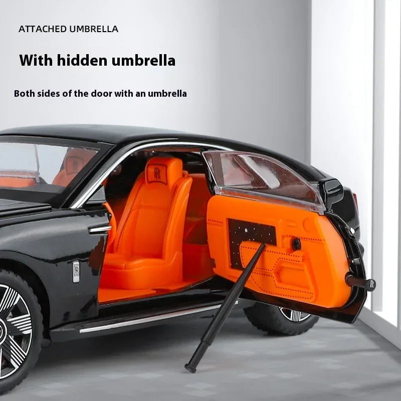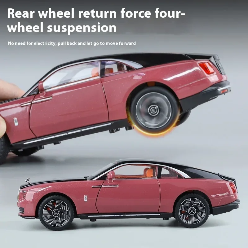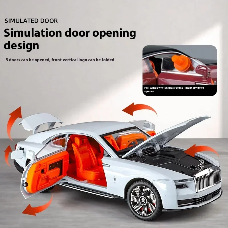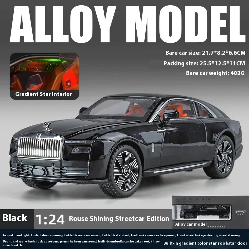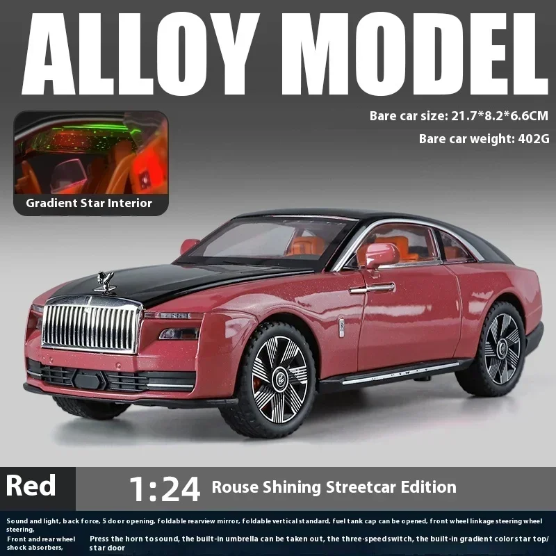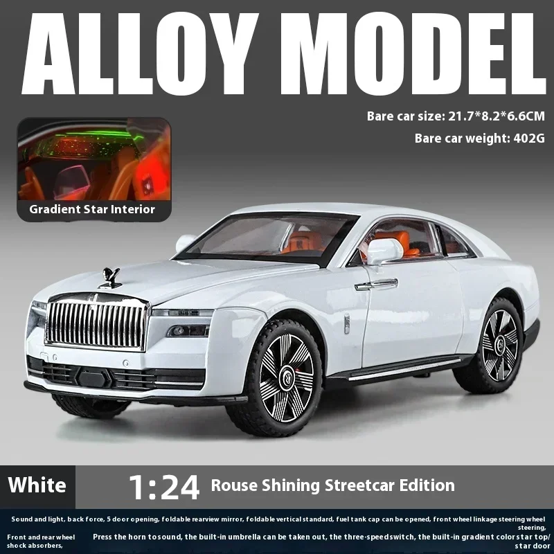 This spectacular 1:24 scale diecast model car is crafted from high-quality metal alloy and showcases a gleaming gold finish that exudes luxury. Featuring an impressive, high-simulation design, it captures smooth contours and an aerodynamic profile, seamlessly blending form and function. A chrome grille with elegant vertical slats enhances the upscale character while intricately detailed headlights provide realism. The model is equipped with a button battery for electric operation, making it an interactive piece for enthusiasts. Ideal for collectors, this car radiates sophistication and attention to detail, perfect for display or as a gift for those who appreciate luxury vehicles.