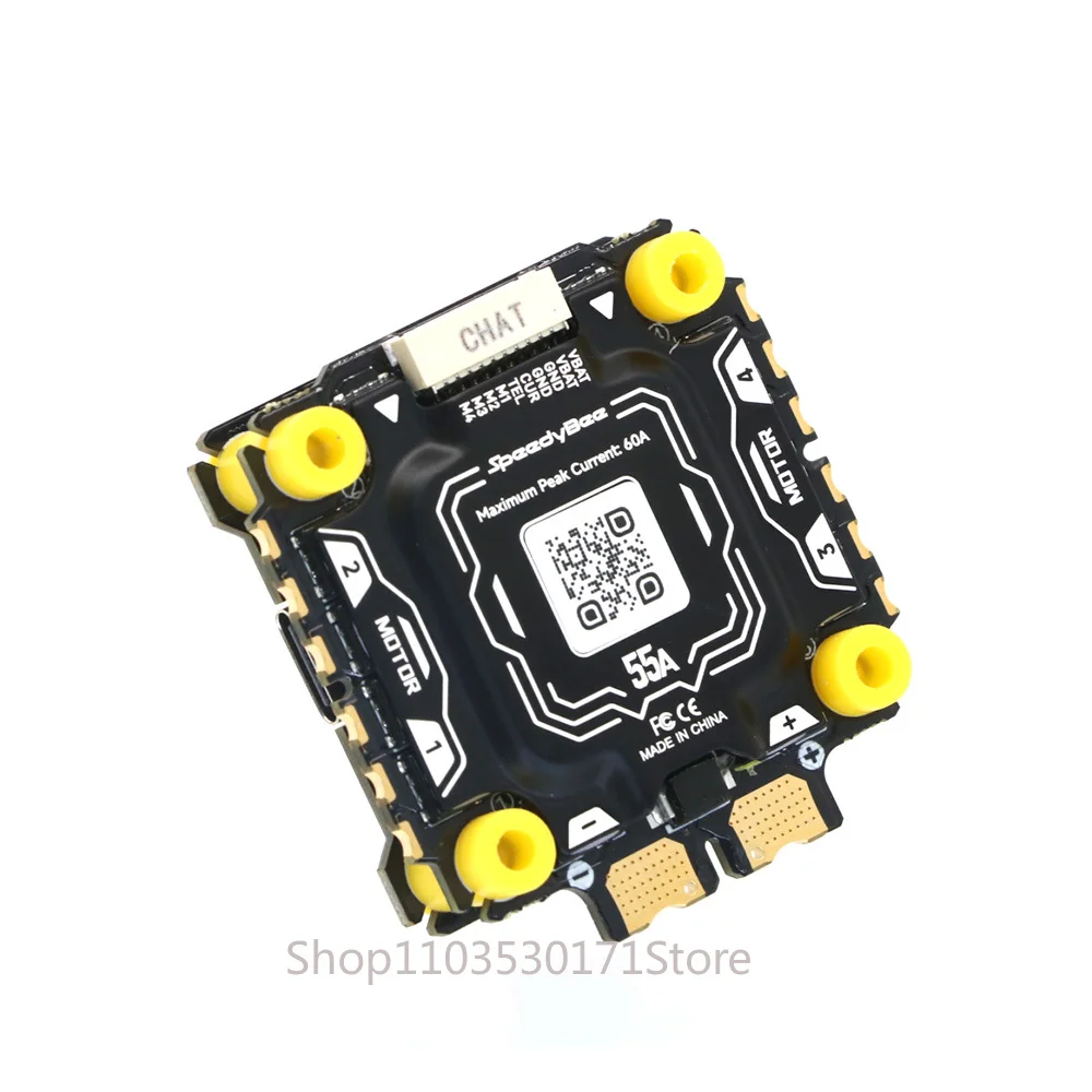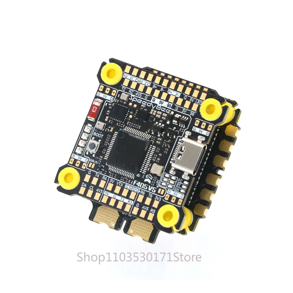 Experience the cutting-edge performance of the Speedybee F405 V5 55A Stack, featuring a sleek black flight controller with white markings and a vibrant yellow silicone-encased connector, designed for high-precision drone applications. Available in two models: F405 V5 Stack PRO and F405 V5 Stack standard, this compact, hexagonal stack combines durability with a modern aesthetic, emphasizing clarity with gold-plated contact pads for secure connections. Made from durable composite material, it’s perfect for remote control vehicles and aircraft, offering reliable performance for users aged 14 and up. Please note, this non-electrical component does not include batteries or chargers, ensuring ease of integration into your high-performance drone system.