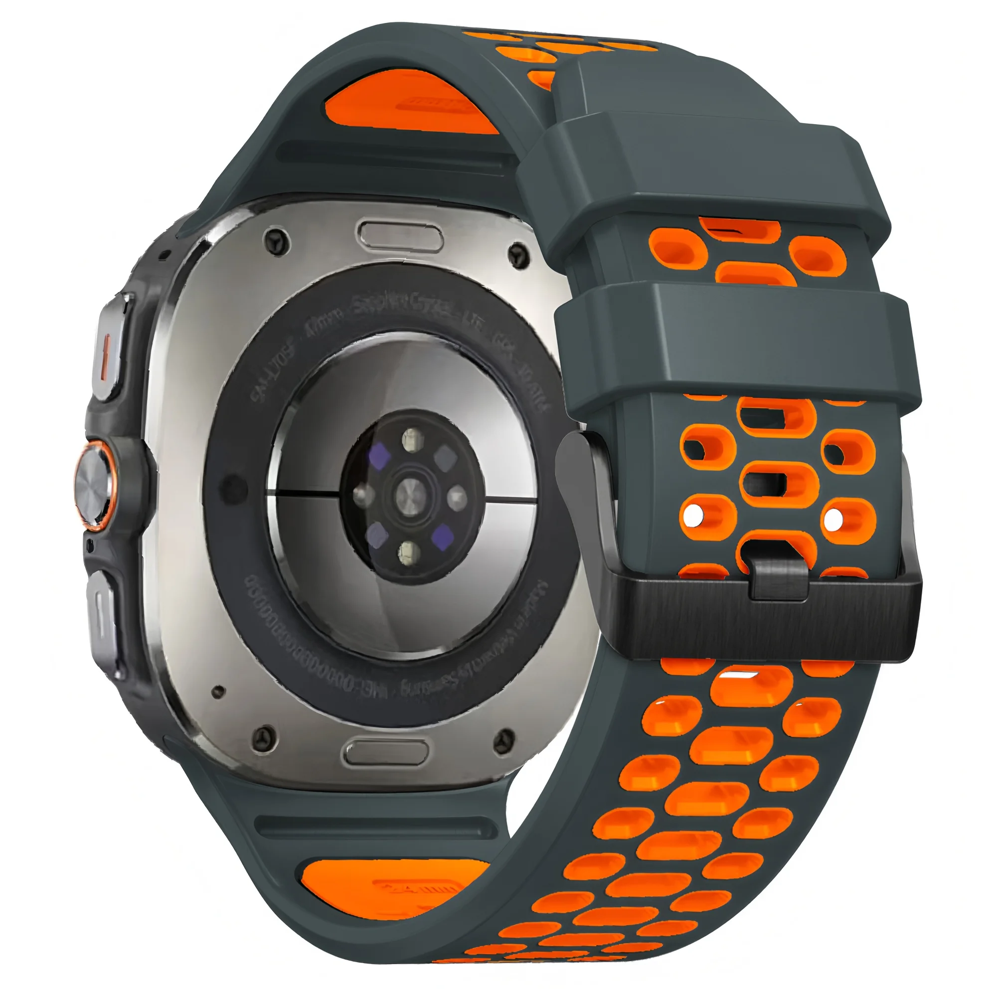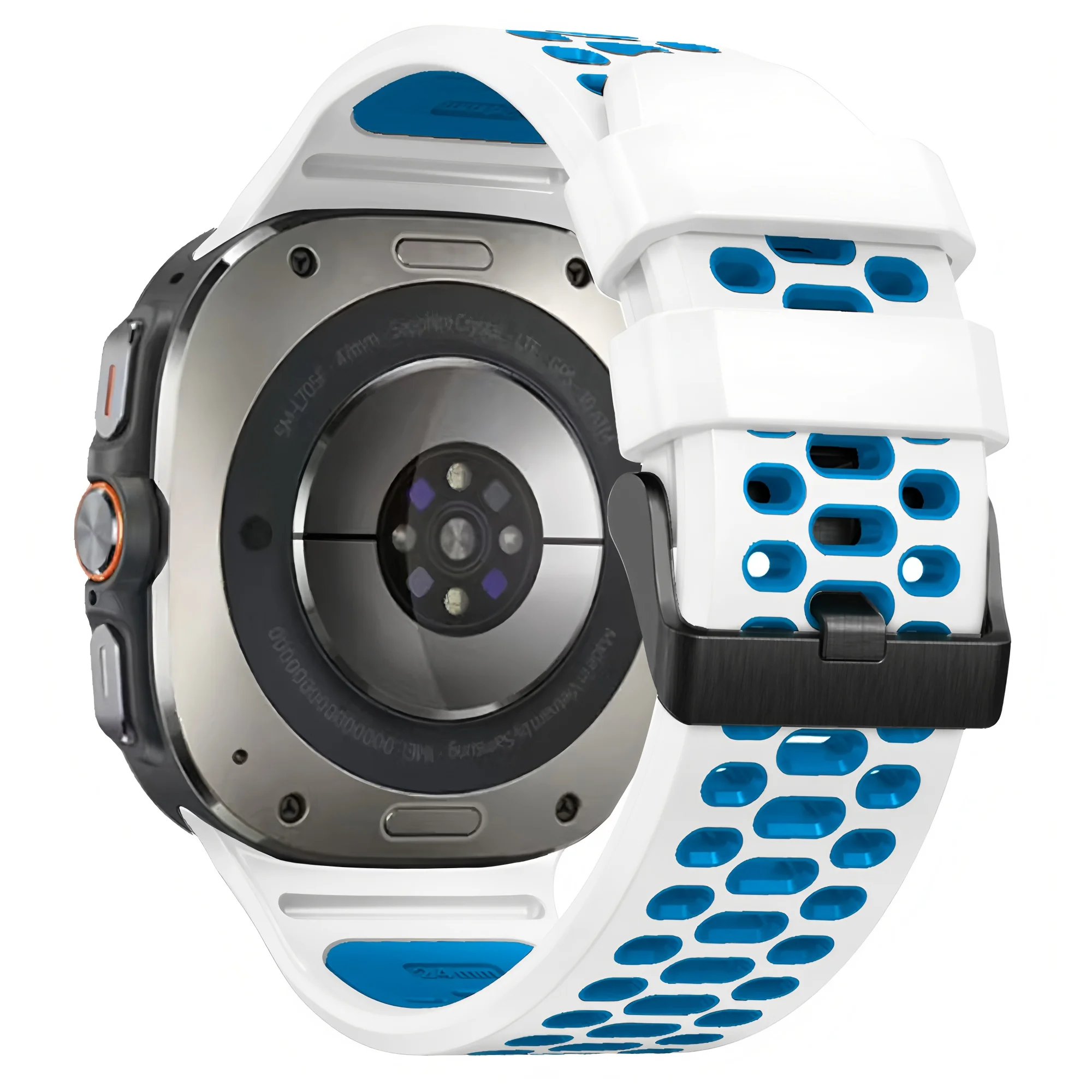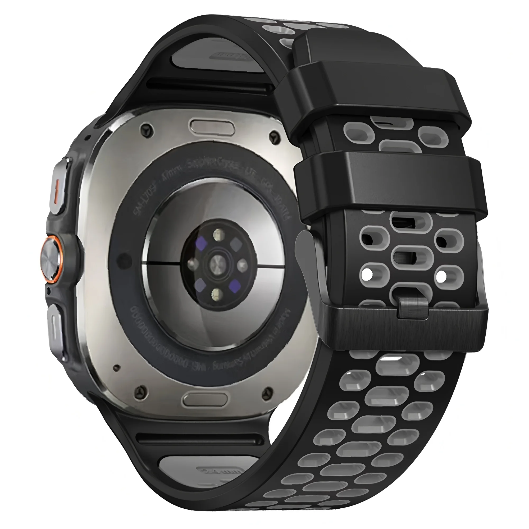 The Sport Two Tone Breathable Silicone Strap for Samsung Galaxy Watch Ultra is the perfect blend of style and functionality. Designed for the Samsung Galaxy Watch Ultra 47mm, this strap boasts a comfortable fit and a sleek modern look. Imagine effortlessly transitioning from workouts to casual outings, all while your wrist feels breathable and secure. With its black buckle clasp, you can trust it to stay in place during your most active days. Upgrade your accessory collection and experience the comfort that comes with a premium silicone strap tailored for your lifestyle.