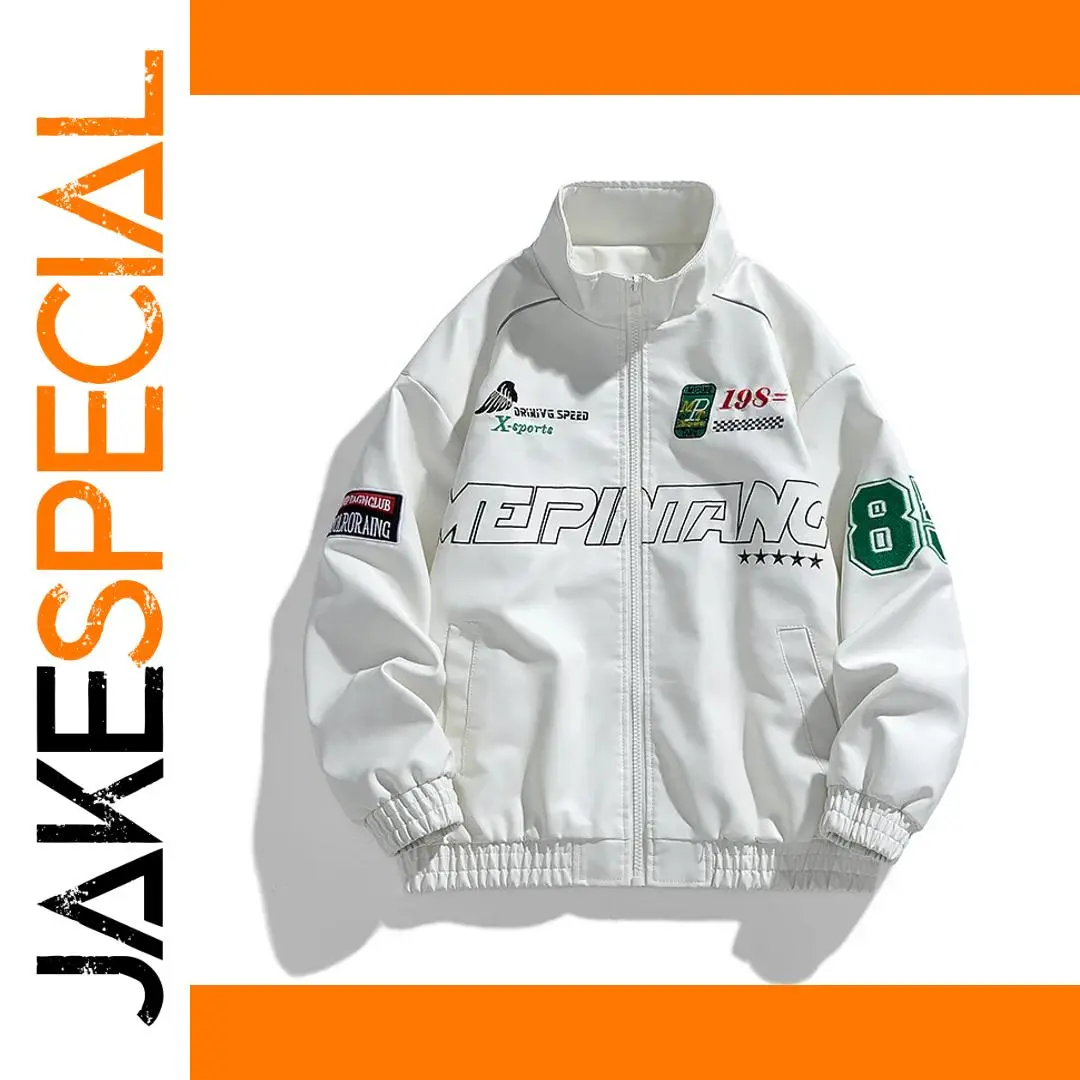 This stylish white jacket embodies a sporty aesthetic that is perfect for casual outings or dynamic streetwear. Crafted from a smooth, durable fabric, it features a full zip closure for easy wear. The stand-up collar adds a modern touch, while the slightly puffed sleeves with elastic cuffs ensure a snug fit. Embellished with bold “MEPITANG” embroidery and unique patches like “198=” with a checkered flag and “DRIVING SPEED” alongside the number “88,” this jacket stands out effortlessly. Ideal for those who embrace a flair for racing themes, this jacket combines comfort with a youthful vibe, making it a must-have addition to your wardrobe.