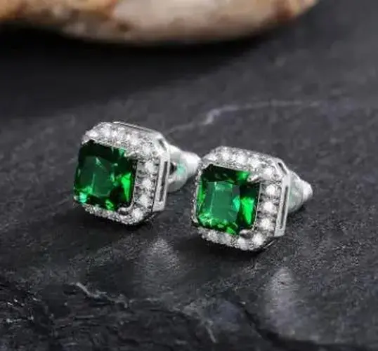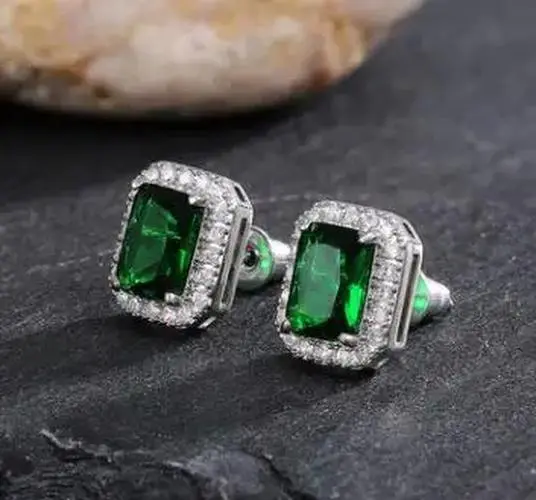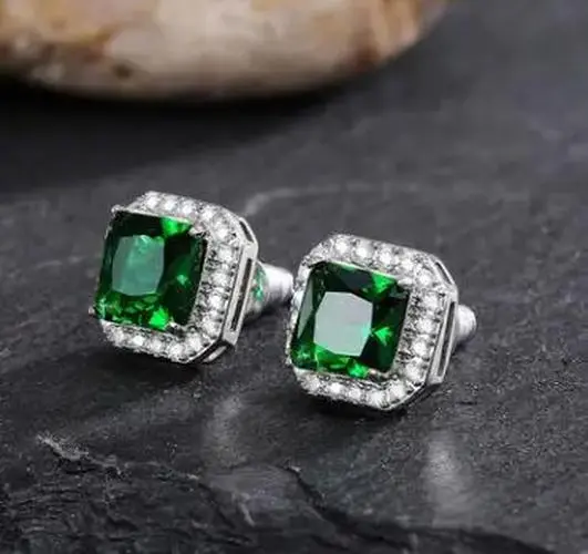 Imagine elevating your style with these exquisite square-shaped earrings crafted from 925 sterling silver. The vibrant emerald green zircon crystals catch the light beautifully, adding a touch of sophistication to your everyday look or special occasions. Their geometric design offers a modern yet elegant aesthetic, perfect for professional settings, anniversaries, or romantic evenings. Lightweight and comfortable at approximately 2.5 grams total, each earring weighs only about 0.7 grams, ensuring a secure and effortless wear. The intricate setting features a sparkling halo of tiny artificial stones that enhance the vivid color and reflective quality of the main zircon. These versatile earrings seamlessly combine fine jewelry craftsmanship with contemporary appeal, making them a must-have accessory for stylish women.