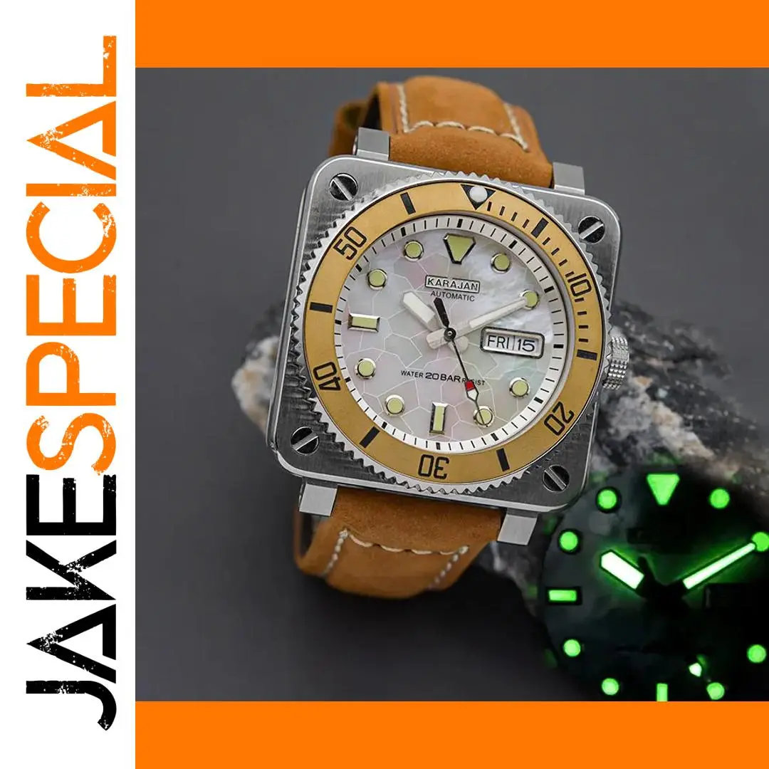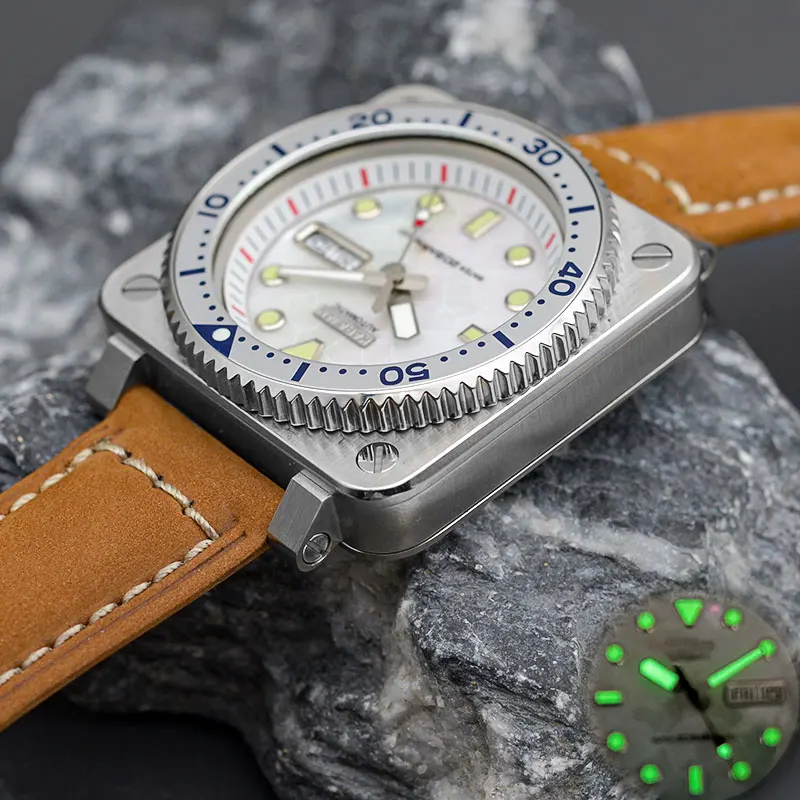 Experience the bold, industrial design of this square men’s watch, crafted with a robust 42mm stainless steel case featuring a brushed metallic finish and horizontal grain patterns. The 14mm thickness emphasizes its sturdy build, while the round dial measures approximately 31.2mm x 30mm, creating a striking visual balance. The white honeycomb-textured background adds depth, complemented by a gold-colored bezel insert with black engraved minute markers and numerals at key intervals. Bold, luminous markers and broad, sword-shaped hands coated with vivid green C3 luminous powder ensure excellent visibility in low light or darkness. The slender seconds hand with a luminous circle and red tip adds a pop of color. Designed for practicality and style, it combines rugged aesthetics with luminous functionality, perfect for modern men who appreciate durability and visual appeal.