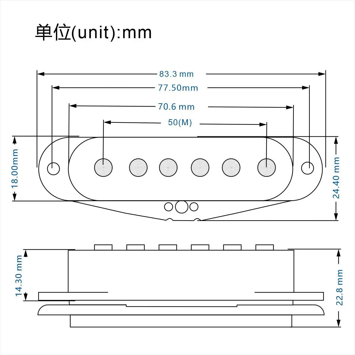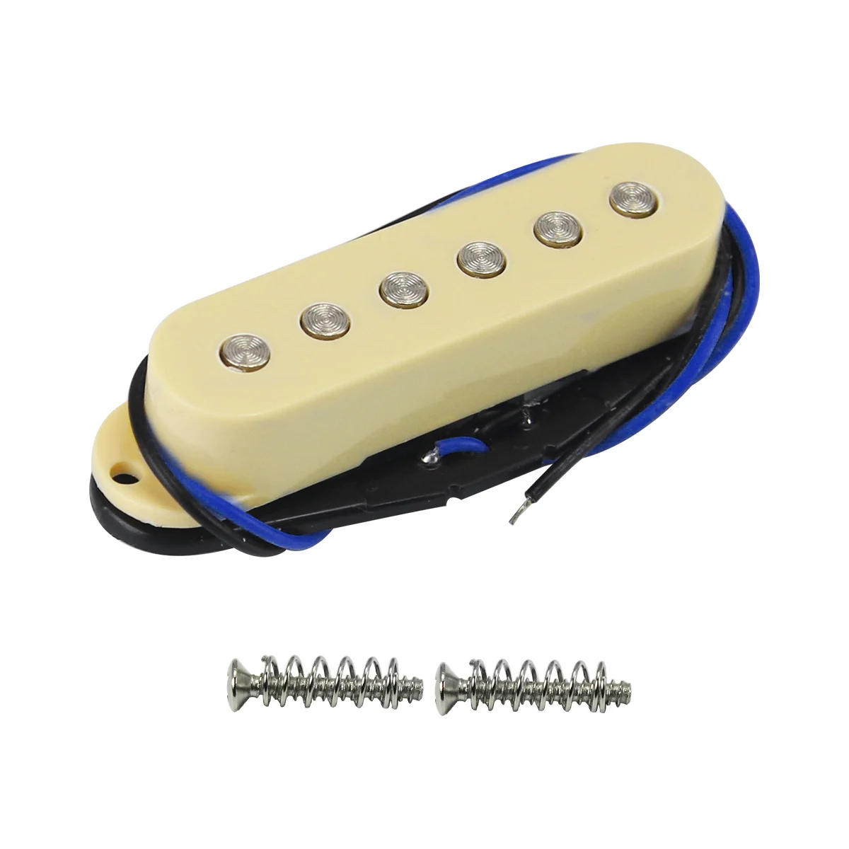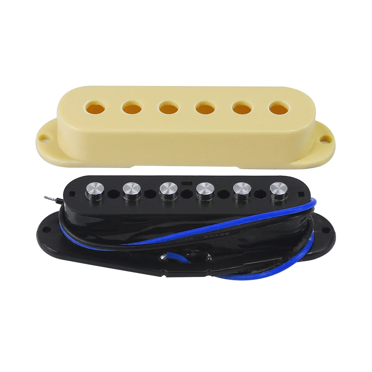 - Middle single coil pickup presents a 50mm pole spacing, 5-6k resistance, two wires, with a cream cover and exposed pole pieces for vintage aesthetics and clarity in tone.
