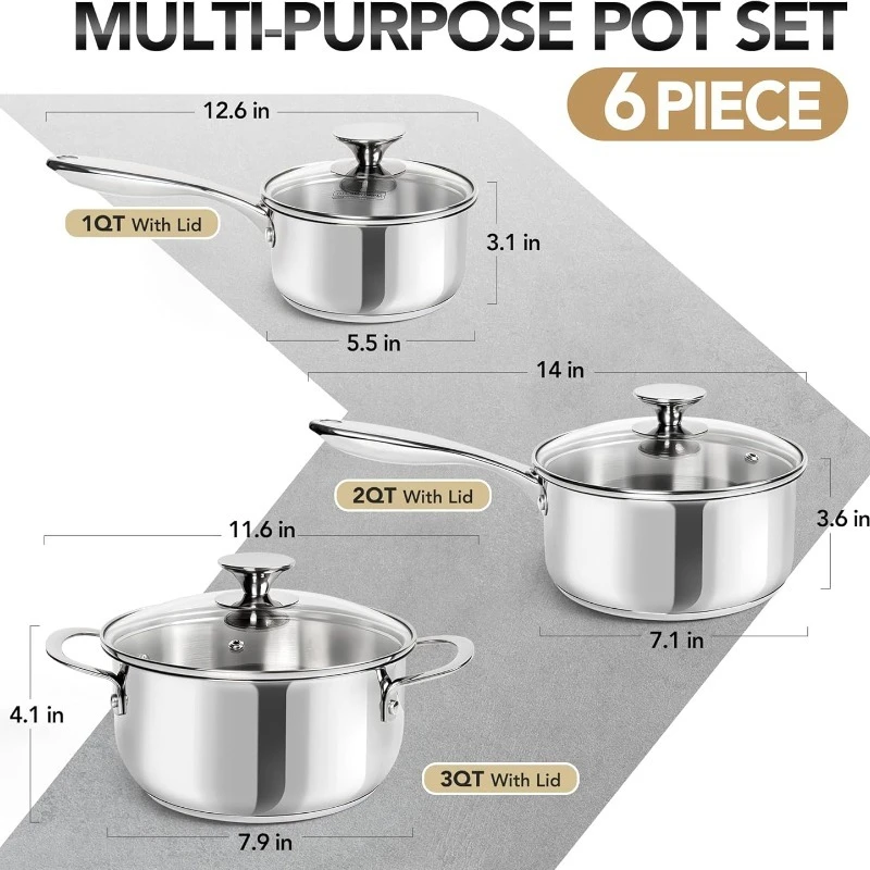 Imagine preparing meals effortlessly with this elegant, high-performance stainless steel saucepot set. Crafted from durable 18/10 stainless steel with a quick-heating aluminum core, it ensures even cooking without hot spots. The polished exterior and satin-finish interior add a sleek, modern touch to your kitchen decor. Featuring three versatile sizes—1 quart, 2 quarts, and 3 quarts—each pot boasts double hollow handles that stay cool and provide a secure grip. Transparent glass lids with stainless steel knobs seal in flavor and nutrients while allowing you to monitor your cooking. Whether you’re simmering sauces, boiling pasta, or making soups, this set transforms your cooking experience with its durability, style, and functionality, making every meal special.