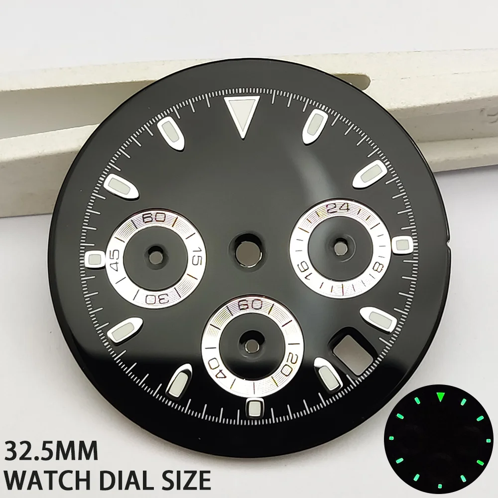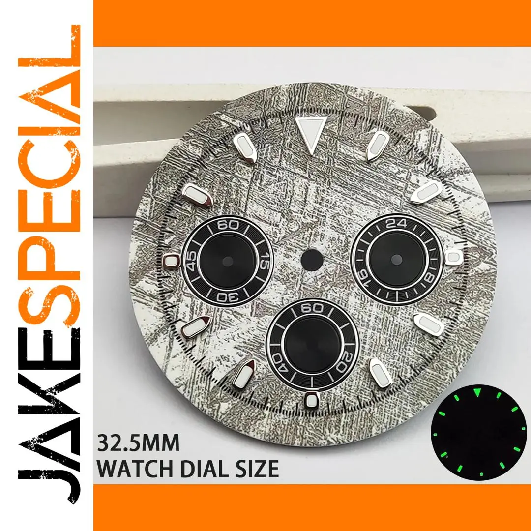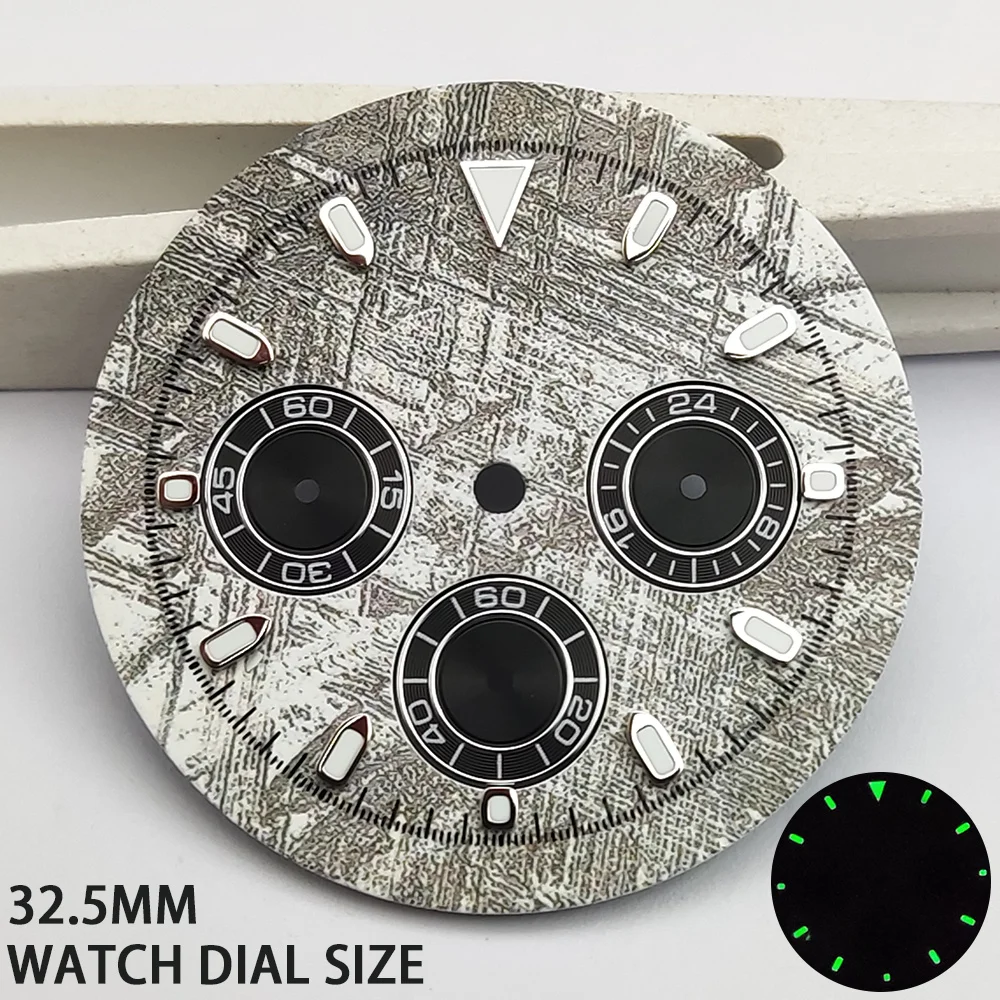 Experience the perfect upgrade for your men’s watch with this 32.5mm stainless steel luminous watch dial, compatible with VK63 quartz movement. Featuring a textured, rugged metallic surface in shades of gray and silver, it showcases a minimalist round design with six Arabic numeral markers and three symmetrically arranged subdials with black backgrounds and white markings. The dial also boasts green luminous rectangular hour markers that glow in low light, enhancing functionality and style. Easy to install and crafted for durability, this high-quality dial is ideal for watch repair or customization, elevating your timepiece with its sophisticated blend of industrial elegance and luminous visibility.