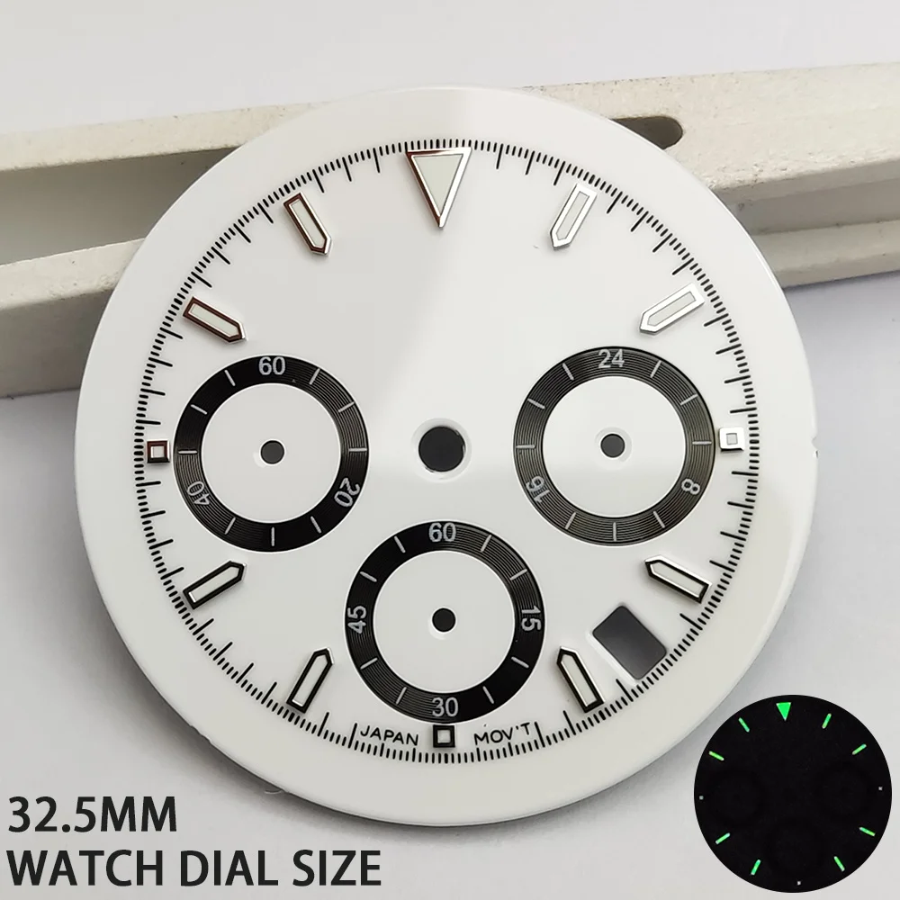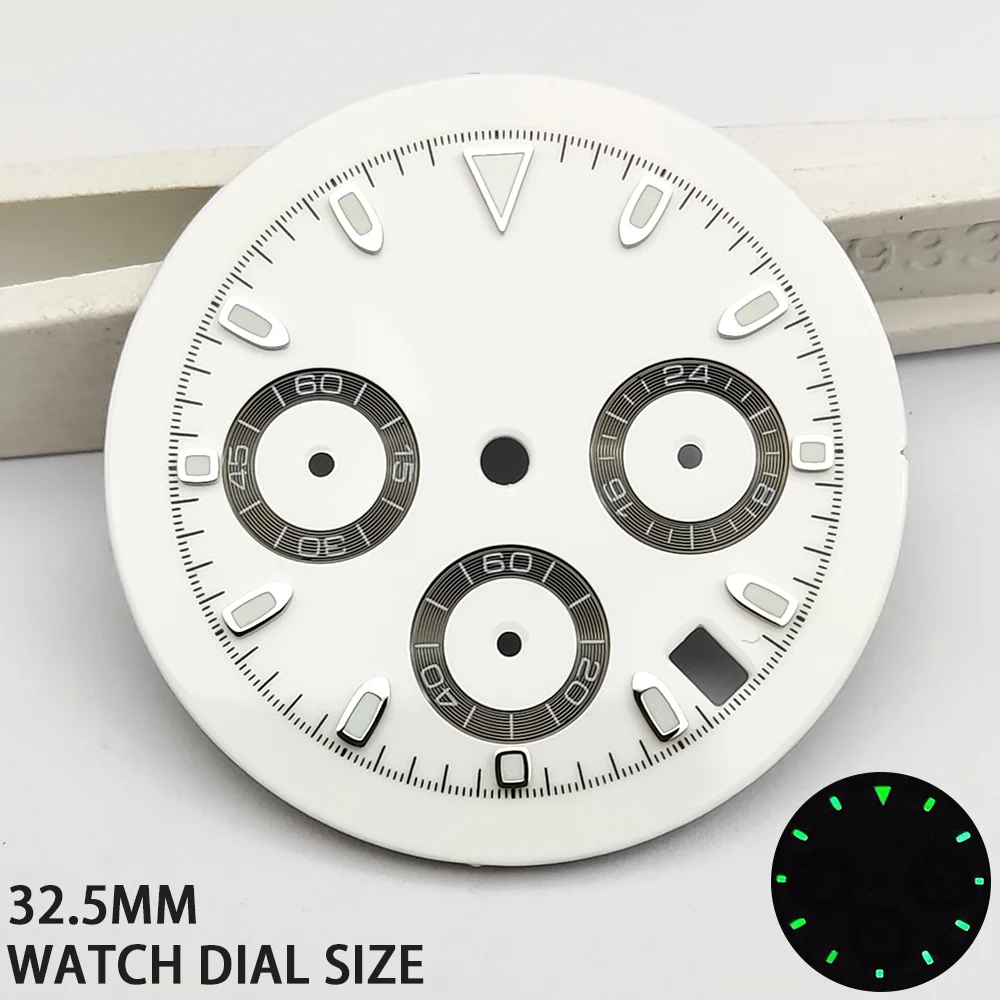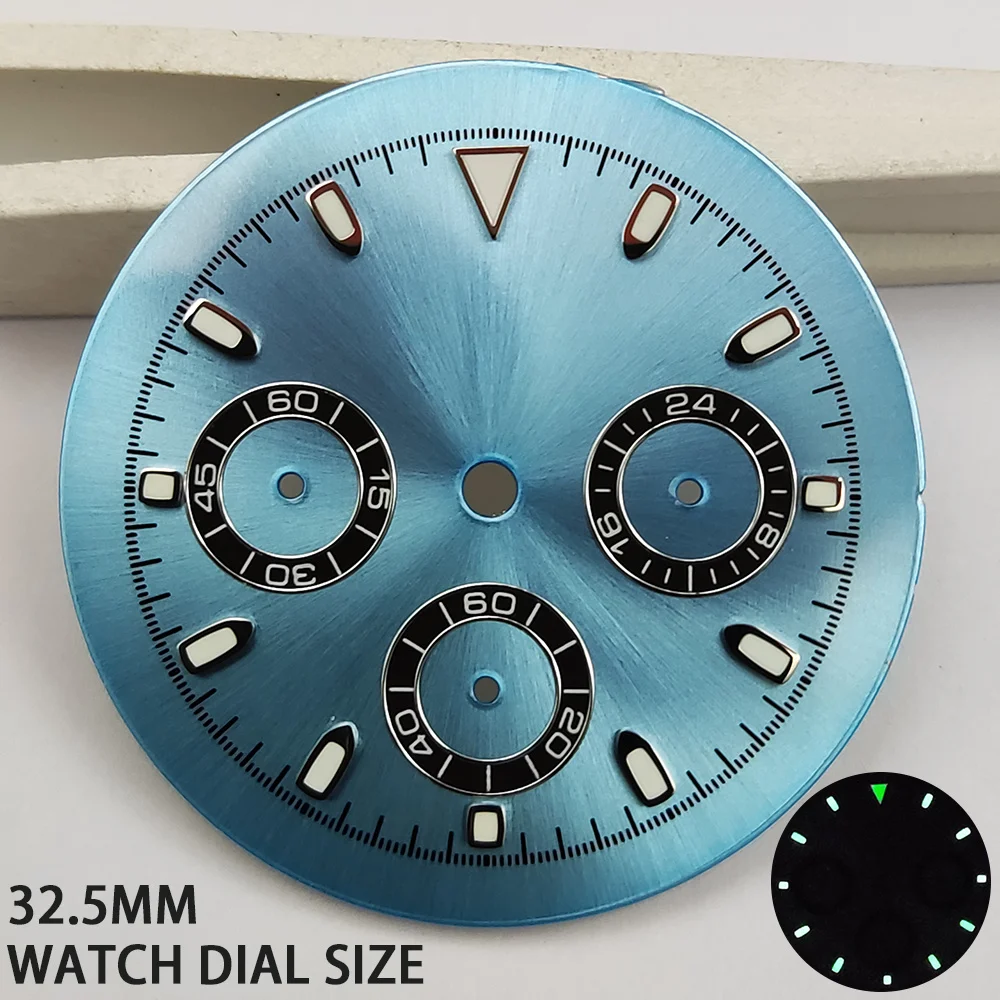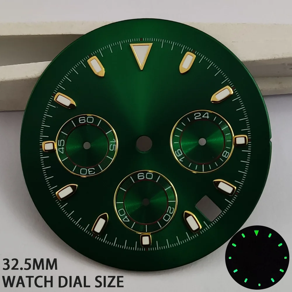 Experience the perfect upgrade for your men’s watch with this 32.5mm stainless steel luminous watch dial, compatible with VK63 quartz movement. Featuring a textured, rugged metallic surface in shades of gray and silver, it showcases a minimalist round design with six Arabic numeral markers and three symmetrically arranged subdials with black backgrounds and white markings. The dial also boasts green luminous rectangular hour markers that glow in low light, enhancing functionality and style. Easy to install and crafted for durability, this high-quality dial is ideal for watch repair or customization, elevating your timepiece with its sophisticated blend of industrial elegance and luminous visibility.