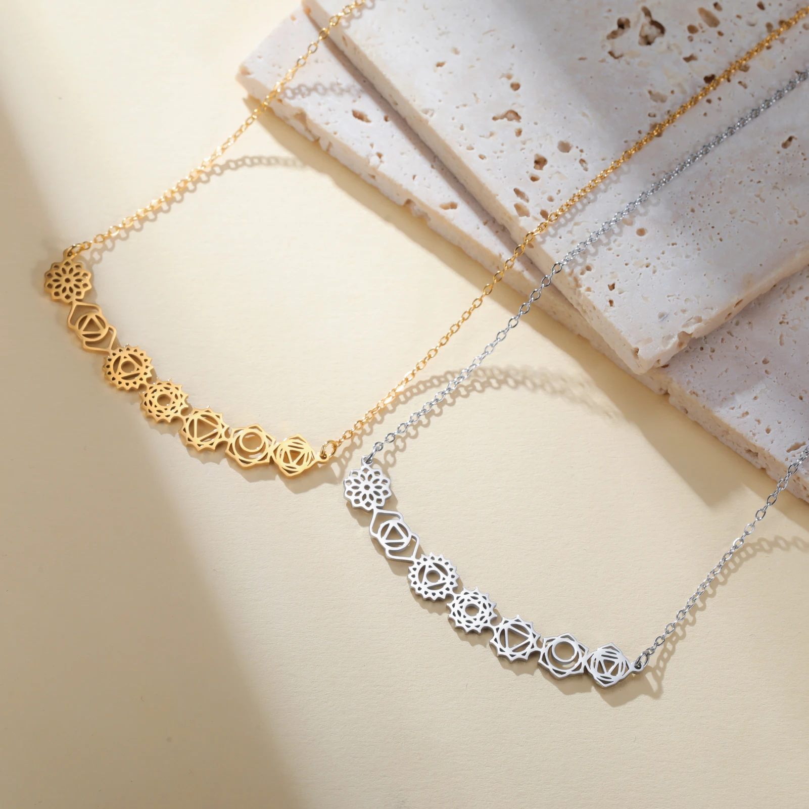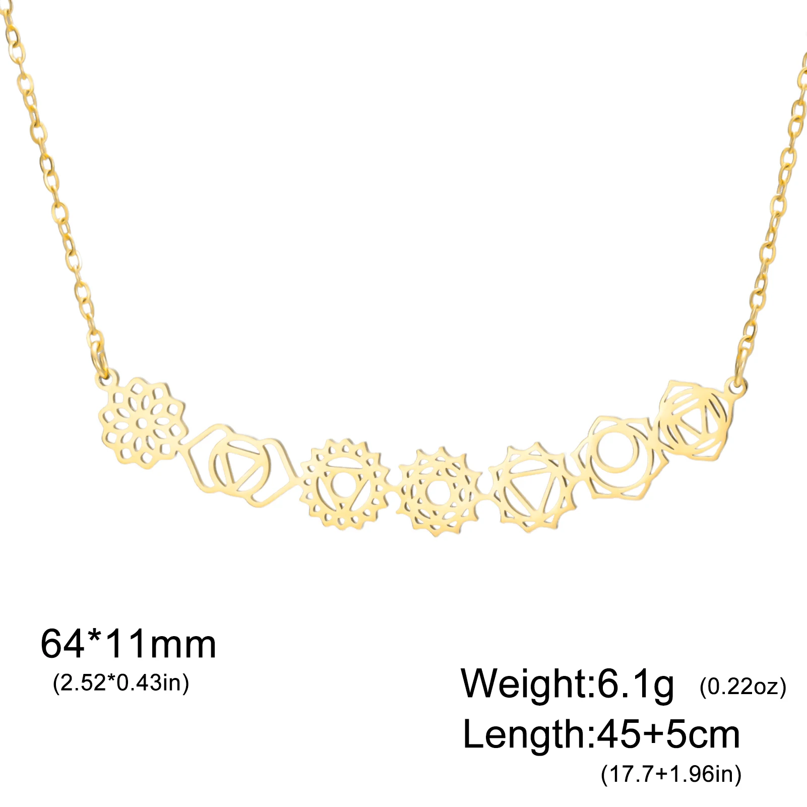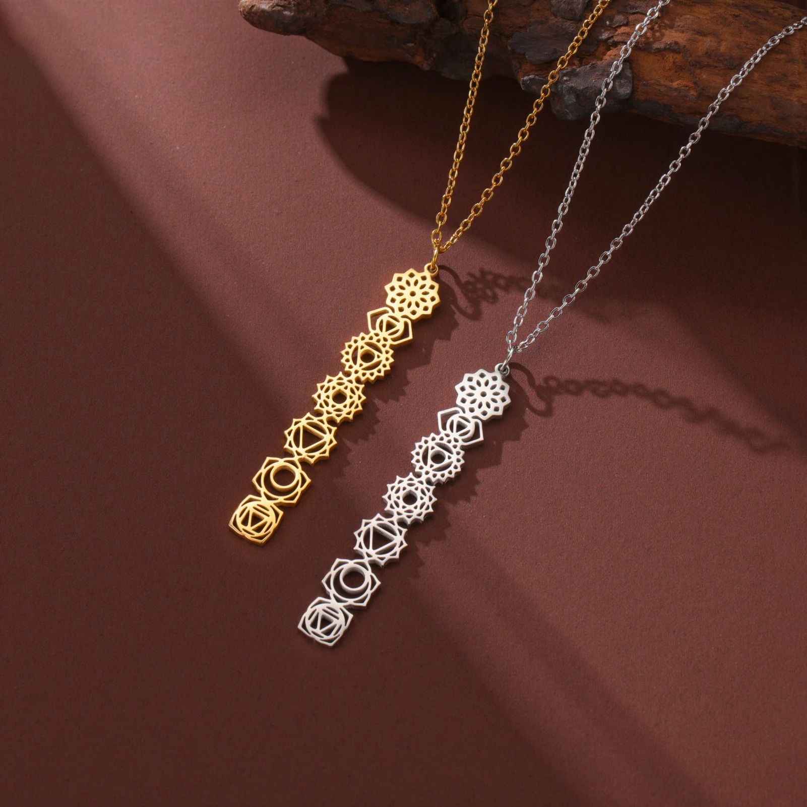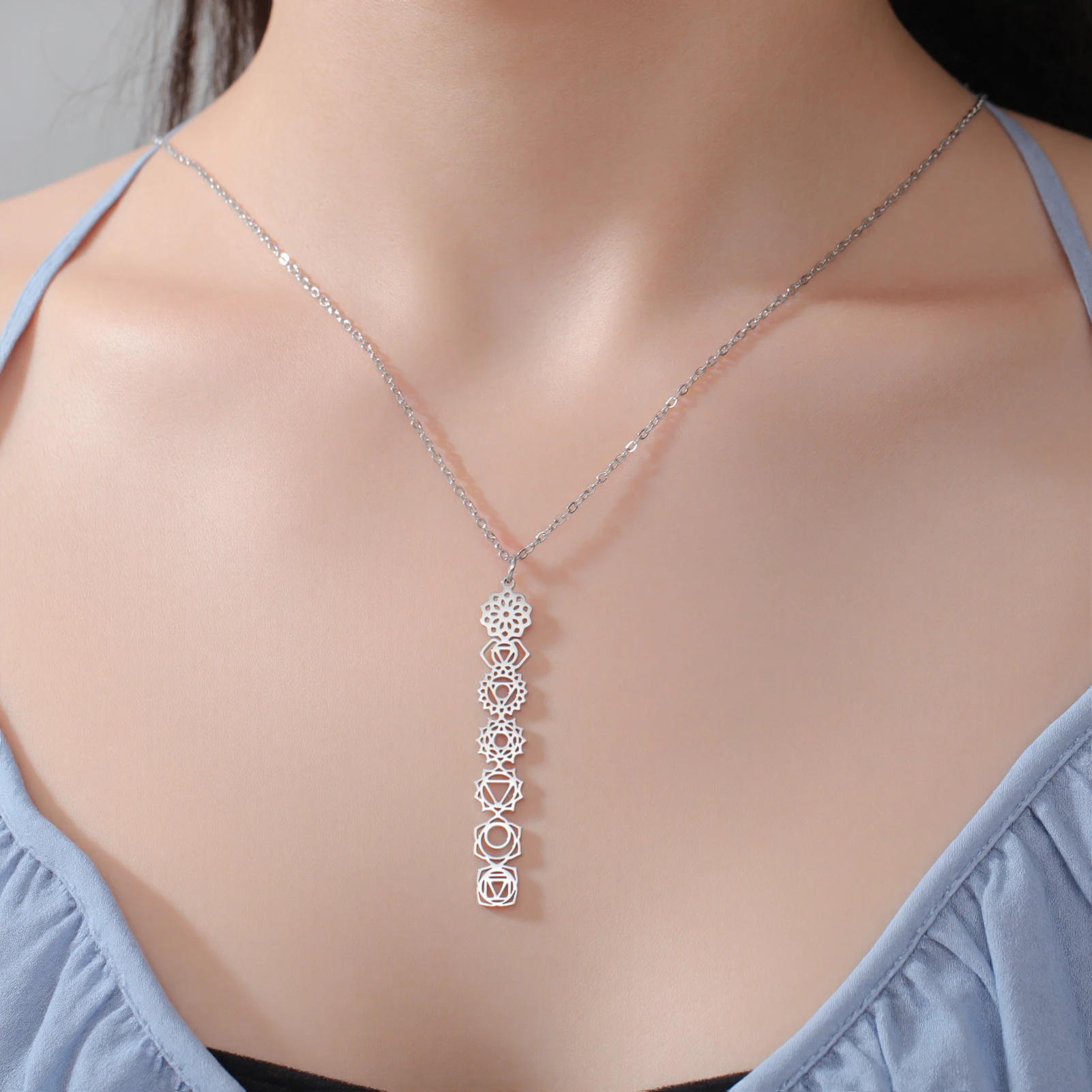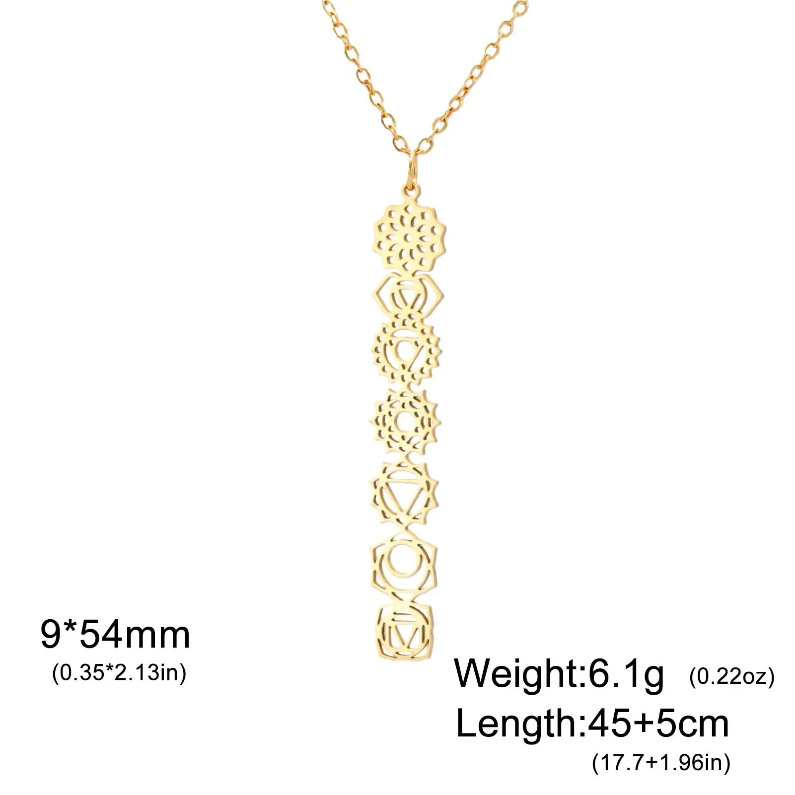 - The pendant features a vertical arrangement of seven chakra-inspired geometric symbols, each delicately cut out to symbolize spirituality, balance, and harmony, adding a meaningful touch.
