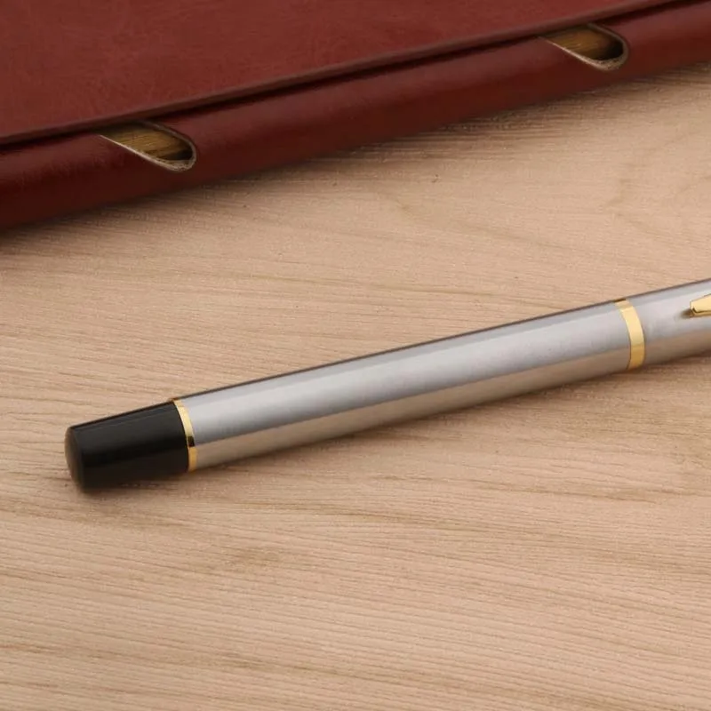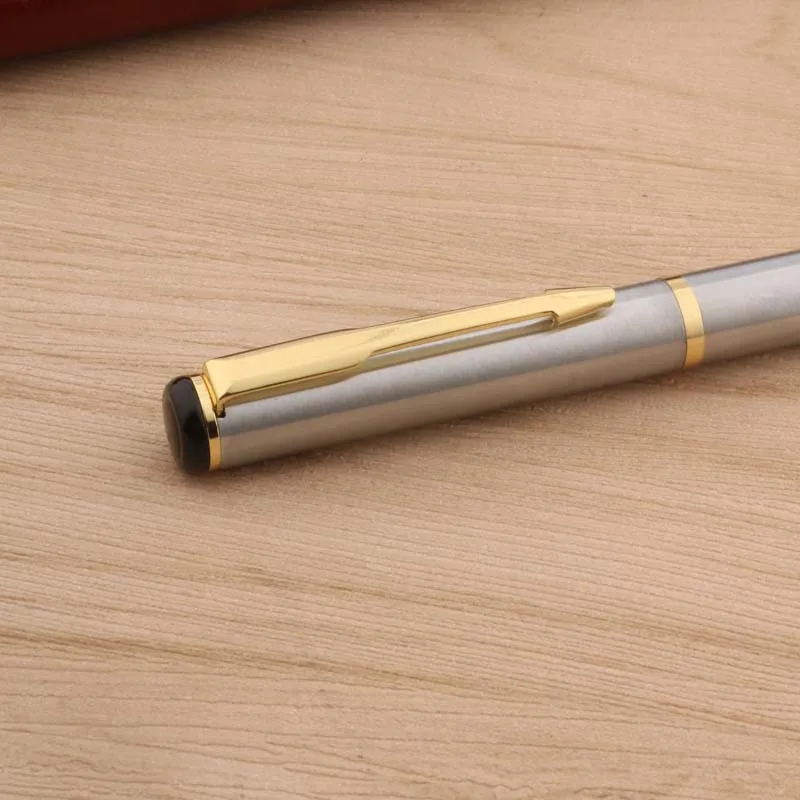 Experience the refined luxury of this this Stainless Steel 801 Fountain Pen, designed for those who appreciate sophistication and high-quality craftsmanship. Featuring a sleek cylindrical body with a matte silver finish, it exudes modern elegance. Gold accents, including bands near the center and at the nib connection, add a touch of understated luxury. The gold-colored nib, with a metallic sheen, promises smooth, precise writing, making every stroke feel effortless. The matching stainless steel cap, topped with a prominent gold clip with rounded edges, ensures secure closure and ease of use. Set against a textured blue box and a rich leather surface, this pen elevates your writing experience. Its customizable design makes it perfect for gifting or personal collection enhancement.