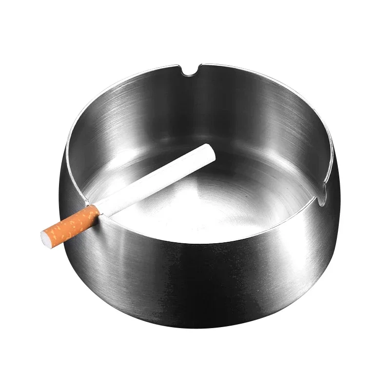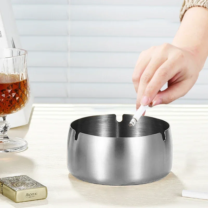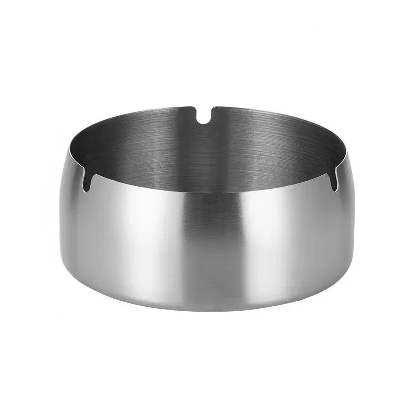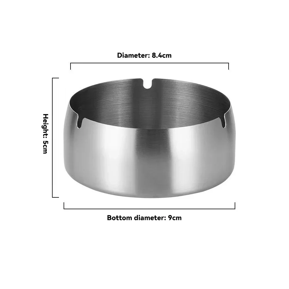 Enhance your space with this elegant stainless steel round ashtray, perfectly designed for modern tabletop aesthetics. Measuring 9 cm in diameter, it offers a compact yet functional solution for cigarettes at home, in the office, or bedroom. Its polished, reflective finish adds a sophisticated touch, creating a clean and minimalist appeal. The slightly tapered cylindrical shape, complemented by smooth, curved surfaces, ensures ease of use and quick cleaning. A small semi-circular groove around the rim provides a convenient rest for cigarettes, while the shallow interior prevents ash spillage. Its versatile and understated design makes it an ideal addition to any contemporary setting, blending practicality with modern style naturally in your daily routine.