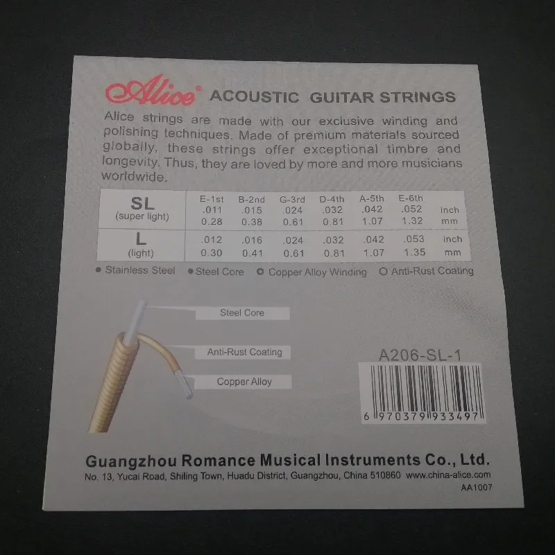 Experience superior sound quality with this set of 10 stainless steel guitar strings designed for acoustic and folk guitars. Includes the first, second, and sixth strings with gauges of 0.012″ (0.30 mm), 0.016″ (0.41 mm), and 0.053″ (1.35 mm) respectively. Crafted from polished stainless steel, these strings offer durability, a sleek, reflective finish, and excellent resonance. The set features visible ball-end fittings for easy installation and compatibility with guitars featuring model designation A206-L. Perfect for guitar enthusiasts seeking reliable, high-performance strings that enhance tone and playability, elevating your musical experience with every strum.