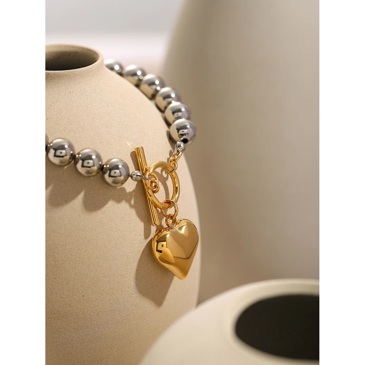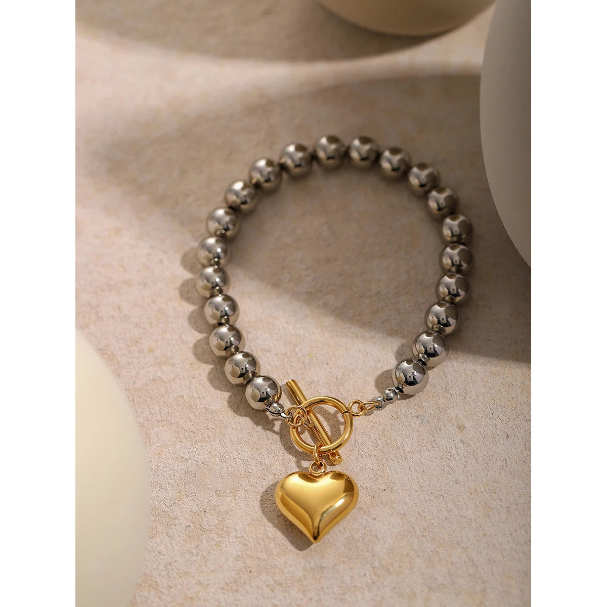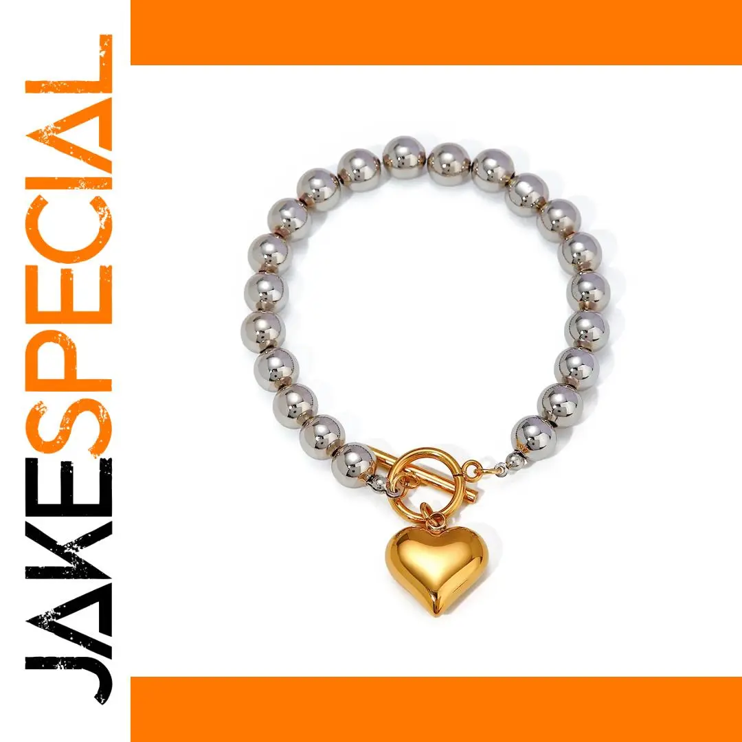 Experience modern elegance with this handcrafted stainless steel bracelet, featuring highly polished silver beads arranged in a sleek circular pattern. The centerpiece is a smooth, gold-colored heart-shaped charm that adds a luxurious touch, while a secure toggle clasp ensures effortless wear and a perfect fit. Made from durable, waterproof stainless steel, this versatile accessory is designed for daily use in all weather conditions. Its high-quality craftsmanship and minimalist yet sophisticated style make it ideal for enhancing any outfit or as a thoughtful gift. Model number JDBW2403010-PS, blending durability with refined aesthetics for a timeless addition to your jewelry collection.