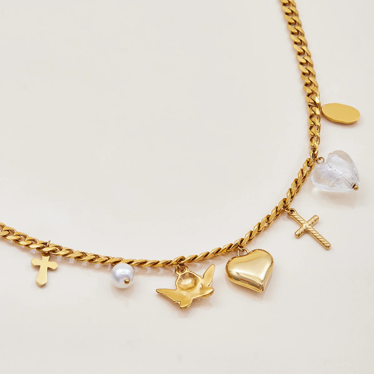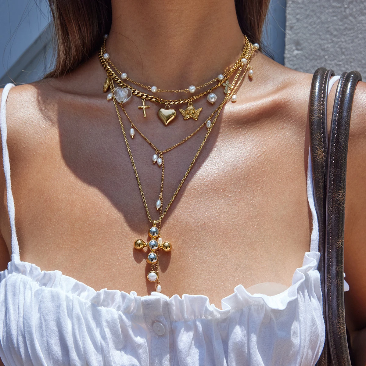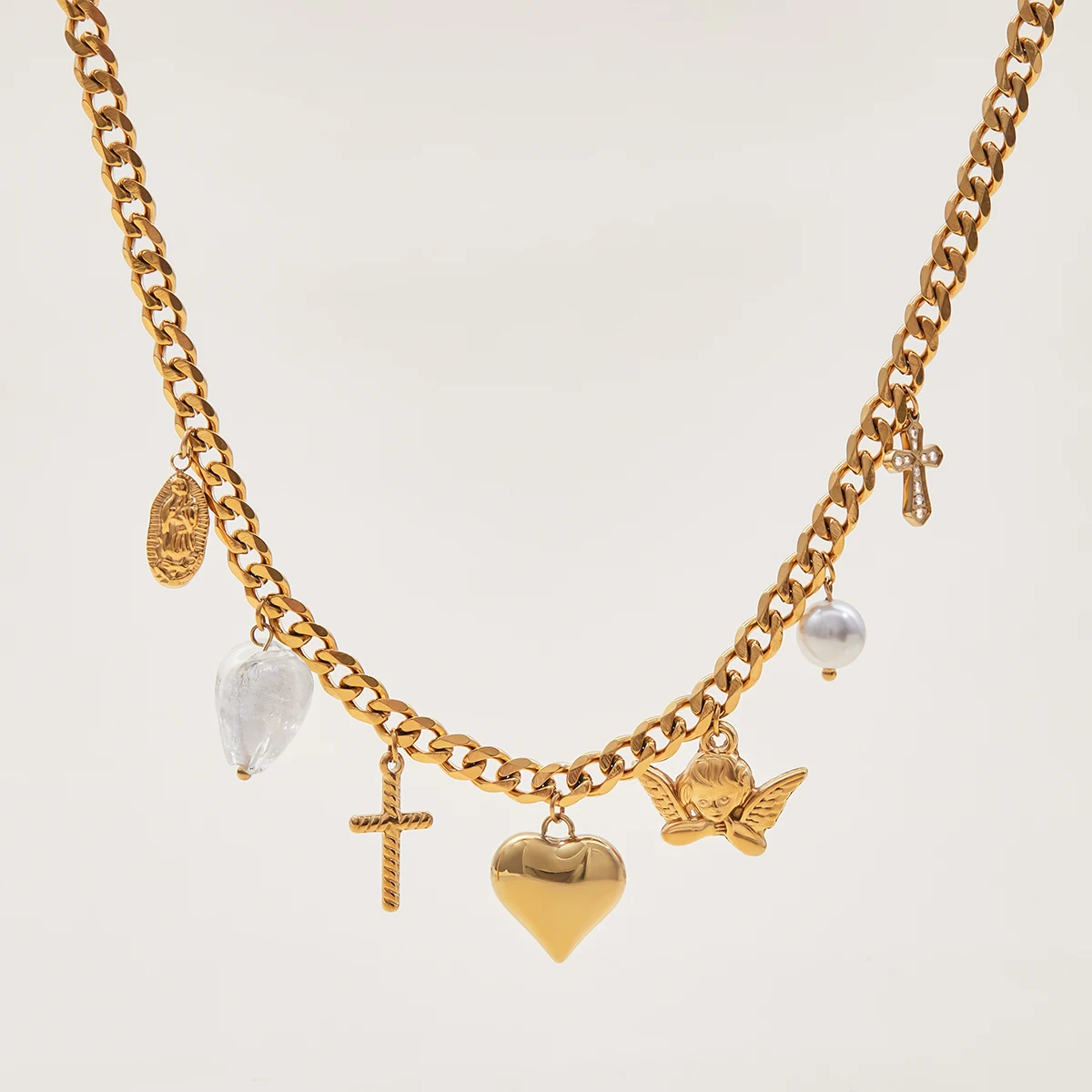 Elevate your style with this trendy, gold-tone stainless steel women’s necklace featuring a cut-out angel cross pendant adorned with sparkling rhinestones. Crafted with a durable, polished link chain, the necklace measures adjustable and is designed for stacking with other jewelry, creating a bold, fashionable statement perfect for parties and special occasions. Available in various model color variations, this modern piece emphasizes elegance and robustness without any chemical concerns, making it a versatile addition to your jewelry collection. Experience the perfect blend of luxury, durability, and style with this eye-catching, contemporary accessory that effortlessly enhances any outfit.