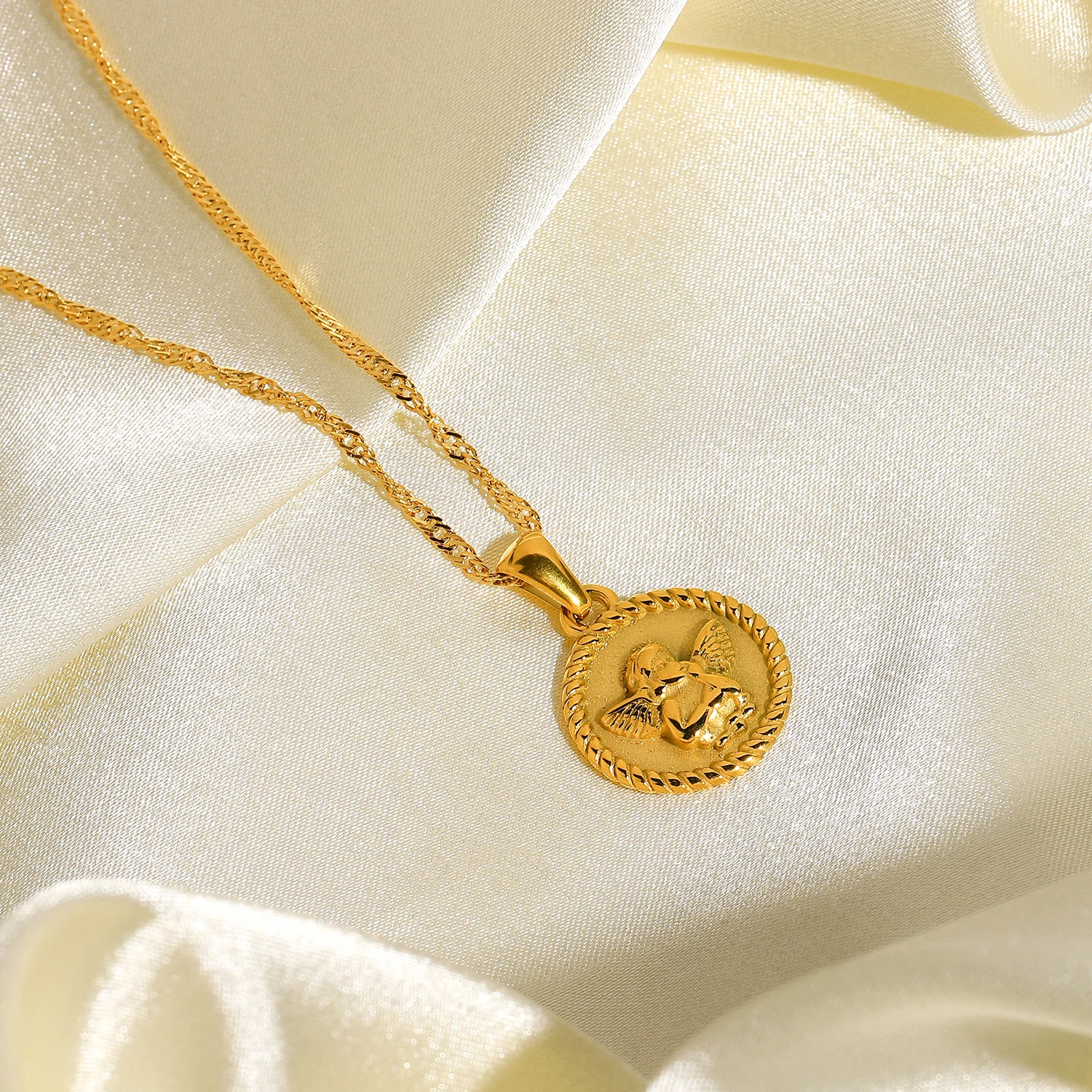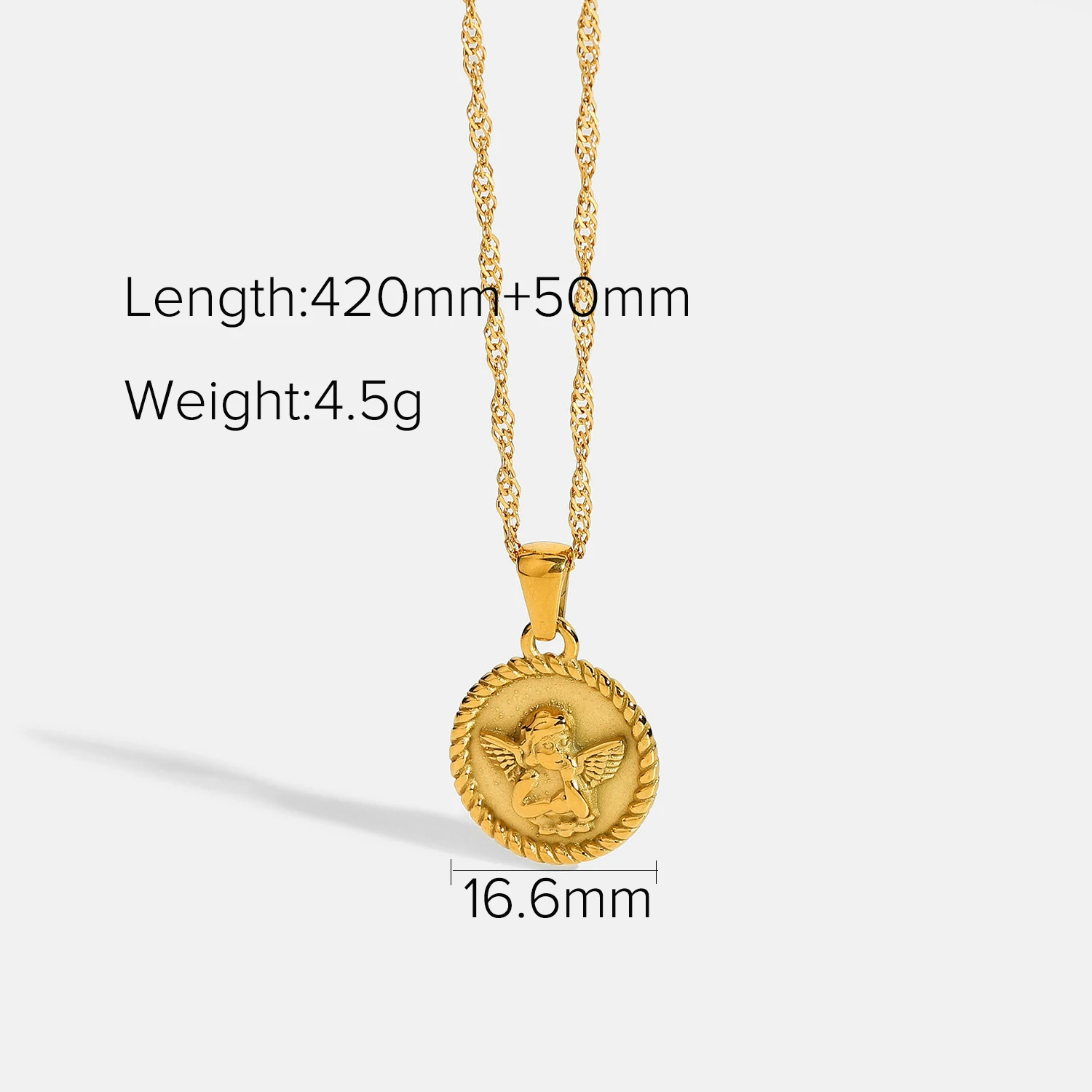 Experience elegance with this stainless steel women’s necklace featuring a 16.6mm gold-tone round angel pendant, crafted with durable PVD gold finish that resists fading and scratches. The delicate water-wave chain style adds fluidity and shimmer, weighing approximately 15 grams for comfortable wear. Waterproof and free of nickel, lead, and cadmium, it is perfect for any occasion, especially parties. The angel motif embodies a trendy, spiritual aesthetic, making it a versatile accessory suitable for casual or special events. Its high-quality craftsmanship ensures long-lasting beauty, adding a touch of sophisticated charm to your jewelry collection.