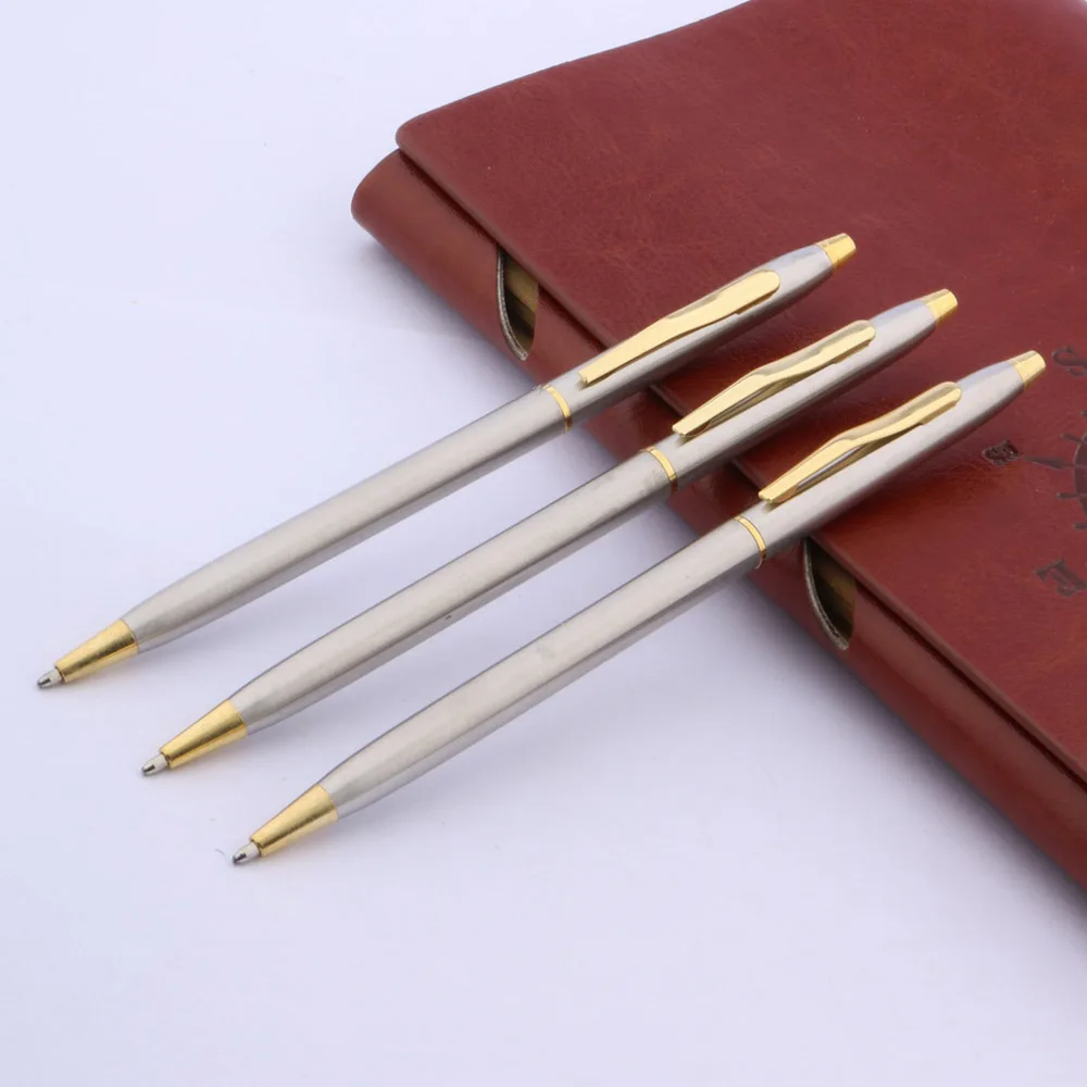 - Three premium stainless steel ballpoint pens with a matte brushed texture enhance durability and style, ideal for professional settings, offering a sleek look complemented by gold accents on the tip, clip, and band.