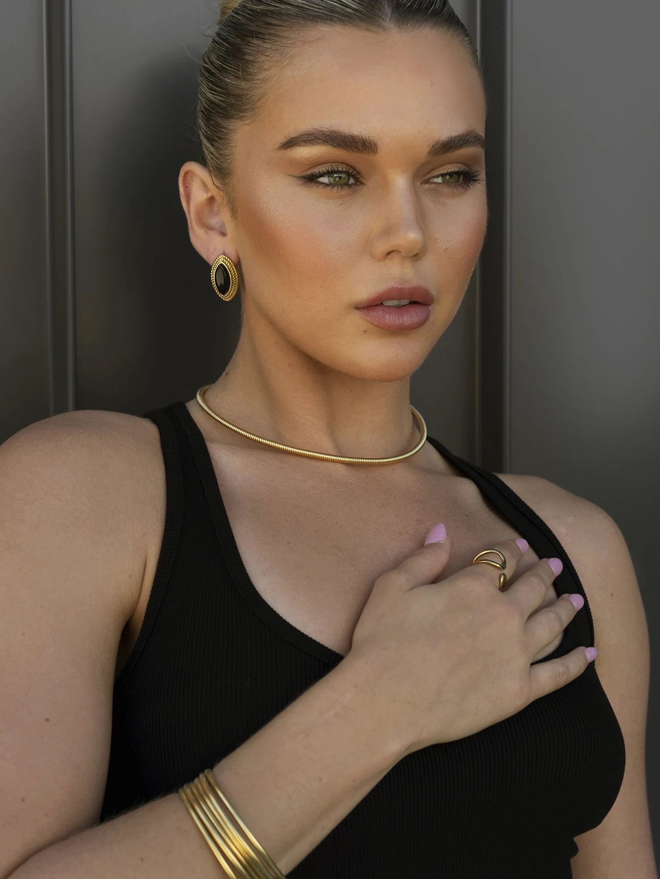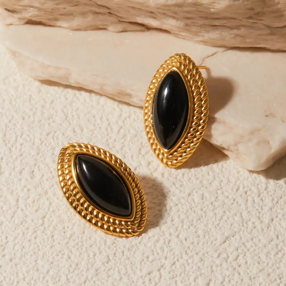Experience timeless elegance with these high-quality stainless steel stud earrings, featuring a luxurious PVD gold finish that ensures durability and a long-lasting vibrant hue. The design highlights a glossy, oval-shaped black centerpiece, reminiscent of a polished gem, set within a textured gold-toned frame with intricate twisted patterns. The sleek, classic style offers versatility, perfect for elevating both casual and formal outfits. These earrings sit flush against the earlobe, providing a subtle yet sophisticated accent. Lightweight at just 15 grams, they promise comfort without compromising style. The waterproof, nickel-free, lead-free, and cadmium-free construction makes them suitable for sensitive skin, offering peace of mind for daily wear or special occasions.