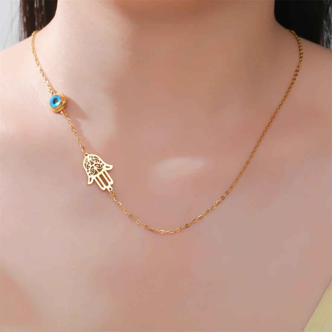 Elevate your style with this stunning stainless steel Blue Evil Eye Hamsa Necklace, available in silver and gold colors and measuring 40+5cm. The delicate, minimalist chain beautifully showcases a vintage-inspired, vibrant blue evil eye pendant set in a sleek gold bezel, symbolizing protection and good luck. Attached is an ornate Hamsa charm with intricate filigree-like cut-outs, blending vintage elegance with modern simplicity. Crafted from durable, hypoallergenic stainless steel, this necklace resists rust, corrosion, deformation, and fading, making it perfect for daily wear and special occasions like birthdays, anniversaries, or as a thoughtful gift.
