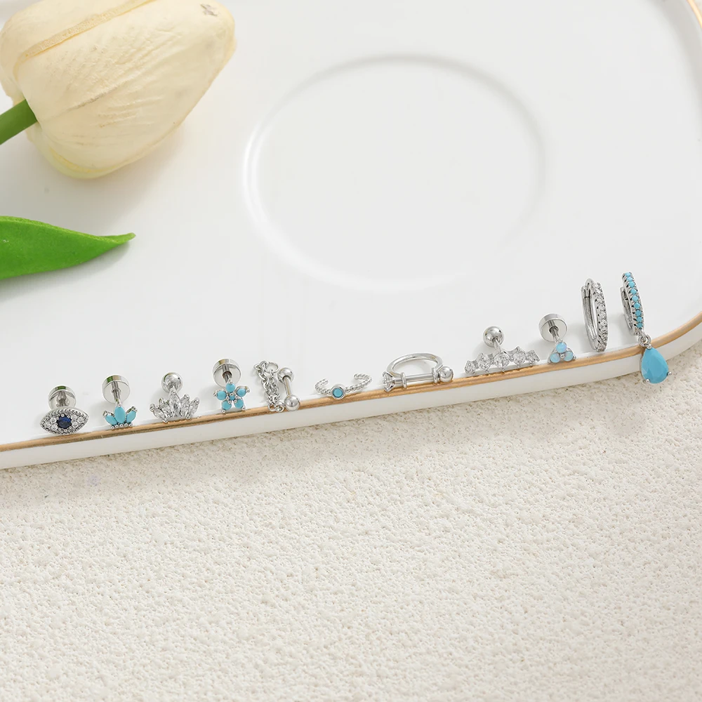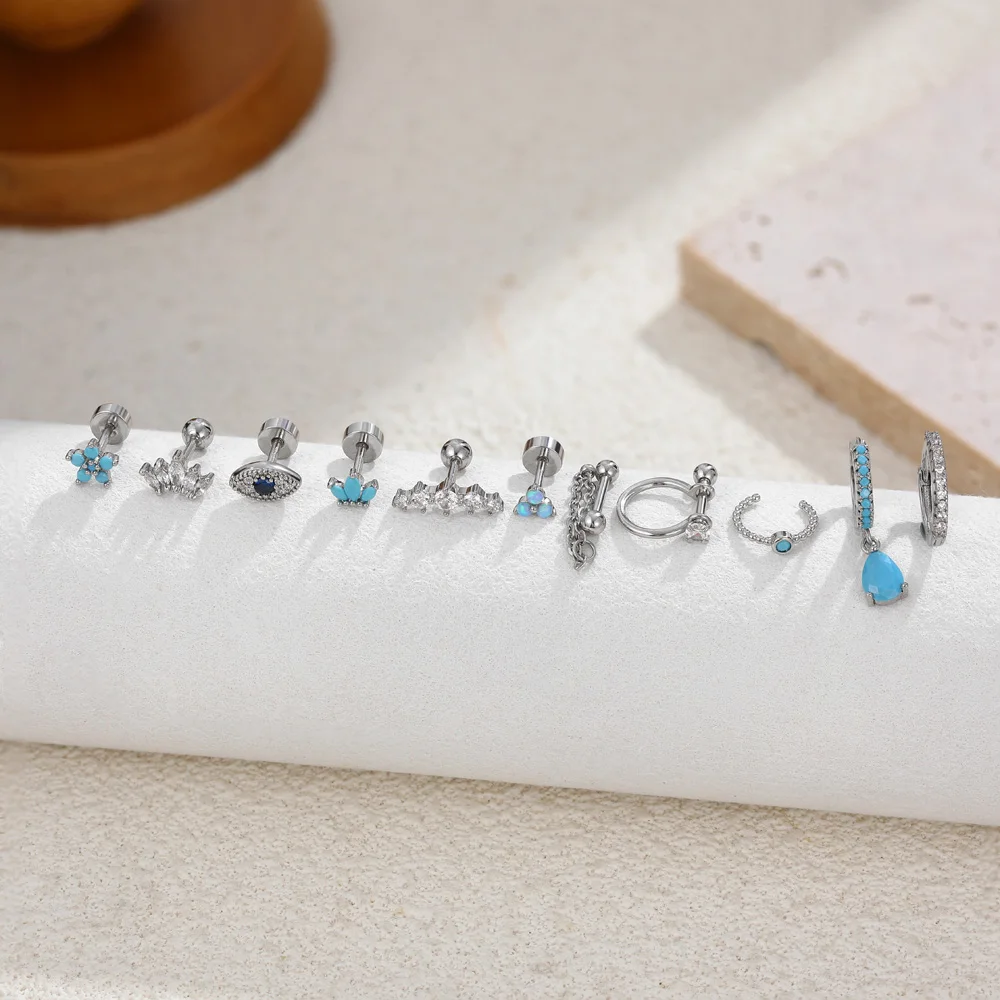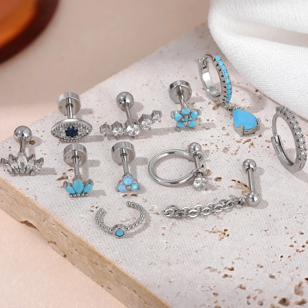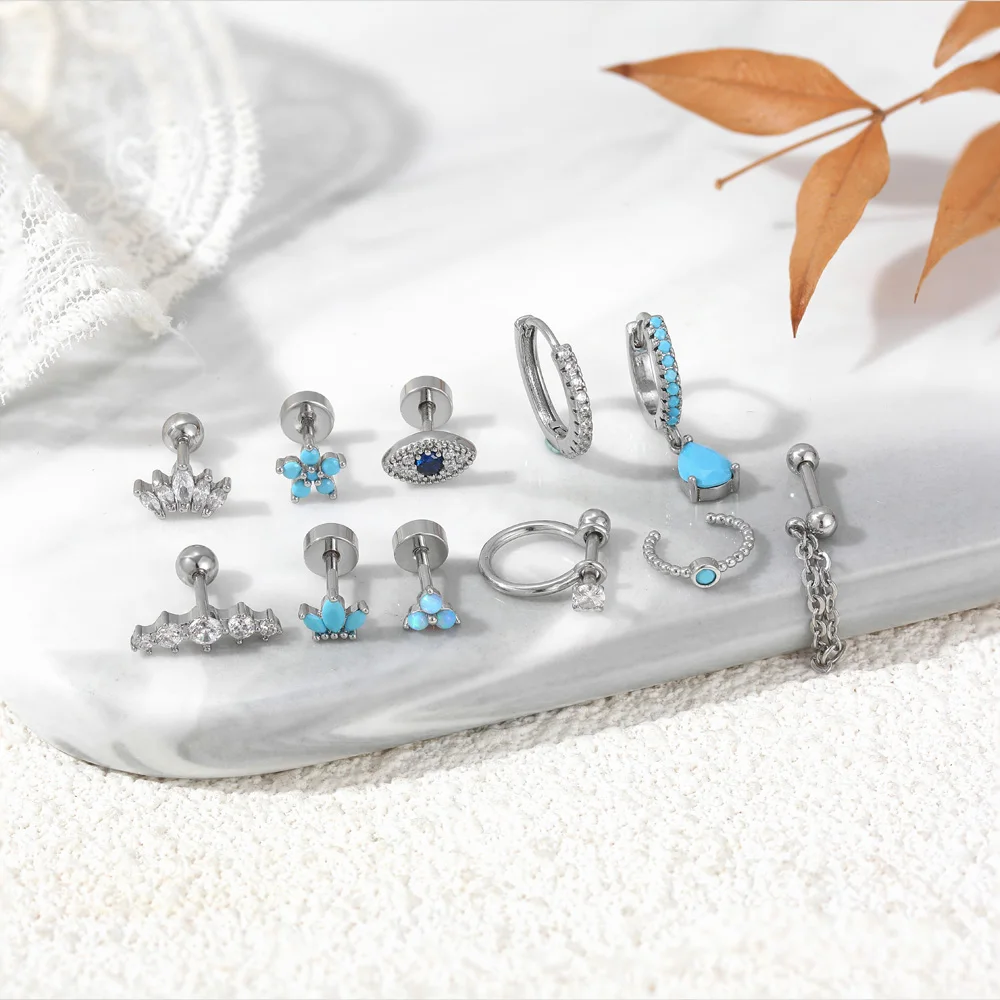 Experience the perfect blend of edgy punk and gothic aesthetics with this 11-piece waterproof stainless steel body jewelry set. Designed for multiple piercings, it features sparkling cubic zirconia inlaid accents, vibrant turquoise gemstones, and unique geometric shapes like eye motifs, floral forms, and sleek curves. The collection offers a diverse range of rings, hoops, and studs, ideal for adding bold character to your style. Crafted from durable stainless steel, these pieces are waterproof and suitable for everyday wear. Whether you're preparing for a party, special occasion, or just want to elevate your daily look, this set provides versatile and fashionable options. Its dark yet feminine design ensures you stand out confidently.