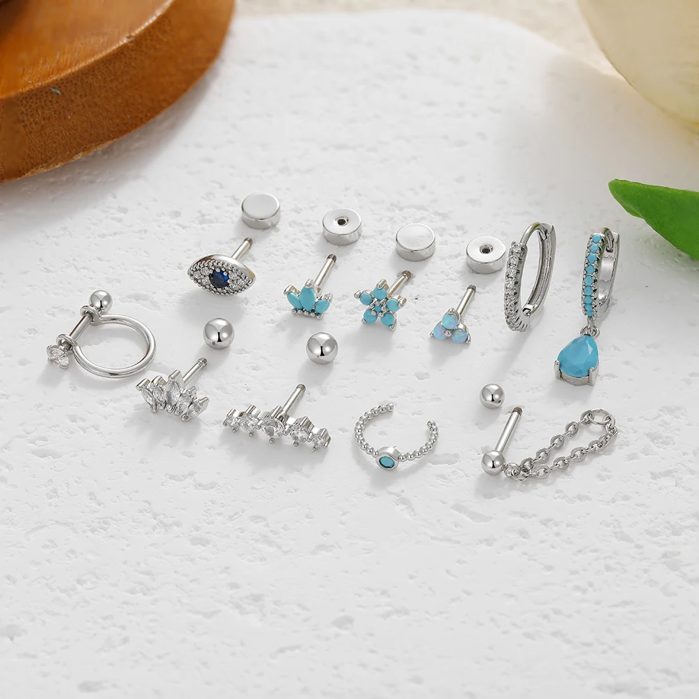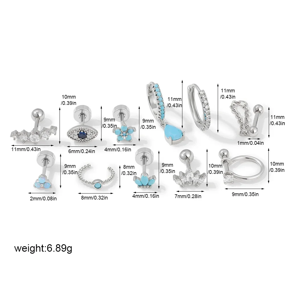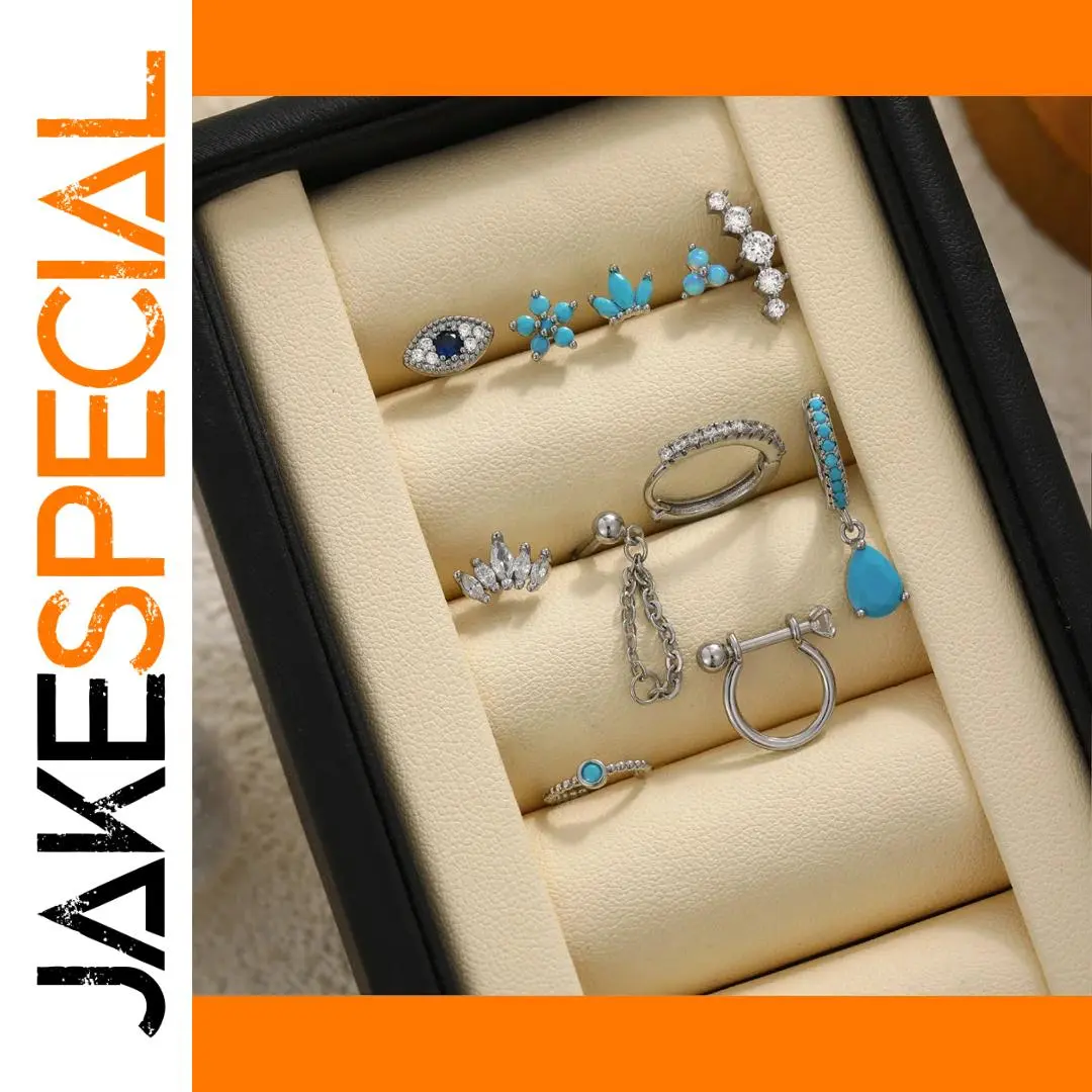 Experience the perfect blend of edgy punk and gothic aesthetics with this 11-piece waterproof stainless steel body jewelry set. Designed for multiple piercings, it features sparkling cubic zirconia inlaid accents, vibrant turquoise gemstones, and unique geometric shapes like eye motifs, floral forms, and sleek curves. The collection offers a diverse range of rings, hoops, and studs, ideal for adding bold character to your style. Crafted from durable stainless steel, these pieces are waterproof and suitable for everyday wear. Whether you're preparing for a party, special occasion, or just want to elevate your daily look, this set provides versatile and fashionable options. Its dark yet feminine design ensures you stand out confidently.
