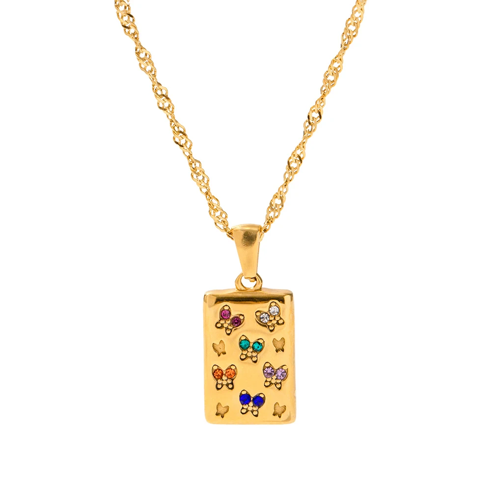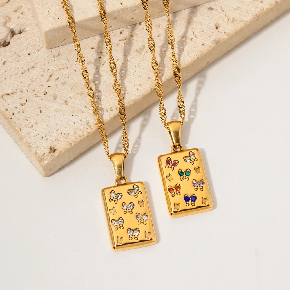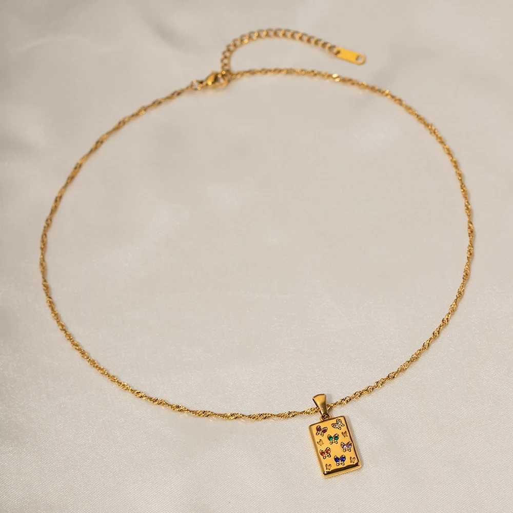 - This woman’s pendant necklace features a square butterfly design crafted from stainless steel with PVD gold coating, ensuring enduring color that resists fading and scratching over time.