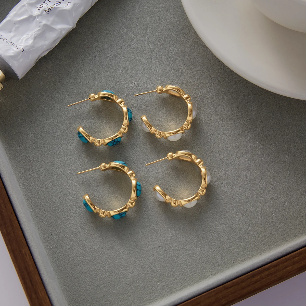 Imagine elevating your everyday look with these elegant and contemporary earrings. Crafted from hypoallergenic stainless steel with a shiny platinum finish, they promise comfort and durability. The C-shaped design features a sleek round pattern that complements the vibrant blue turquoise pearls, adding a pop of color and texture. Suitable for any occasion, these earrings blend a modern aesthetic with timeless appeal. Their stud style with push-back findings ensures easy wear and secure fitting, making them perfect for women looking for versatile jewelry pieces. Whether for day or night, these earrings will effortlessly enhance your style and confidence, giving you a chic, polished appearance every time you wear them.