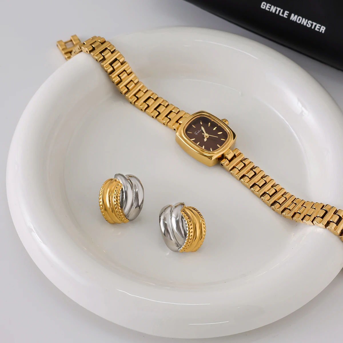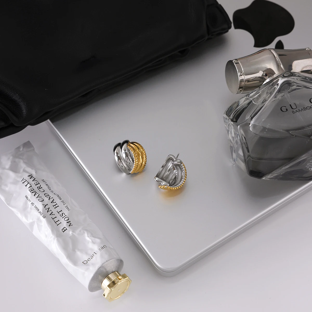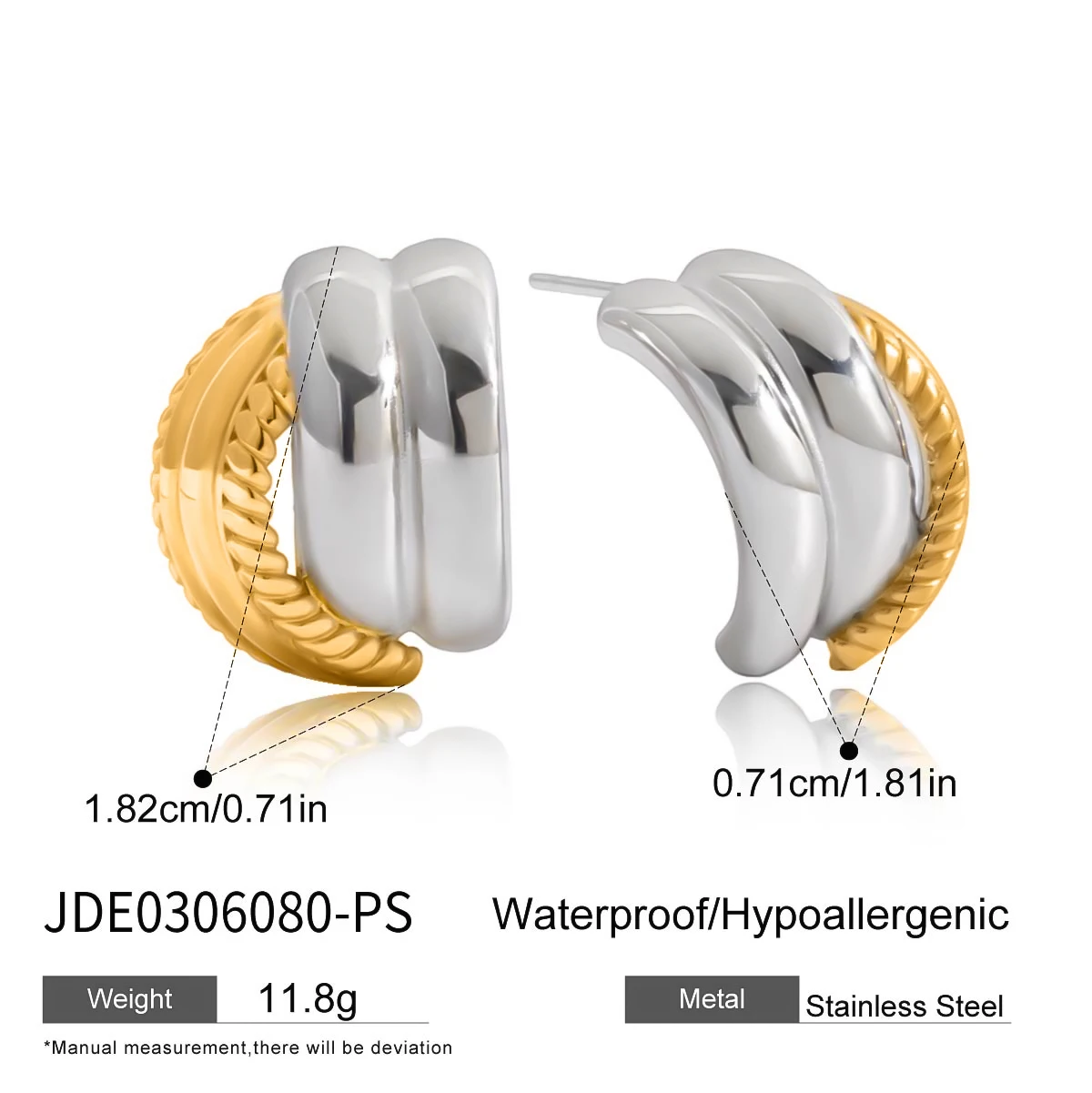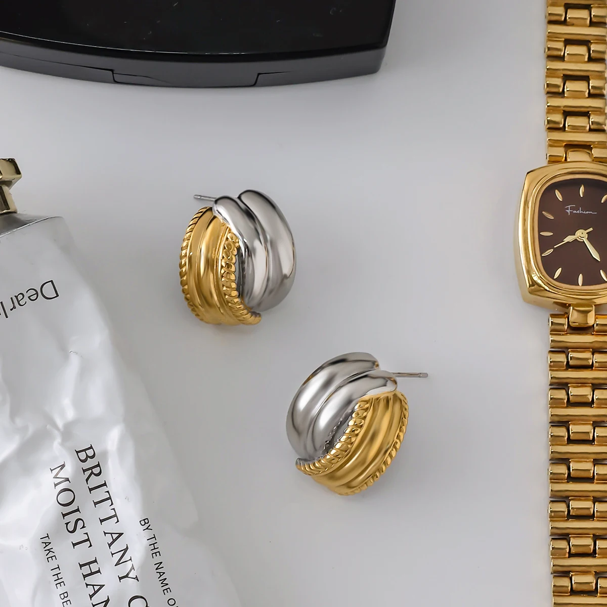 These trendy stainless steel stud earrings feature a minimalist hollow C-shape design with a polished platinum-colored finish, creating a sleek, modern look. The round shape pattern adds subtle elegance, while the push-back closure ensures secure wear. Designed for women, these fashion-forward earrings blend the sophistication of gold and silver tones, offering a versatile accessory that complements any outfit and enhances your everyday style with a contemporary touch.