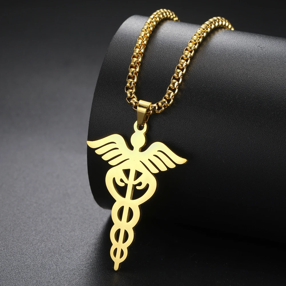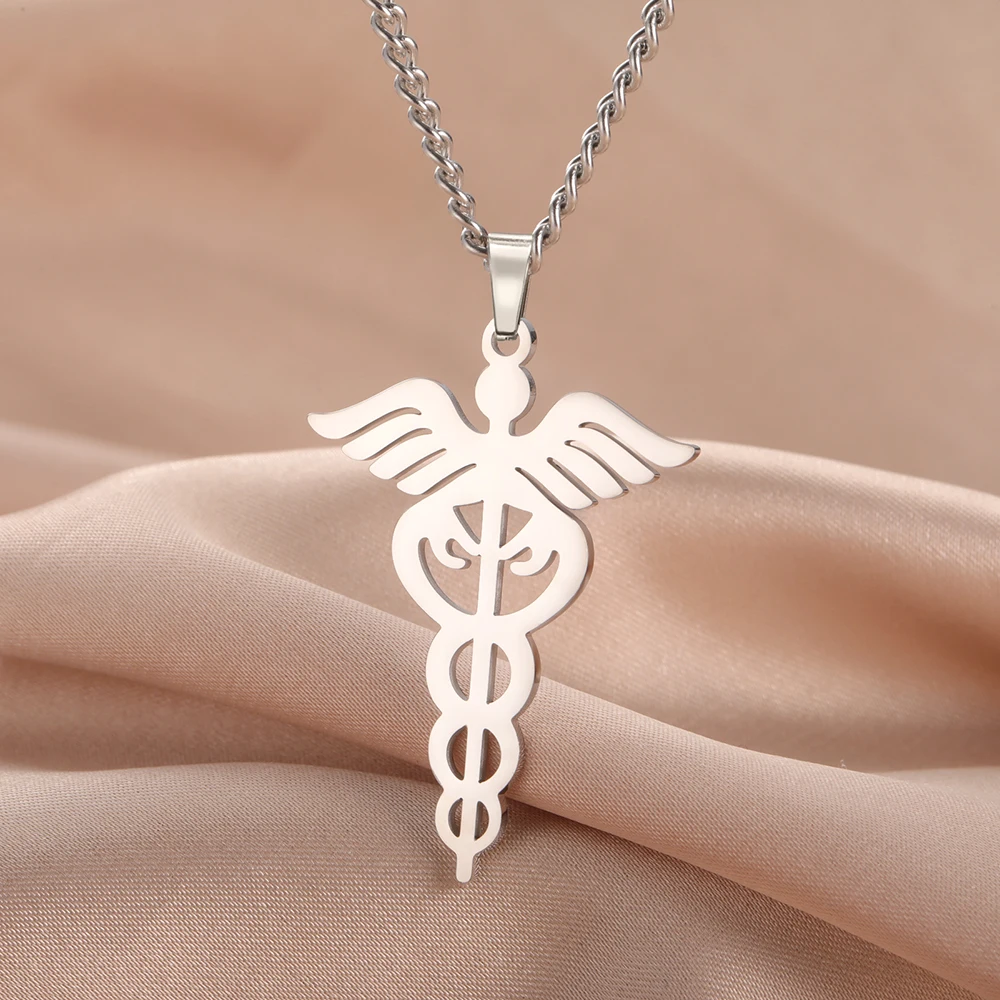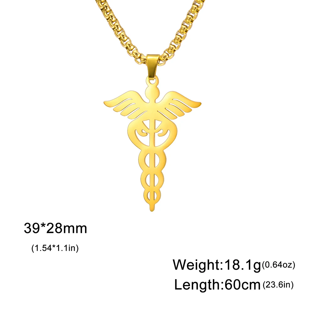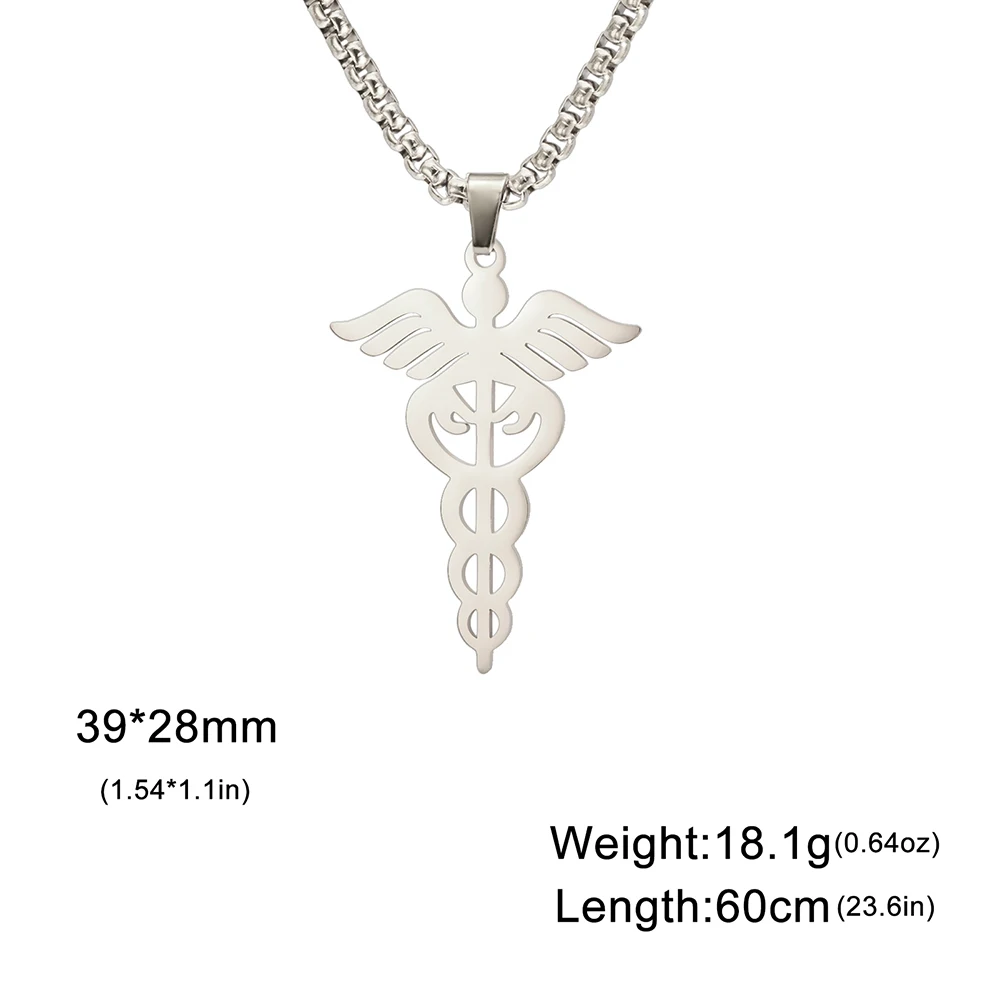 - Features a stainless steel pendant measuring 39mm by 28mm with detailed wing and snake design, symbolizing medicine and protection. The pendant’s smooth, polished surface adds elegance to any attire.