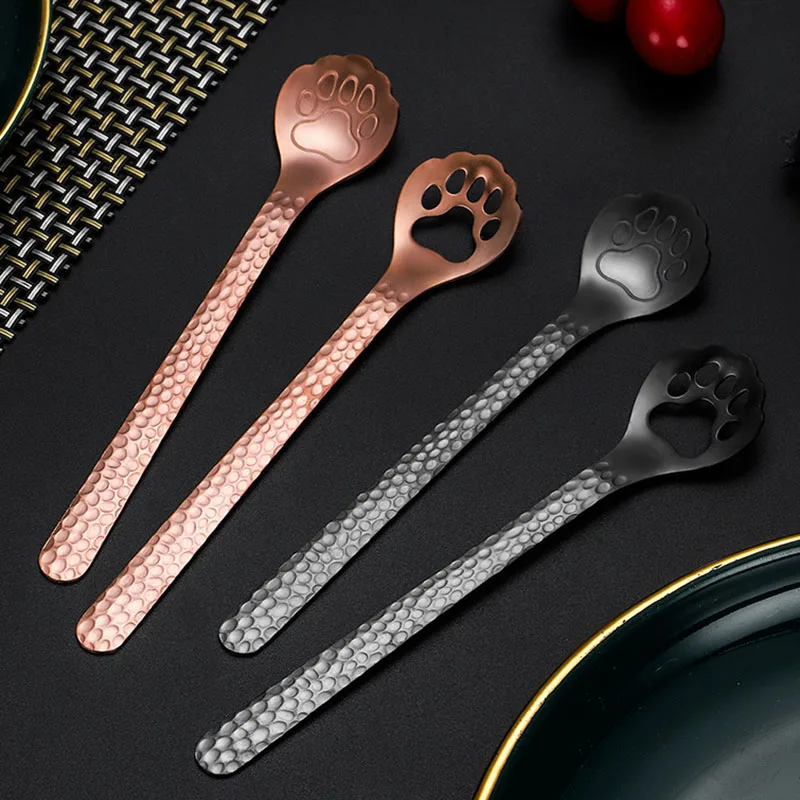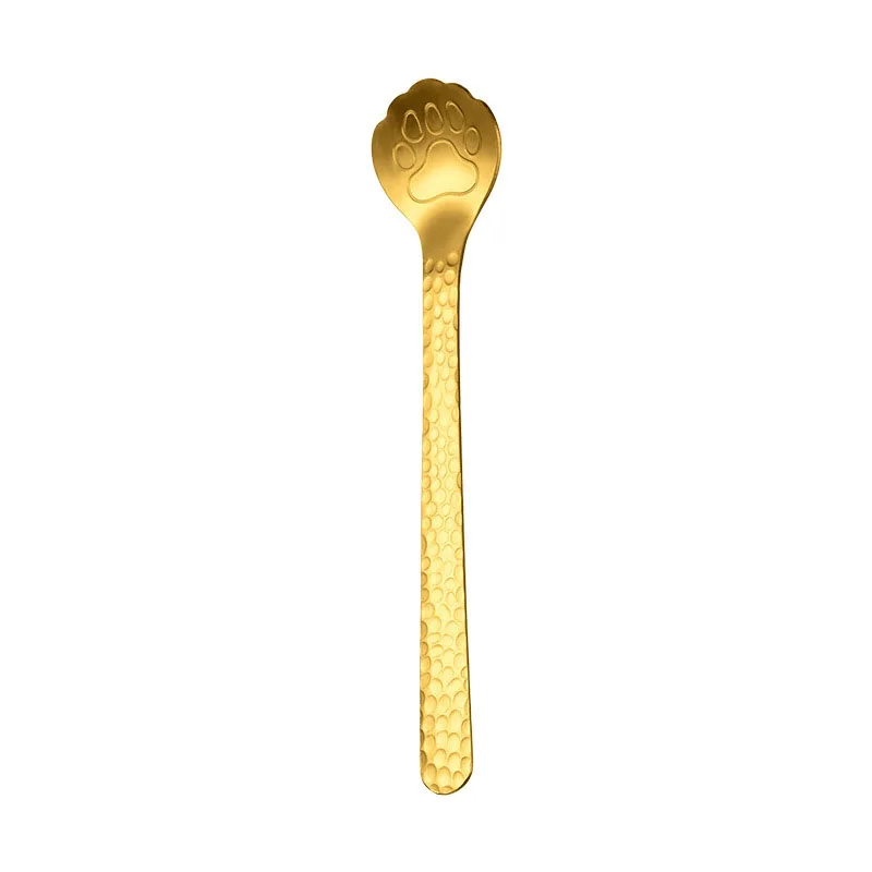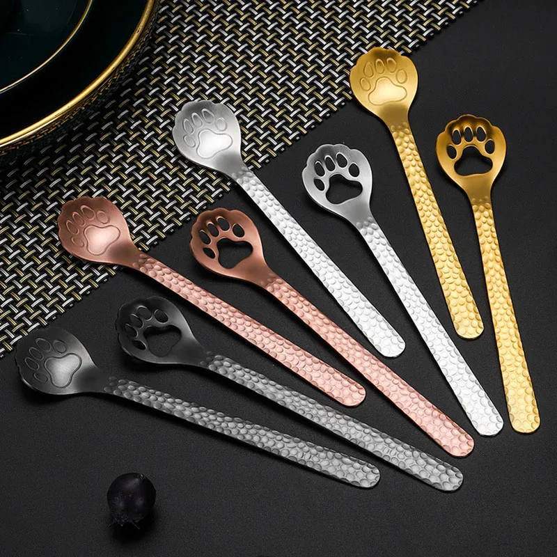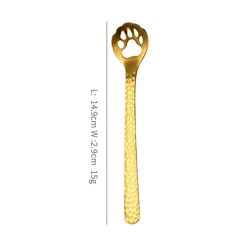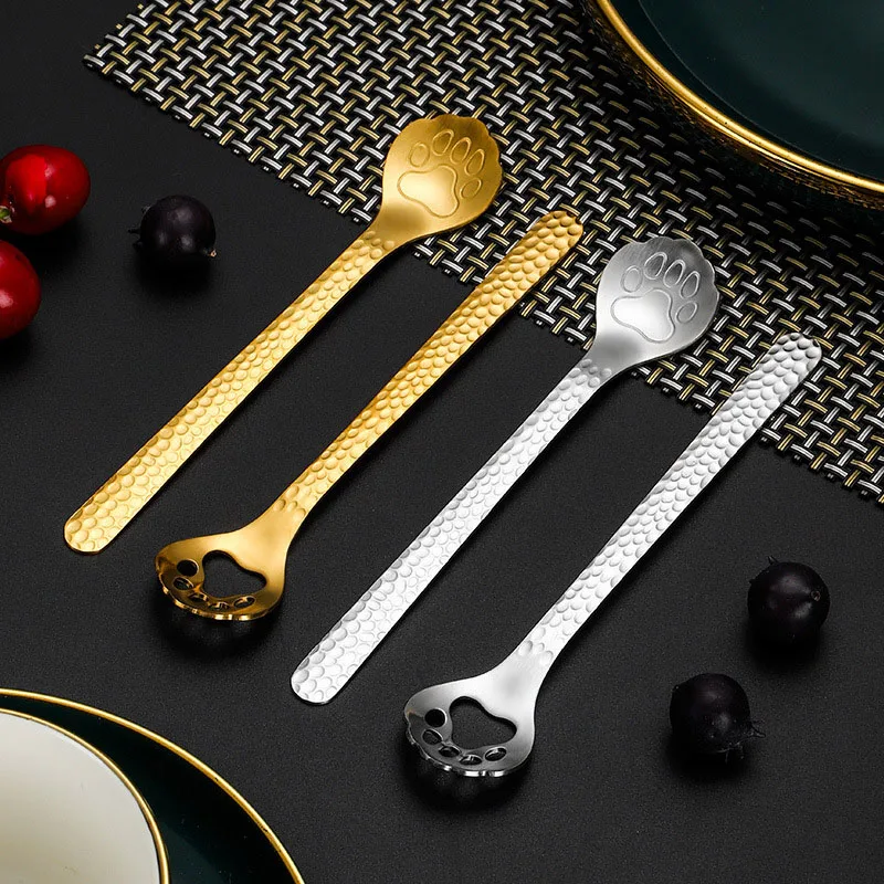 Experience the perfect blend of functionality and playful design with this stainless steel cat claw-shaped spoon. Made from high-quality 304 stainless steel, it features a hammered texture that adds elegance while ensuring durability. The hollow, claw-shaped head with five rounded openings makes scooping ice cream, peanut butter, or fruit effortless and fun. Measuring a standard size with smooth, safe edges, this versatile utensil is available in multiple finishes, including gold, rose gold, silver, black, and their slotted variants. Whether for daily use or creative dessert presentations, this stylish and practical spoon brings a unique touch to your kitchen.