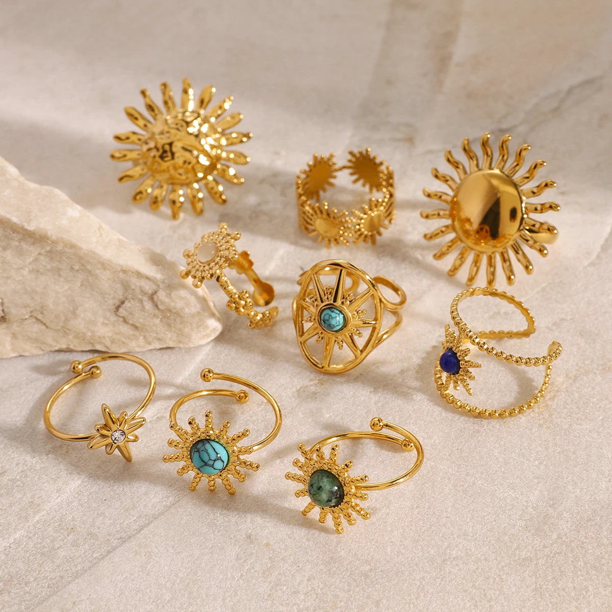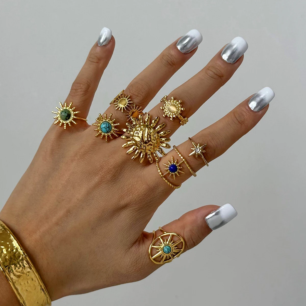- Each ring features eye-catching sunburst, star, or moon motifs, with some accented by vibrant turquoise or soft green stones, surrounded by miniature gold sun rays for added brilliance.