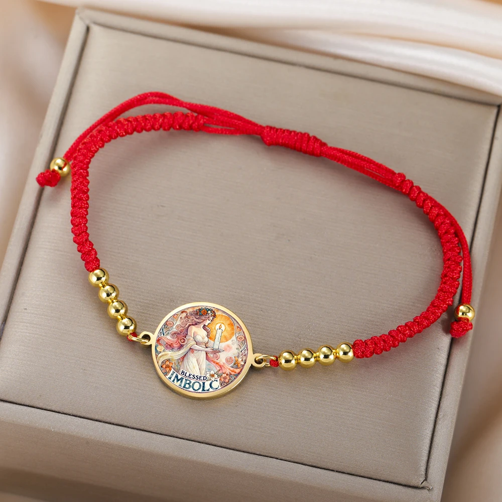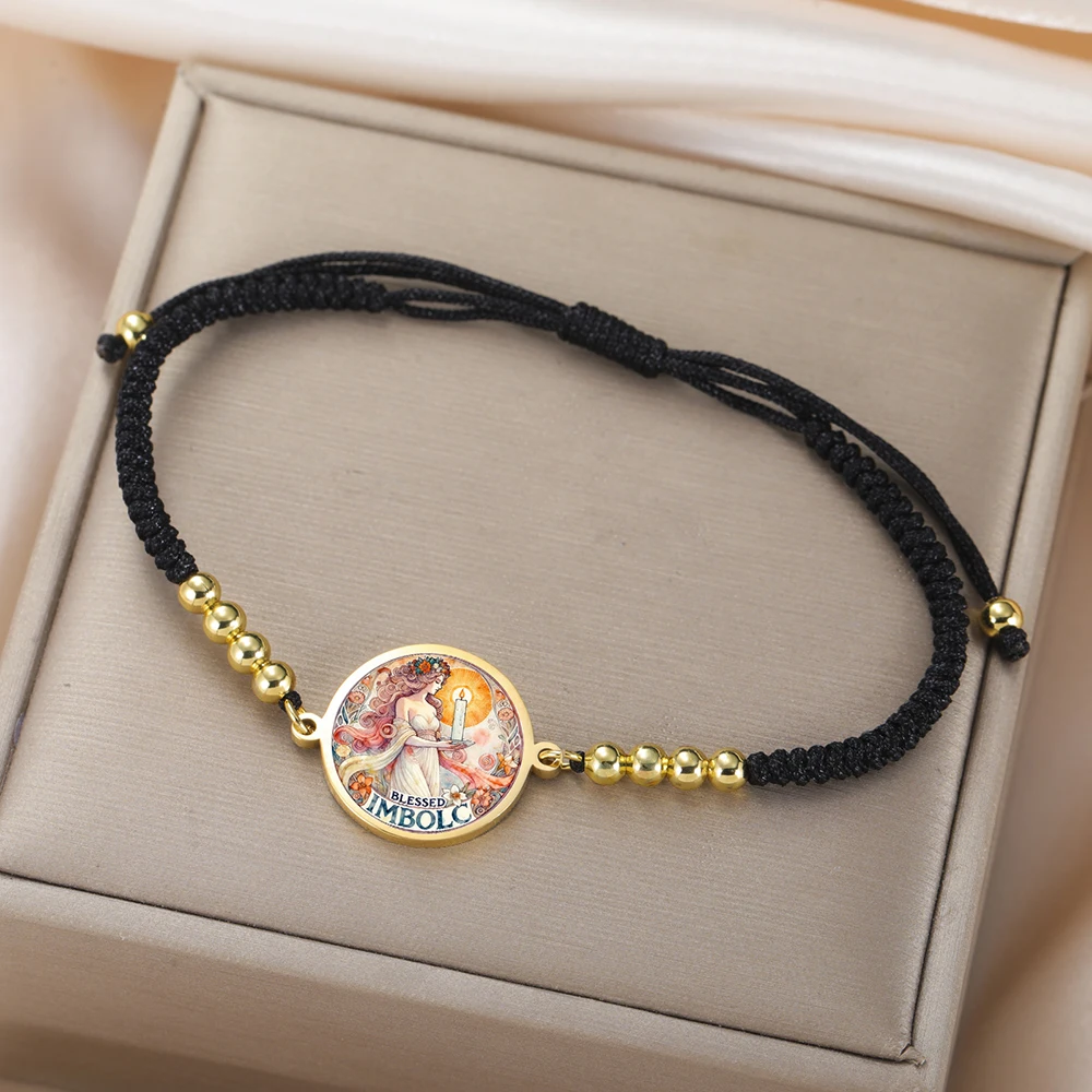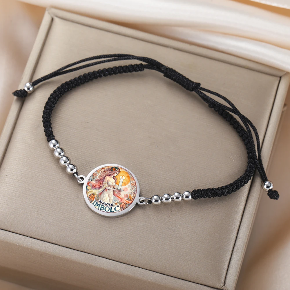 Imagine yourself wearing this striking Celtic-inspired bracelet, symbolizing new beginnings and cultural traditions. Crafted with a vibrant, multicolored graphic of a female figure holding a candle, it pays homage to Imbolc and the goddess Brigid. The central charm, measuring approximately 19 x 24 mm, is framed by a sleek stainless steel border that adds durability and a metallic shine. The woven or braided rope chain, available in steel, gold, black steel, and black gold, provides a bold, colorful backdrop. Shiny metallic beads evenly spaced along the chain enhance its polished look. Adjustable for a perfect fit, with a toggle clasp securing your new favorite accessory, this bracelet blends tradition, style, and symbolism seamlessly.