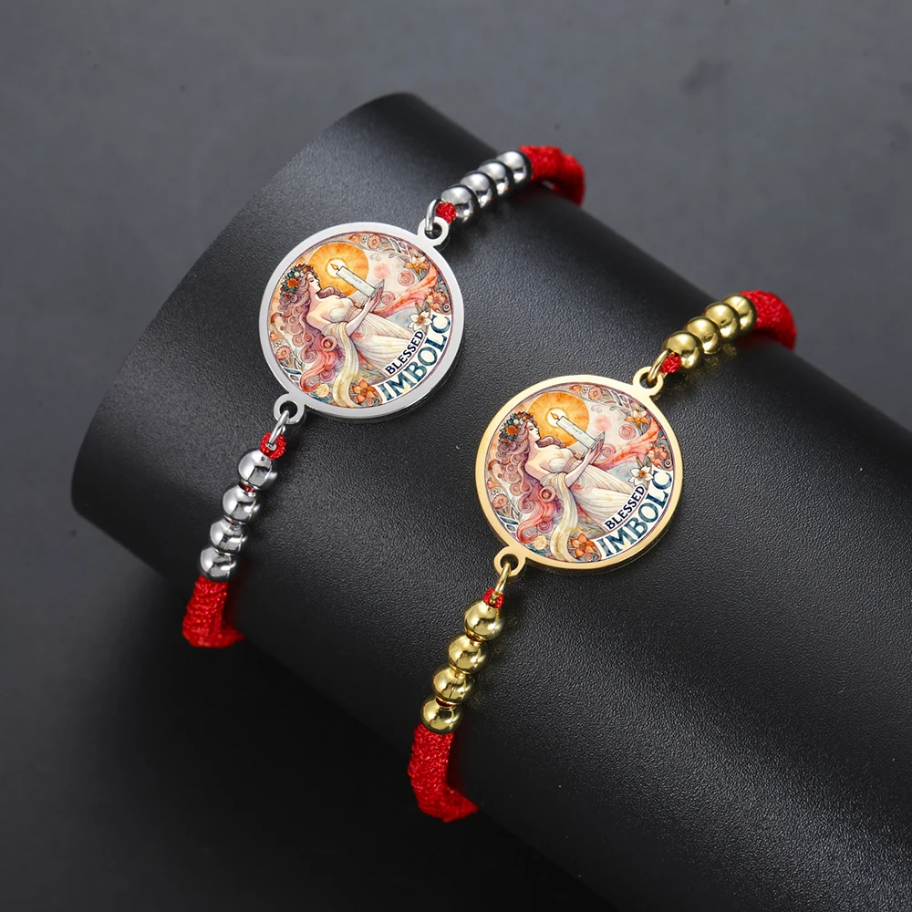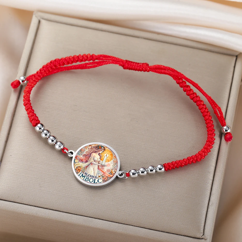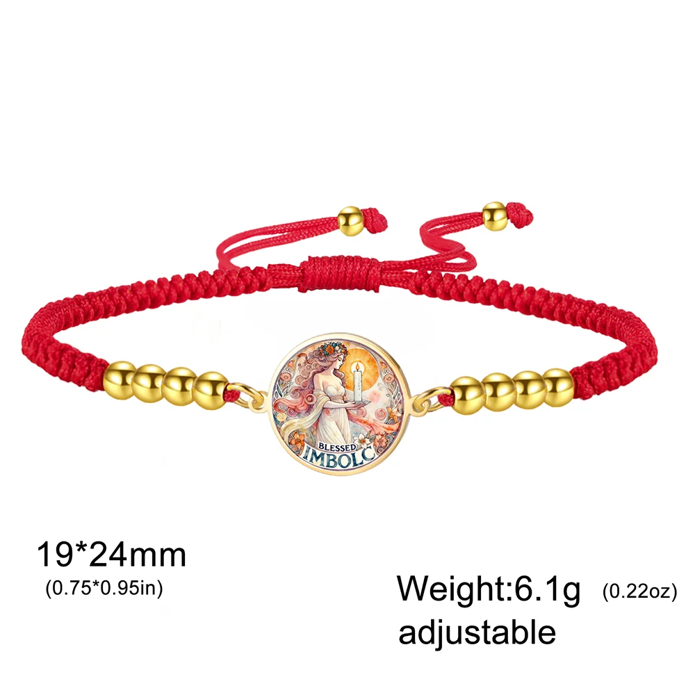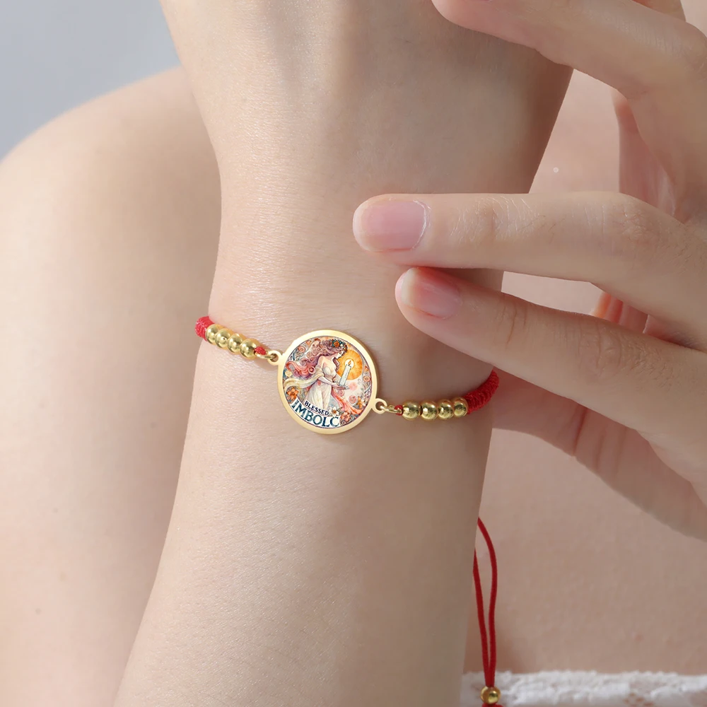 Imagine yourself wearing this striking Celtic-inspired bracelet, symbolizing new beginnings and cultural traditions. Crafted with a vibrant, multicolored graphic of a female figure holding a candle, it pays homage to Imbolc and the goddess Brigid. The central charm, measuring approximately 19 x 24 mm, is framed by a sleek stainless steel border that adds durability and a metallic shine. The woven or braided rope chain, available in steel, gold, black steel, and black gold, provides a bold, colorful backdrop. Shiny metallic beads evenly spaced along the chain enhance its polished look. Adjustable for a perfect fit, with a toggle clasp securing your new favorite accessory, this bracelet blends tradition, style, and symbolism seamlessly.