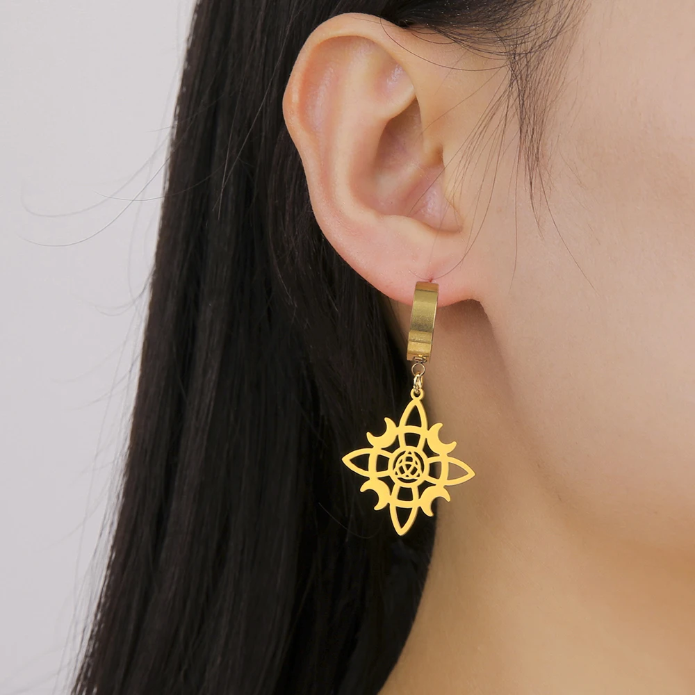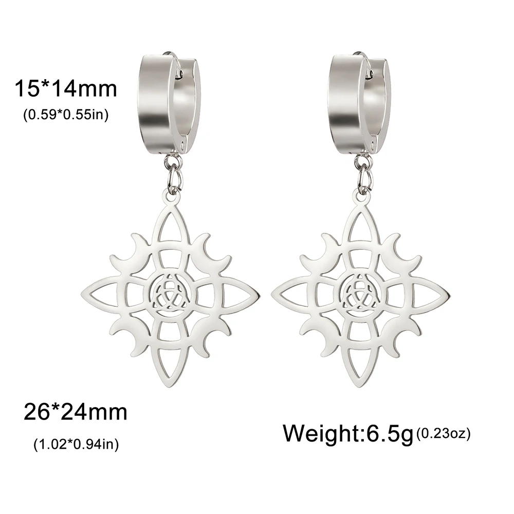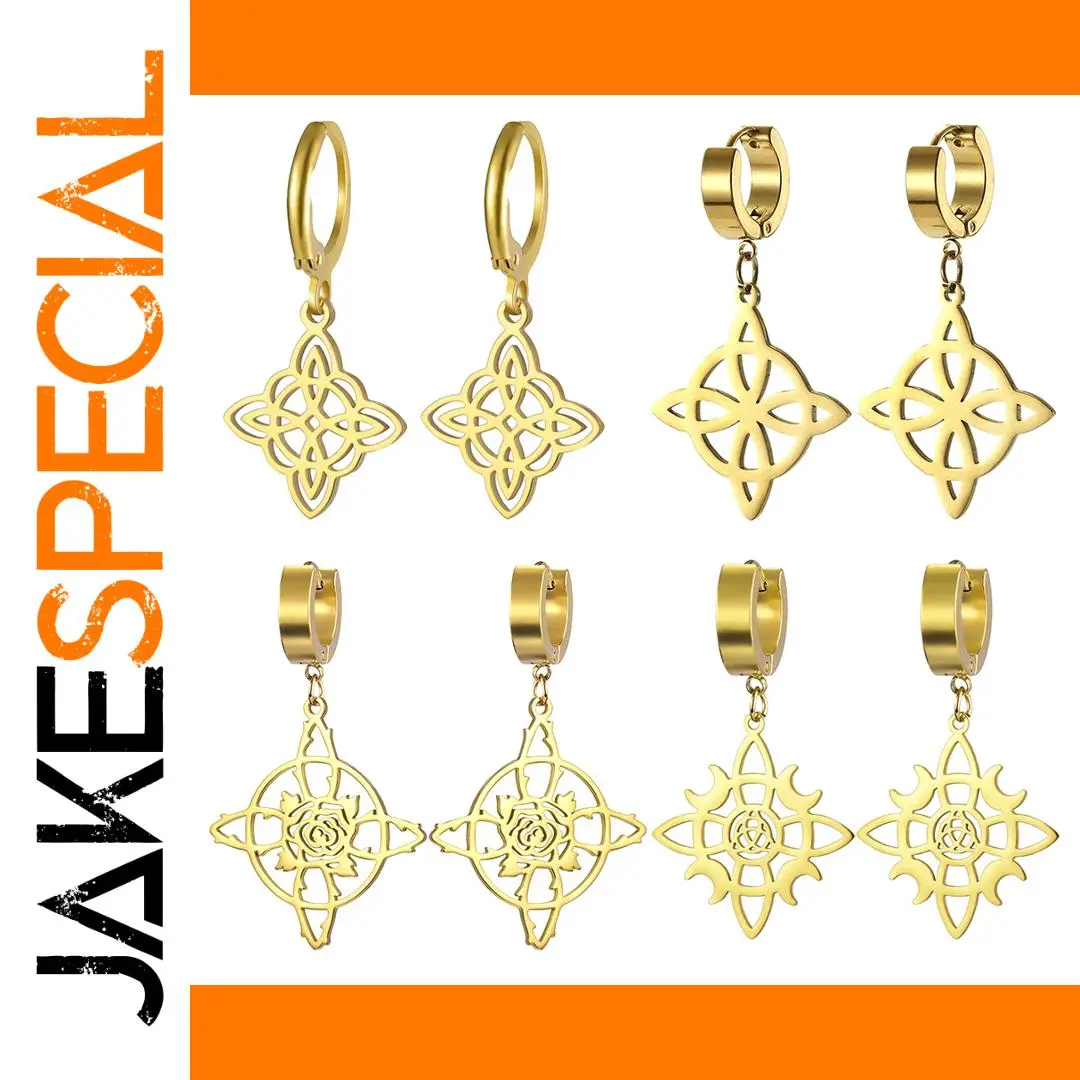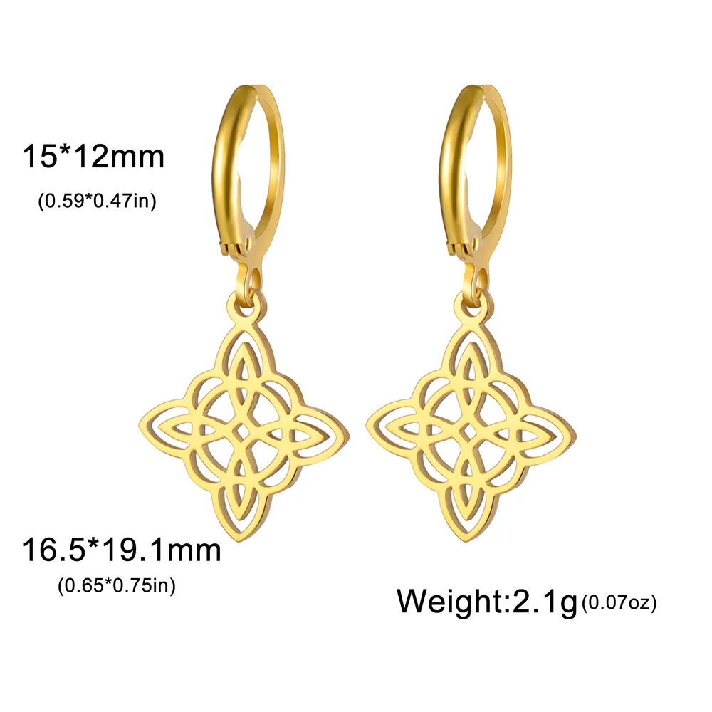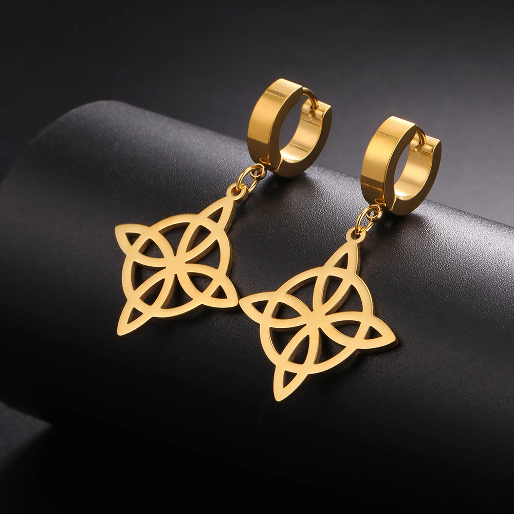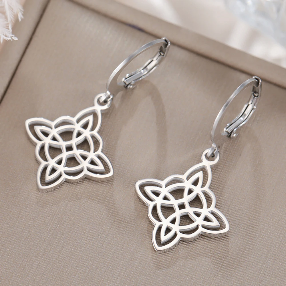 Discover the timeless beauty of these stainless steel Celtic Knot earrings, crafted with intricate Wiccan-inspired designs that symbolize protection and good luck. Featuring detailed knot motifs—ranging from symmetrical diamond and quatrefoil shapes to star-like and floral patterns—these earrings blend mystic symbolism with fashion-forward style. The shiny finish highlights the craftsmanship, making them an eye-catching accessory for any occasion. Presented in versatile color options, including classic steel and elegant gold, these earrings are suitable for both men and women. Their geometric and organic motifs evoke a sense of harmony and spiritual significance, adding a mystical touch to your everyday or special ensemble. With their durable stainless steel construction, they promise long-lasting brilliance and comfort.