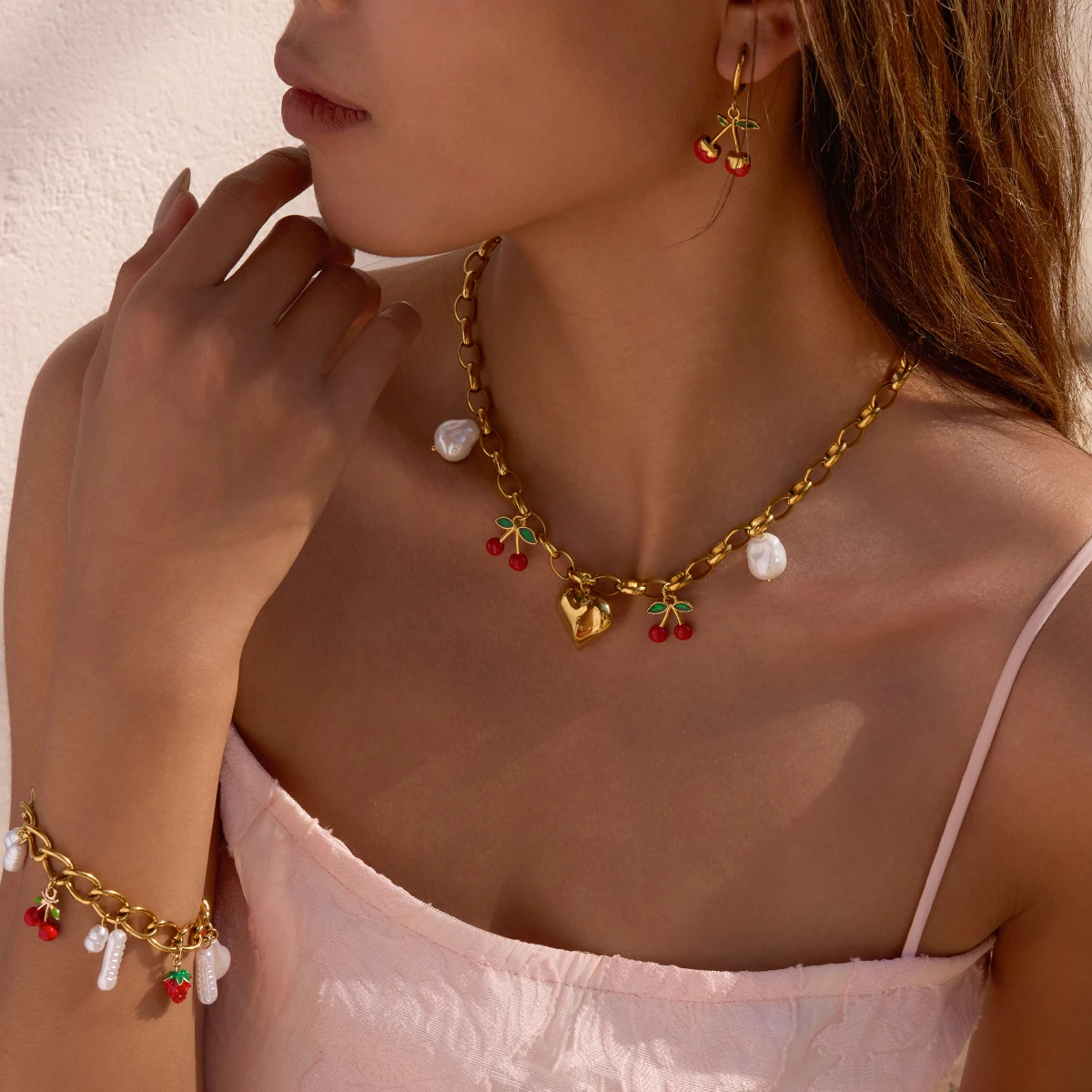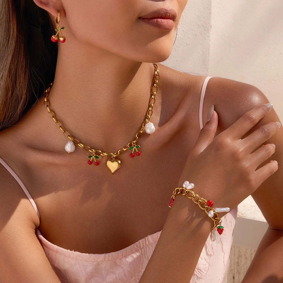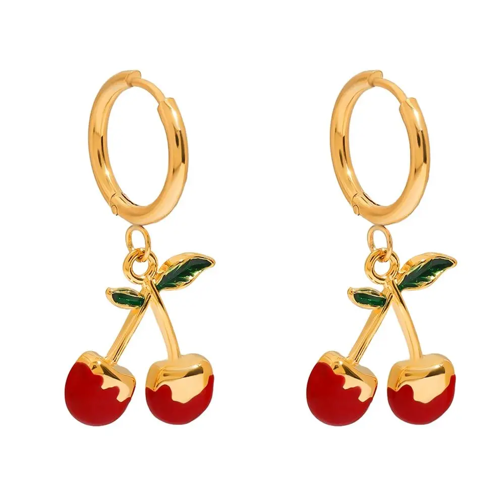 Enhance your style with these stainless steel “Sweet Cherry” stud earrings (model JDE0112056), featuring a vibrant red cherry motif with glossy, smooth surfaces. The design includes gold-colored stems and slender green leaves with subtle gold accents, creating a cheerful and realistic plant-inspired look. Compact and lightweight, these hypoallergenic earrings are approximately standard size for studs, with a secure push-back closure for comfortable all-day wear. Crafted from waterproof stainless steel, they are ideal for sensitive skin and durable enough for daily use. Perfect for adding a playful and fashionable touch to casual or elegant outfits, these earrings promise both style and reliability.