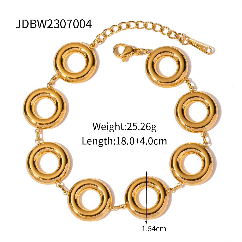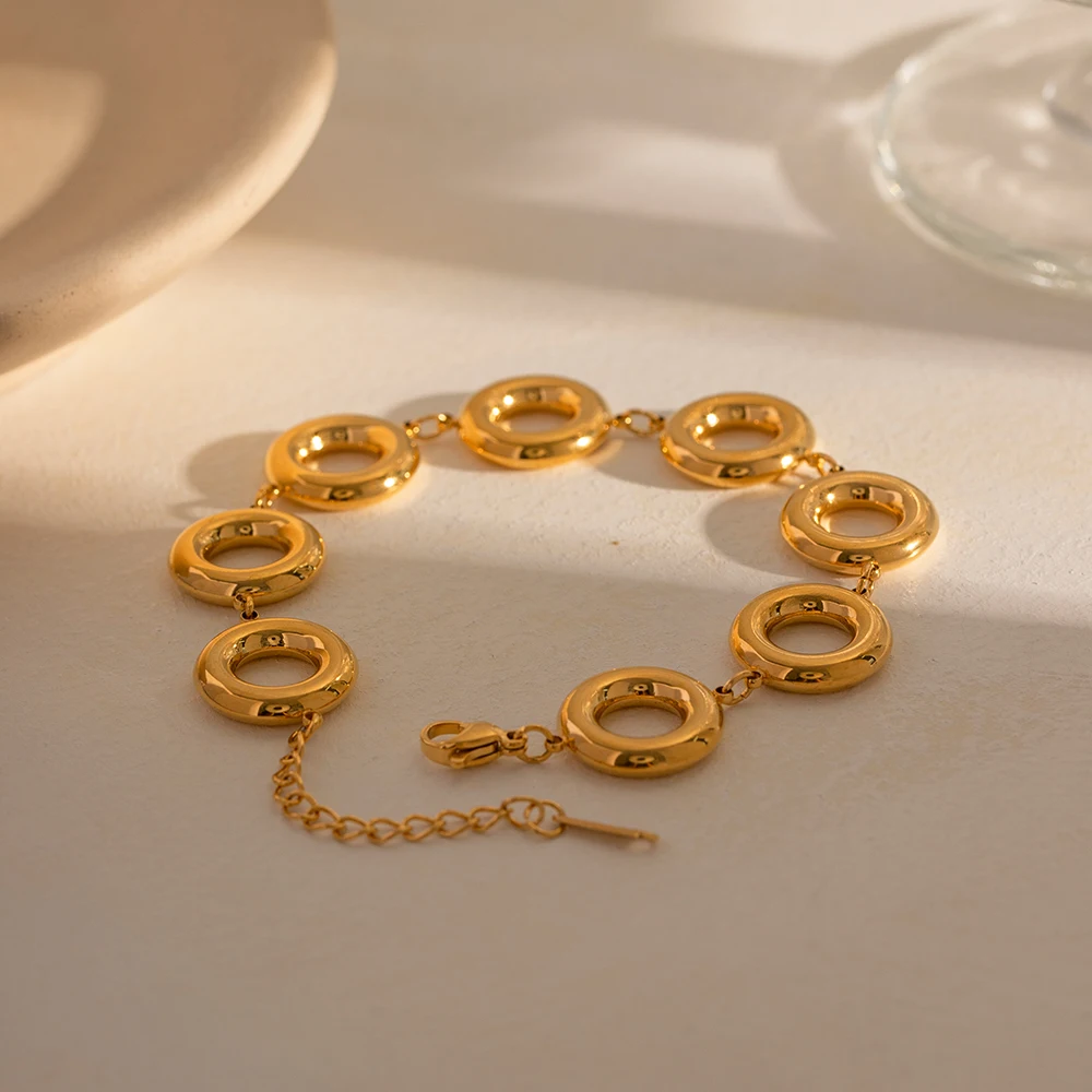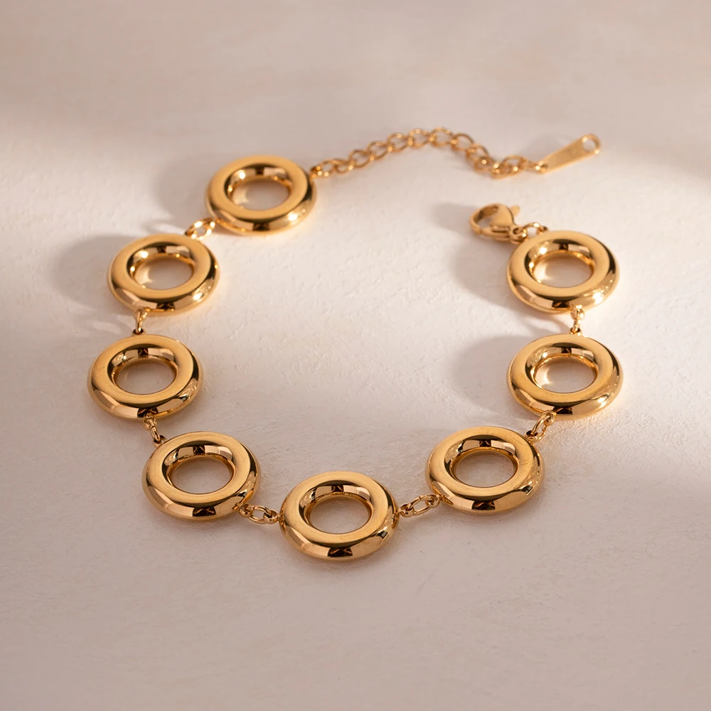Elevate your style with this modern circular bracelet, crafted from high-quality stainless steel with a luxurious gold finish. Its glossy surface catches light beautifully, adding a touch of sophistication to any outfit. The bold, large, hollow round links are arranged in a sleek chain pattern, creating a minimalist yet eye-catching design suitable for both casual and formal occasions. The adjustable lobster-claw clasp ensures a comfortable fit, accommodating all wrist sizes. Designed for durability, this bracelet is waterproof and resistant to daily wear and tear, making it an ideal accessory for active lifestyles. Its contemporary aesthetic makes it versatile enough to complement any look, reflecting confidence and refined taste in every detail.