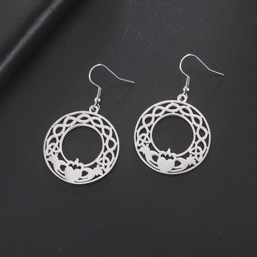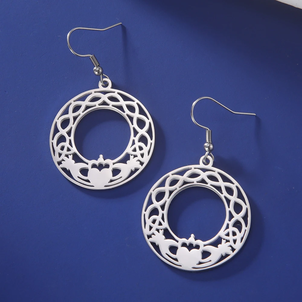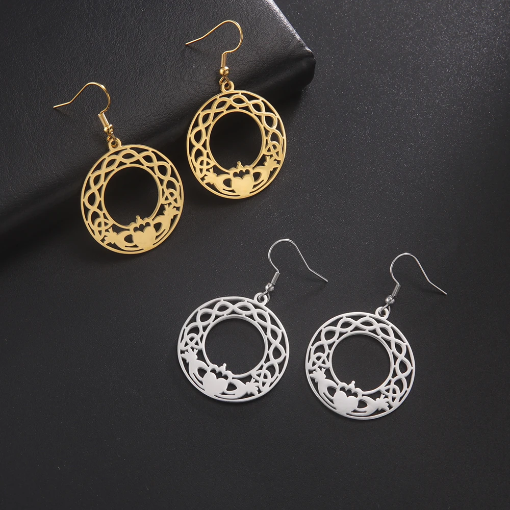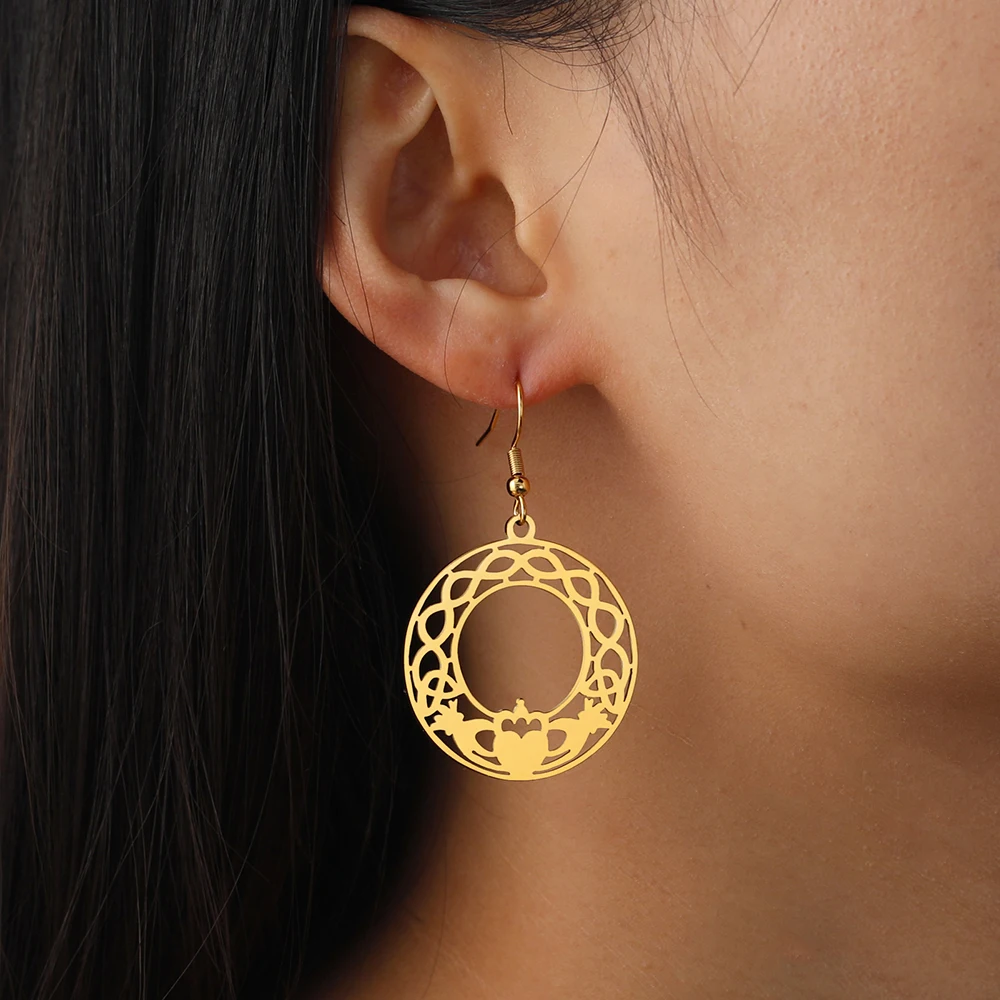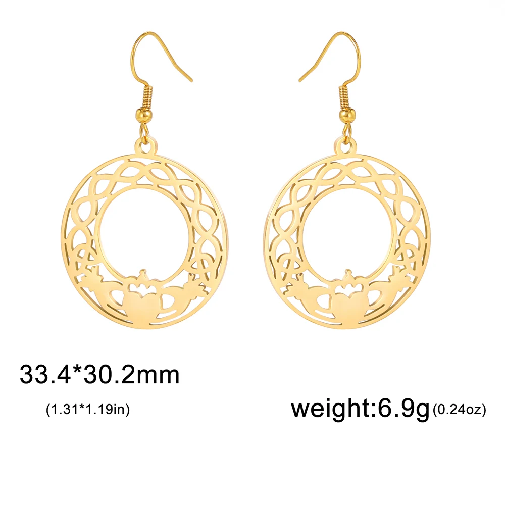 Experience timeless elegance with these stainless steel drop earrings featuring the classic Claddagh design. Available in steel and gold colors, each earring showcases a round openwork motif with intricate Celtic patterns, a central heart topped with a crown, symbolizing loyalty, love, and friendship. Crafted from durable, hypoallergenic stainless steel, they are perfect for unisex wear—men, women, and couples alike. Their polished, reflective surface and detailed craftsmanship capture Irish heritage with a modern touch. These fashion earrings combine tradition and style, making them an ideal accessory to elevate any look and add a meaningful, personal touch to your jewelry collection.