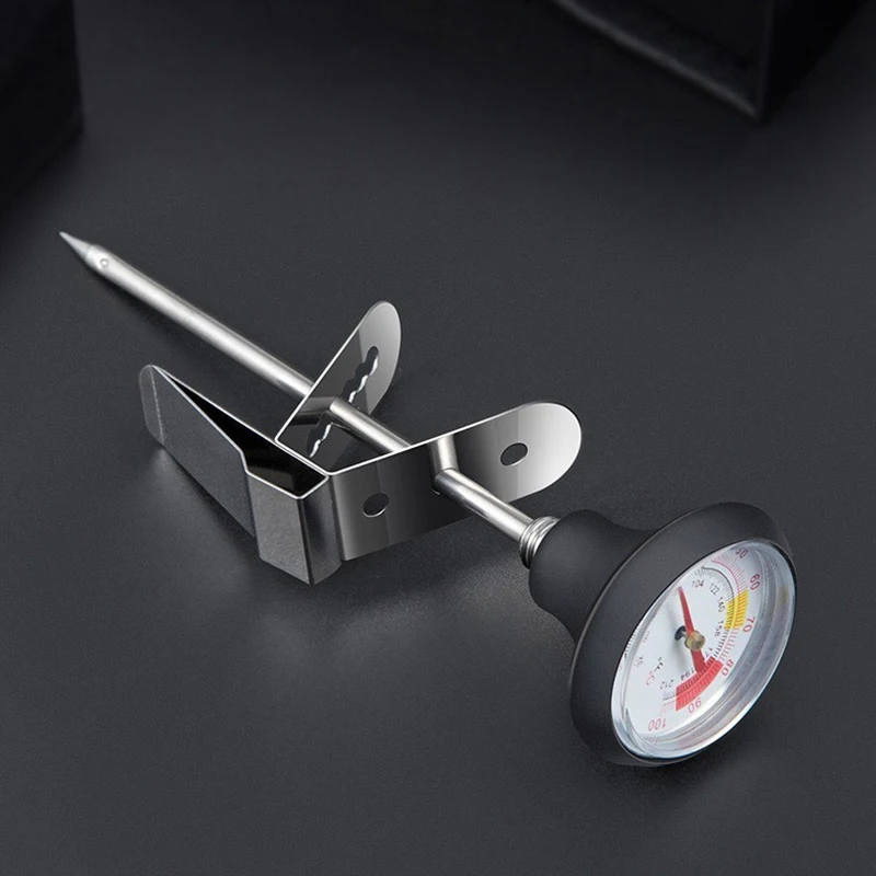 Experience precise coffee and beverage temperature measurement with this sleek stainless steel probe. Designed for professional and home brewing, its durable 304 stainless steel construction ensures longevity and resistance to heat and corrosion. The slim, pointed probe extends 135mm tall with a 37mm diameter, making it easy to insert into cups, pots, or jugs without disturbance. The clear dial face, measuring just 4mm, features a black housing with bold graduations from 0°C to 100°C, and a vivid red needle for quick reading. The integrated stainless steel clamp allows secure attachment to various containers, providing stability and ease of use. Its minimalist design combines functionality with a professional aesthetic, perfect for precise temperature control during coffee preparation or milk frothing. Lightweight and battery-free, this thermometer is a must-have for every kitchen or cafe setting.