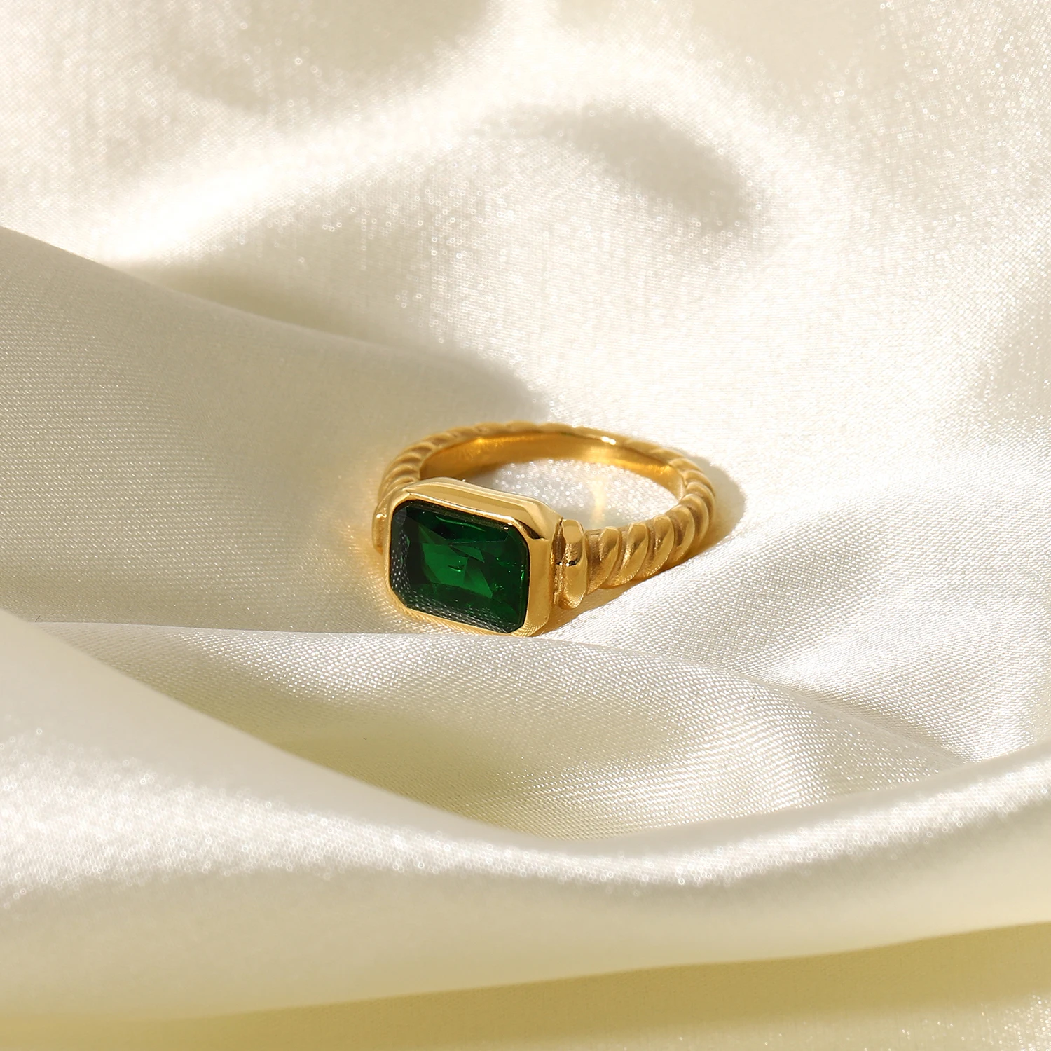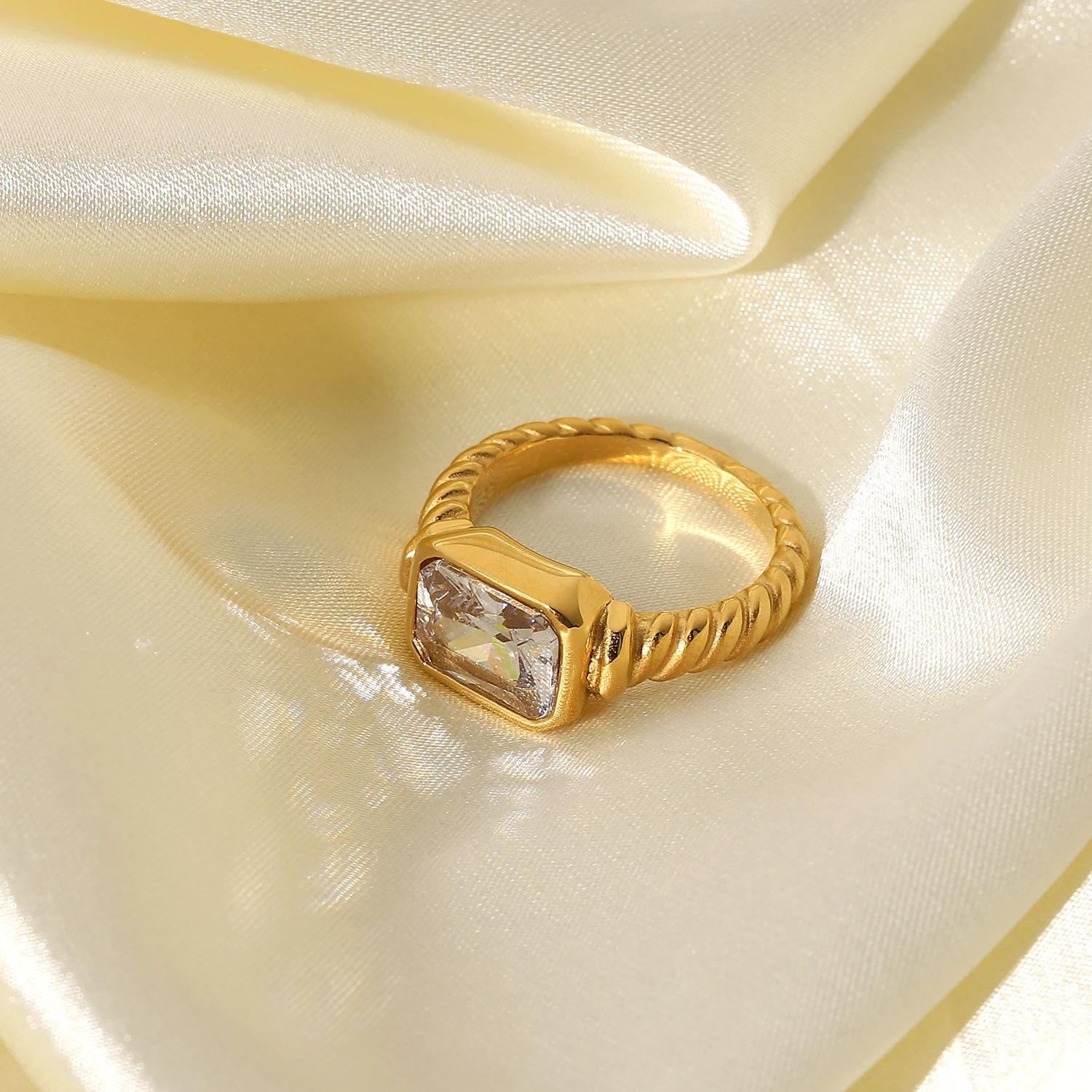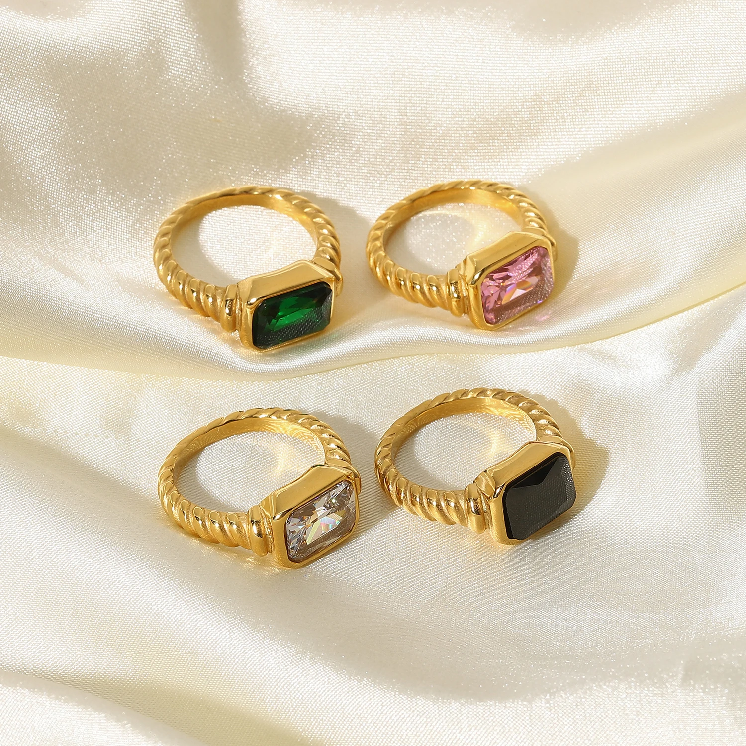 This stainless steel ring features a polished gold finish and a textured, twisted spiral band, blending modern geometric style with elegance. It showcases a faceted rectangular emerald zircon stone available in vibrant green, soft pink, sleek black, pink-s, and clear options, adding brilliance and color contrast. Designed for durability and versatile wear, it comes in sizes 6, 7, and 8, making it perfect for both everyday accessories and special occasions. The contemporary angular design and sparkling gemstones create a bold, fashionable statement, reflecting a sophisticated yet trendy aesthetic. Elevate your jewelry collection with this striking, long-lasting piece.