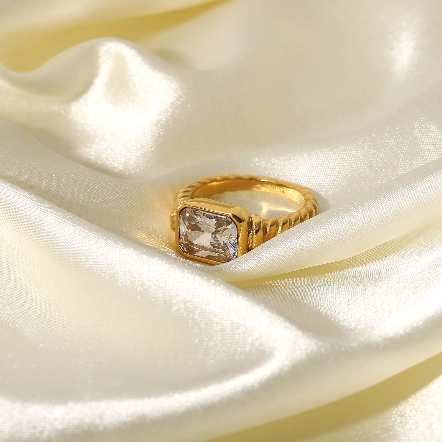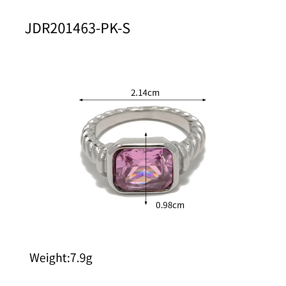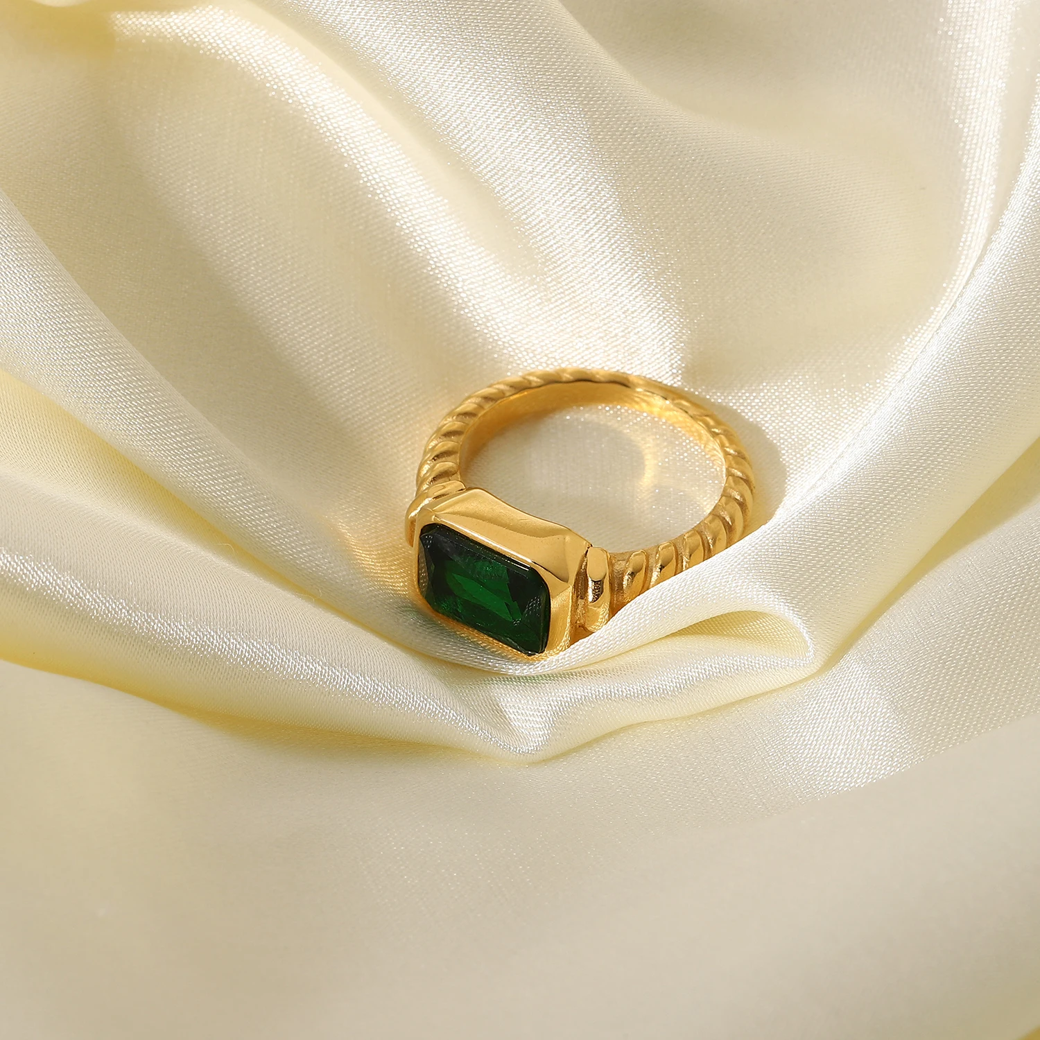 This stainless steel ring features a polished gold finish and a textured, twisted spiral band, blending modern geometric style with elegance. It showcases a faceted rectangular emerald zircon stone available in vibrant green, soft pink, sleek black, pink-s, and clear options, adding brilliance and color contrast. Designed for durability and versatile wear, it comes in sizes 6, 7, and 8, making it perfect for both everyday accessories and special occasions. The contemporary angular design and sparkling gemstones create a bold, fashionable statement, reflecting a sophisticated yet trendy aesthetic. Elevate your jewelry collection with this striking, long-lasting piece.