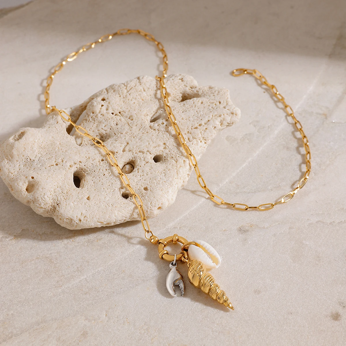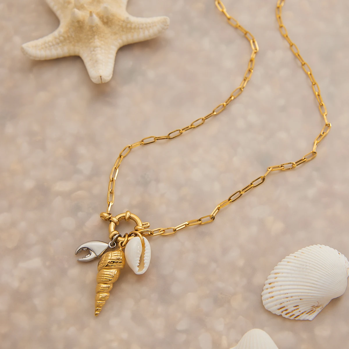 - Features a textured conch shell-shaped pendant and small charms resembling a mussel shell and crab claw, emphasizing nautical and beach themes.