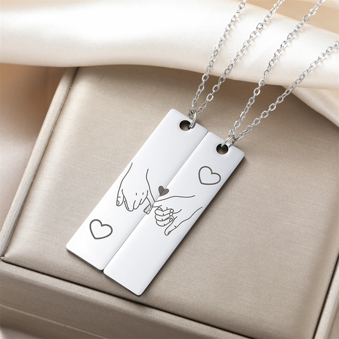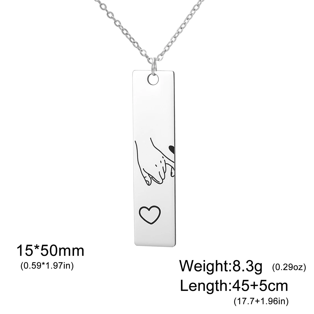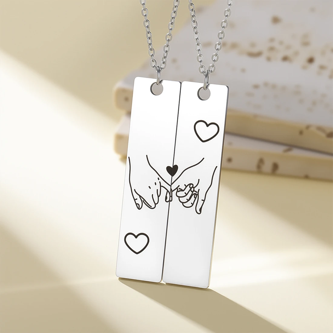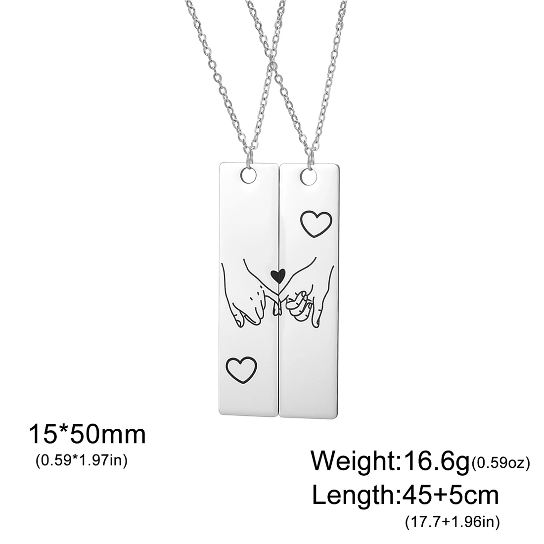 Imagine gifting or wearing a piece that symbolizes your bond, capturing your love in a sleek, modern design. These couple holding hands necklaces feature polished stainless steel pendants measuring 15mm by 50mm, adorned with minimalist black line art of two hands clasped, topped with a delicate heart outline. Their smooth, geometric design exudes contemporary elegance while echoing vintage charm. The sturdy link chain, adjustable between 45 and 50cm, complements the pendant’s polished finish, available in both silver and gold to suit your style. Hypoallergenic and resistant to rust, acids, and alkali, these necklaces maintain their appearance over time, making them perfect tokens for anniversaries, weddings, or everyday expressions of love.
