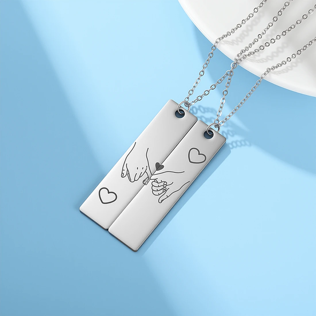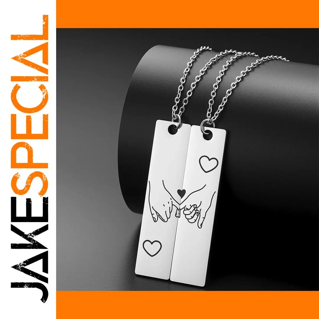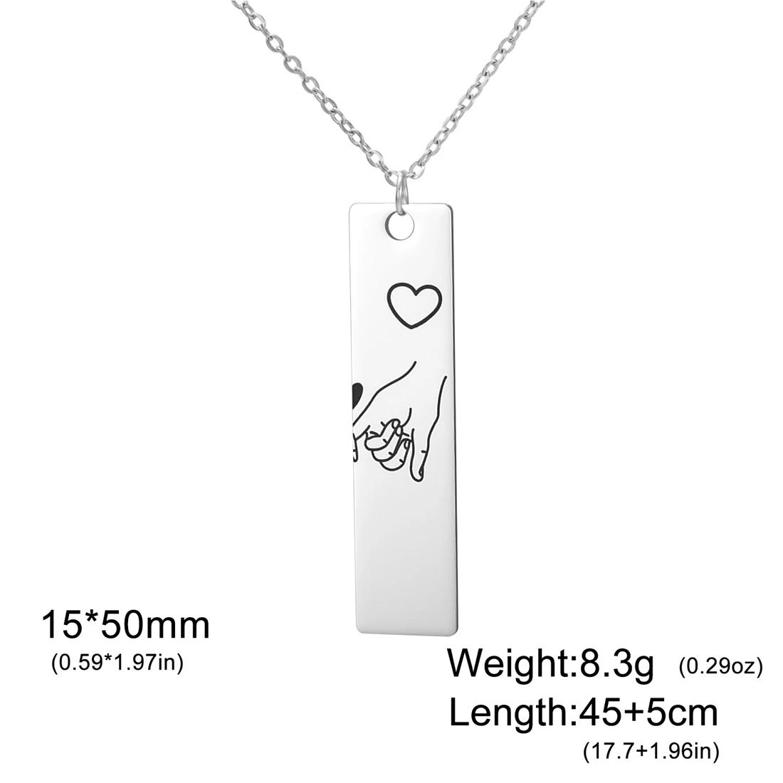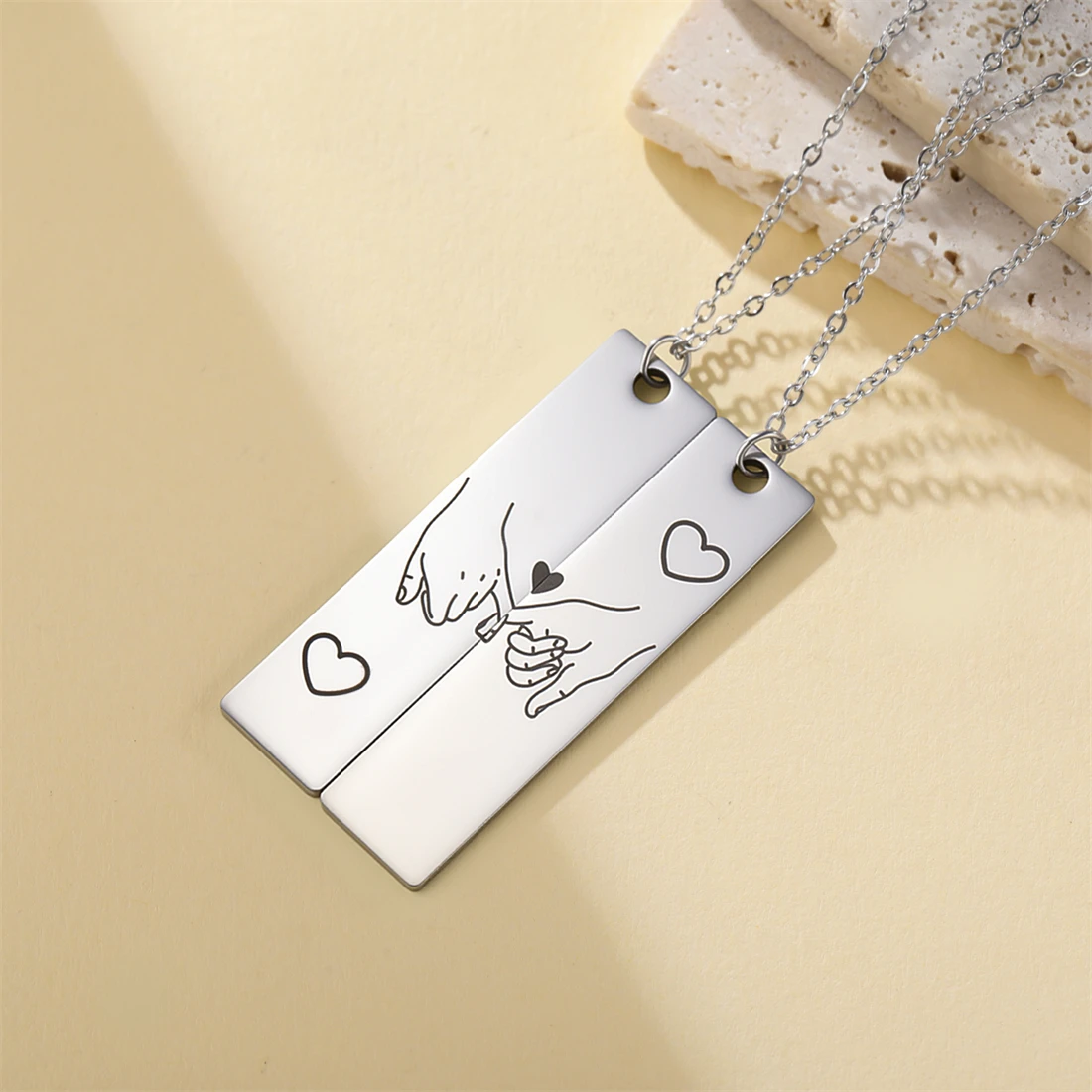 Imagine gifting or wearing a piece that symbolizes your bond, capturing your love in a sleek, modern design. These couple holding hands necklaces feature polished stainless steel pendants measuring 15mm by 50mm, adorned with minimalist black line art of two hands clasped, topped with a delicate heart outline. Their smooth, geometric design exudes contemporary elegance while echoing vintage charm. The sturdy link chain, adjustable between 45 and 50cm, complements the pendant’s polished finish, available in both silver and gold to suit your style. Hypoallergenic and resistant to rust, acids, and alkali, these necklaces maintain their appearance over time, making them perfect tokens for anniversaries, weddings, or everyday expressions of love.