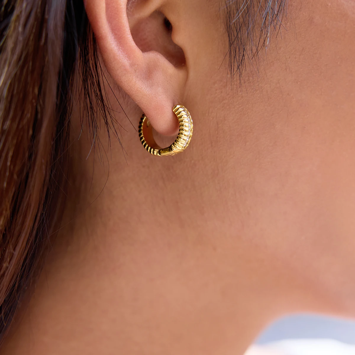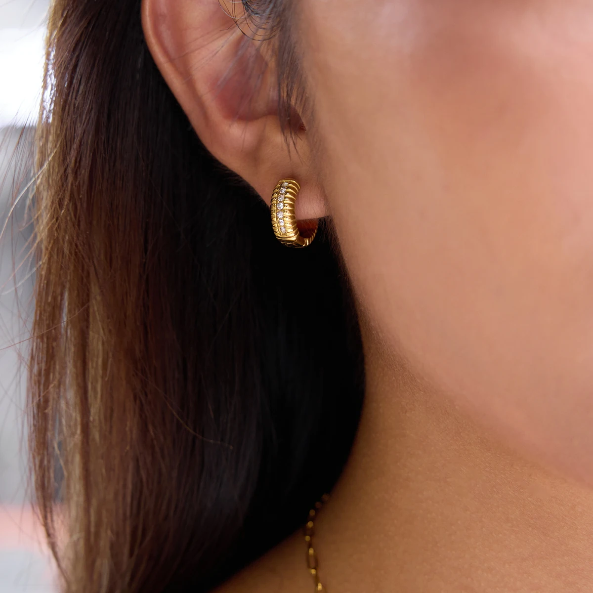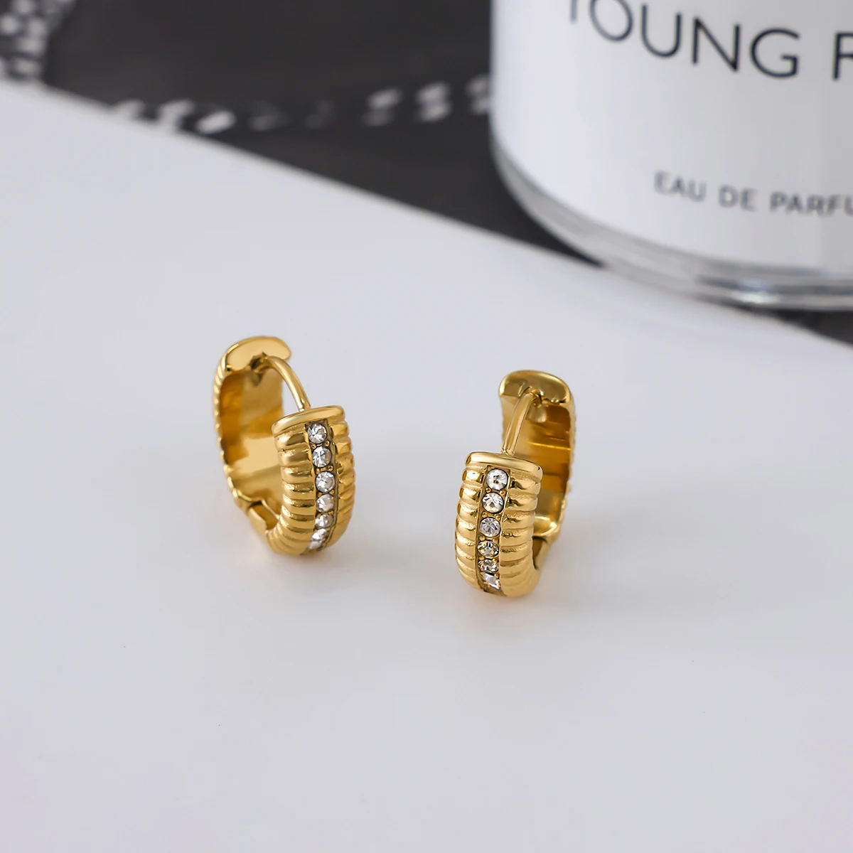 Elevate your accessory game with this pair of this fashionable stainless steel clip earrings. Designed to blend minimalist elegance with trendy details, they are perfect for daily wear or special occasions. Crafted from high-quality stainless steel with a shiny, gold-tone finish, these statement earrings feature a round, clear crystal centerpiece that adds a sparkling focal point. Their textured, ridged outer edge introduces visual interest and tactile appeal, making them both eye-catching and comfortable. The adjustable clip mechanism ensures a secure, comfortable fit for pierced or non-pierced ears. Lightweight yet durable, these earrings promise long-lasting shine, skin safety, and versatility—an essential addition to any jewelry collection that complements a range of styles.