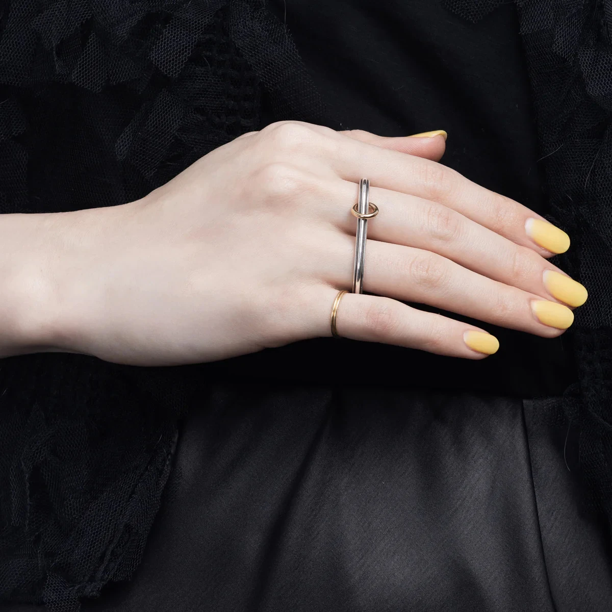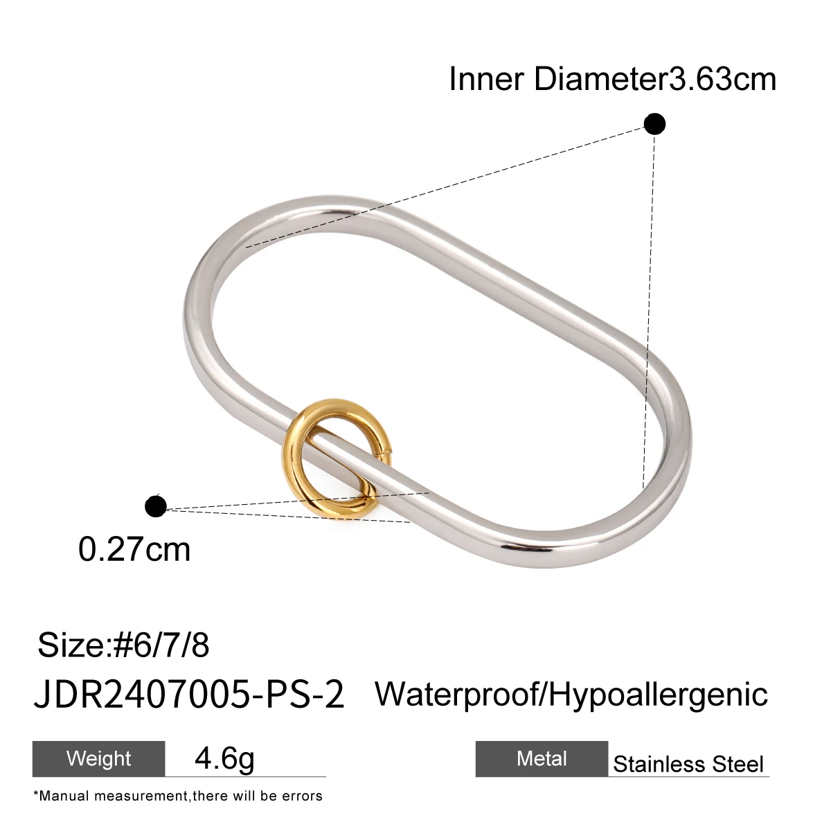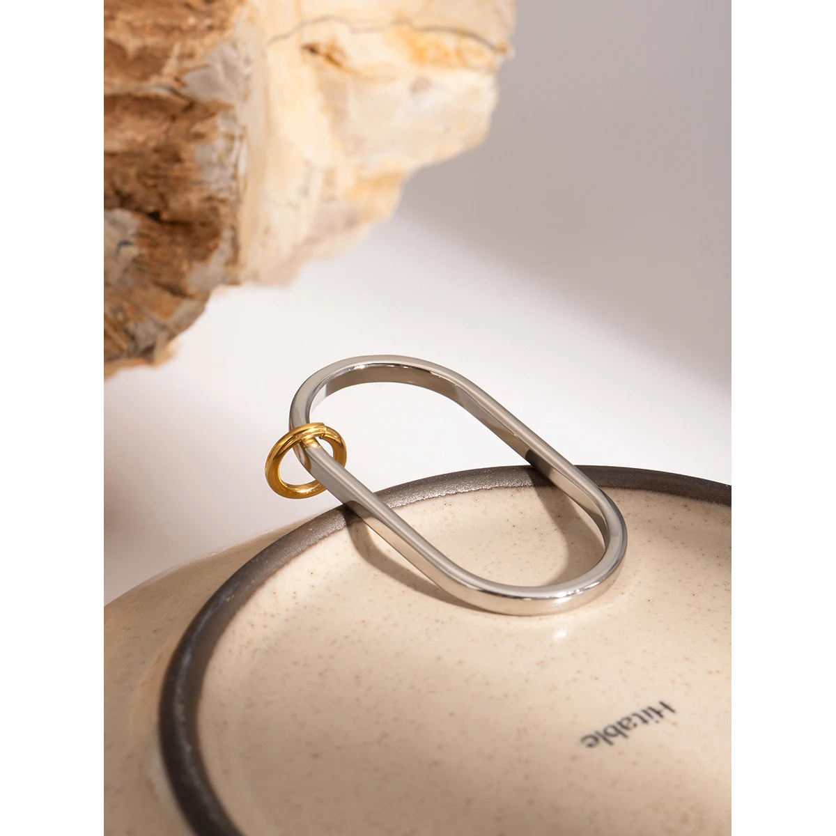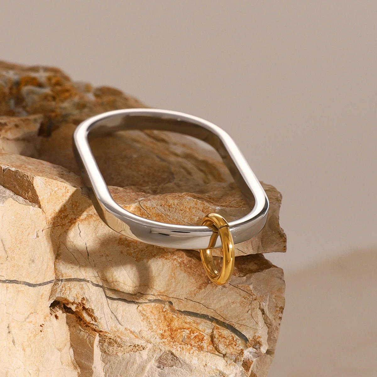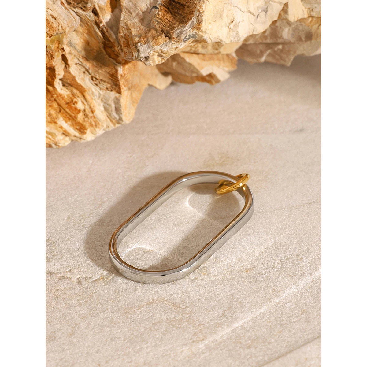 Elevate your style with this stainless steel double finger ring featuring a sleek, minimalist design and geometric pattern. Weighing approximately 15 grams, it offers durable, scratch-resistant, and long-lasting color through PVD gold or silver plating. Its waterproof construction ensures everyday practicality, while the modern, elongated oval shape and contrasting shiny gold circular accent add a touch of elegance and sophistication. Free of nickel, lead, and cadmium, this versatile piece is perfect for daily wear or making a statement, blending contemporary chic with high-quality craftsmanship for a stunning accessory that complements any look.