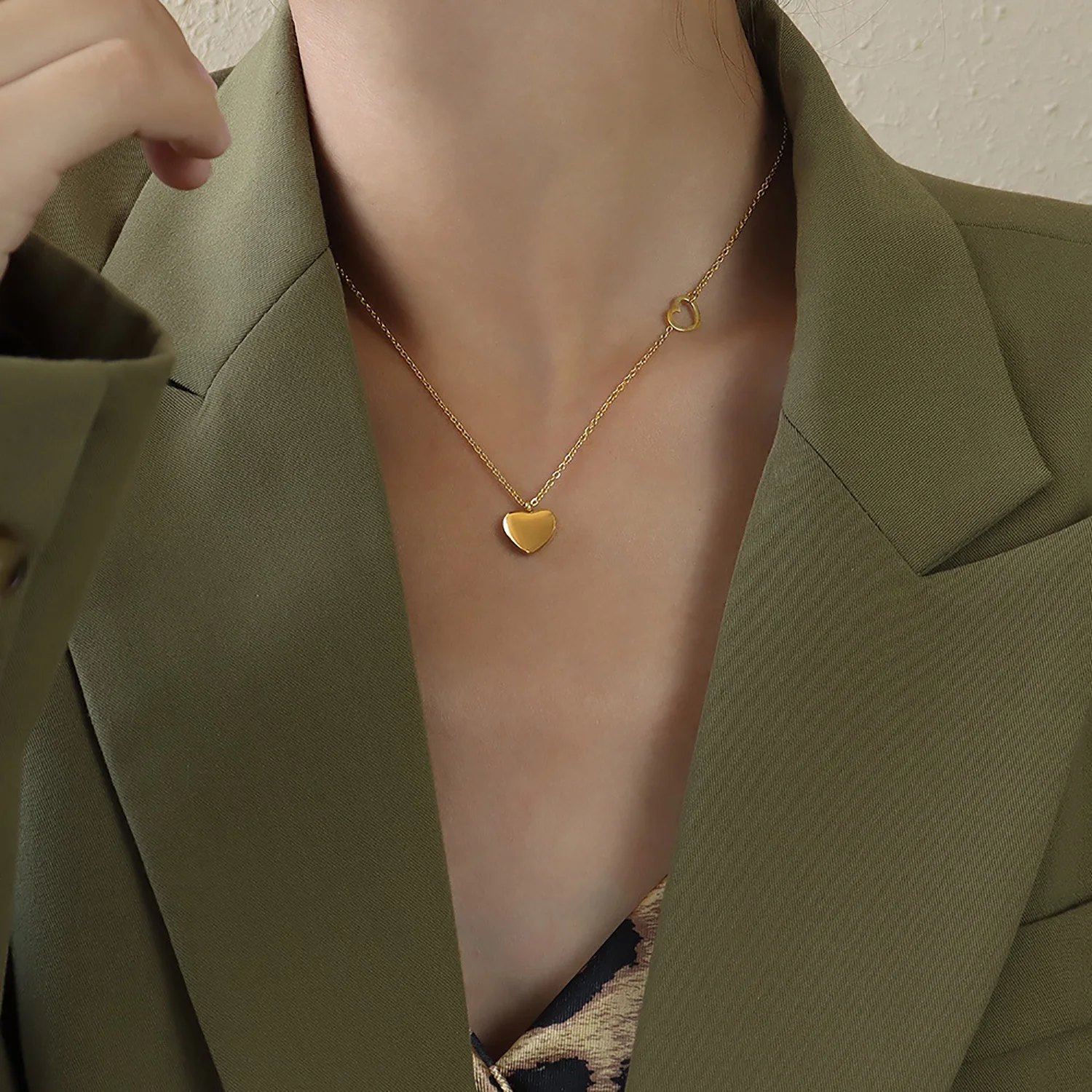 Elevate your style with this elegant stainless steel women’s necklace featuring a trendy double heart pendant. Measuring 391+54mm, the necklace showcases a polished, reflective large heart and a delicate open-heart outline, both coated with durable PVD gold for long-lasting color that resists fading and scratches. Weighing just 15 grams, it features a fine link chain designed for versatility and comfort, making it perfect for various occasions, from parties to everyday wear. The necklace is waterproof and free from nickel, lead, and cadmium, ensuring safe, long-term wear while adding a touch of timeless romance and sophistication to your look.