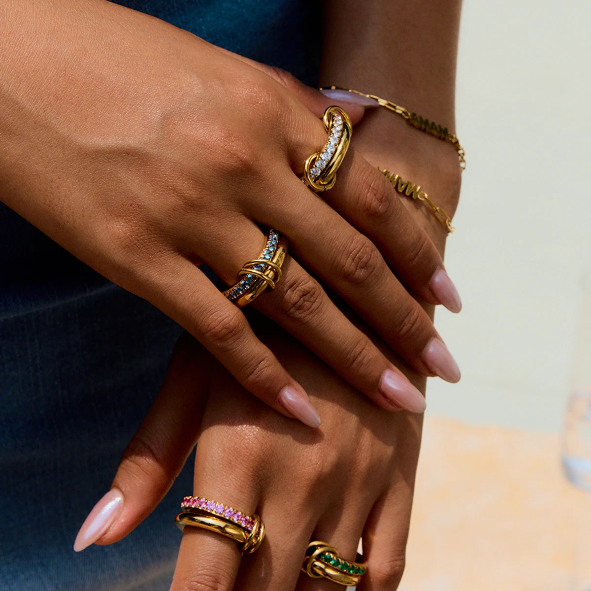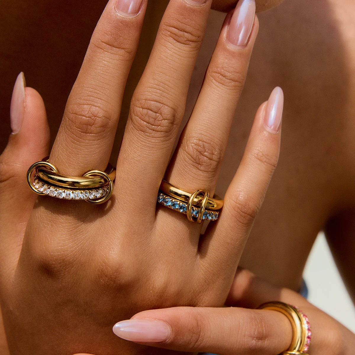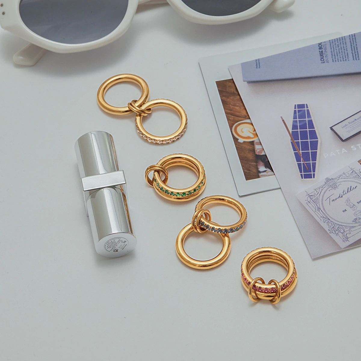 Enhance your style with this sophisticated double layer women's ring. Crafted from durable stainless steel with a luxurious gold finish, it features a sleek, round design measuring 54.4mm in diameter (size 7). The 2mm wide surface showcases tension-set zircon crystals in vibrant colors—clear, green, pink, and blue—adding a dazzling touch. Its modern, polished look is perfect for parties or everyday wear. The design is stackable and waterproof, ensuring versatile, long-lasting elegance. Whether dressing up for a special occasion or adding a fashionable touch to your daily outfits, this ring offers a perfect balance of style and durability. Its contemporary aesthetic makes it a must-have accessory to elevate any look effortlessly.