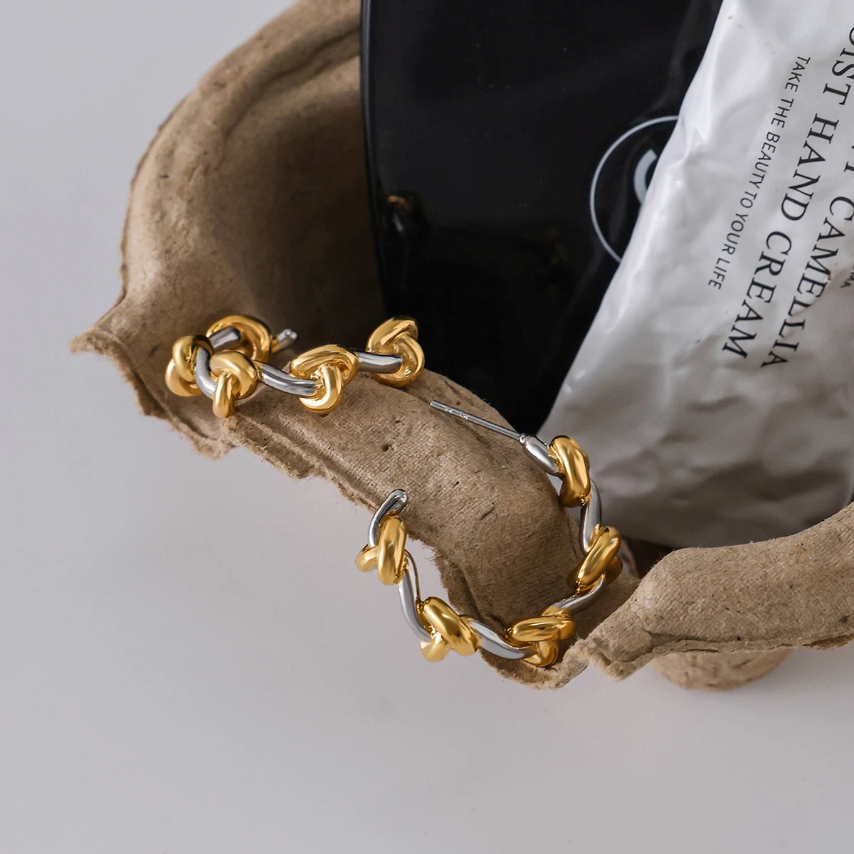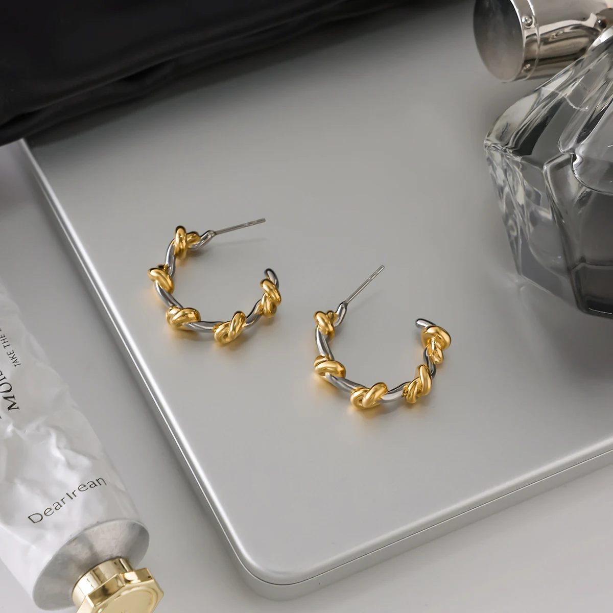 - Features a modern, irregular, intertwined knot design in a double-tone metallic finish of gold and silver hues.